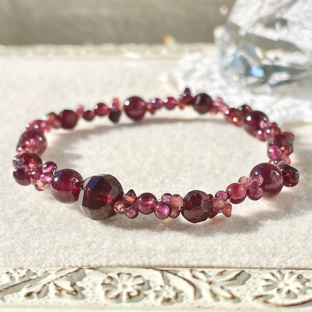 【こちらはご成約いたしましたc】 赤系のガーネットだけを使ってお仕立てしたブレスレットです。 ガーネットの色幅を活かせるよう、黒みのある落ち着いた赤で全体を構成し、明るめの色合いの小さな石たちで繋げています。 また、つるんとした丸玉とカット入りの石を取り混ぜて使い、形状に変化をつけて表情を豊かにしています。 kochi=東風(こち)は春の季語です。 デザインのヒントを下さった方にちなみ感謝を込めて名付けたシリーズ名で、季節問わず使わせていただいております。 こちらのデザインは0.4mmの細い透明ゴム1本を4重になるようにお仕立てしてありますので、繊細でありながらもしっかりとした作りになっています。 ~サイズ調整について~ こちらのデザインについては調整が大変なもんで、今のところワンサイズです。 ご希望の方には、在庫の石を使って同じ感じで違うサイズをお仕立てしてみます。 ◆サイズ:内周 約16.0cm 重さ:約9.1g (画像のトルソーの手首回りは16cmです) ◆アンタロンゴム(ポリウレタン100%)0.4mmを4本どり ◆使用石 ◇ガーネット ラウンドカット8、5mm 〃 3mm(レッドガーネット) 〃 2.5mm(シャンパンガーネット/タンザニア産) ラウンド6、4、3、2mm チップ(さざれ) ◆ゴムブレスについて こちらは、透明でつるんとしたアンタロンゴム(0.4mm)を4本どりにした肌になじみやすいデザインで、通常のゴムブレスと比べてやや伸縮しにくい仕上がりになっています。 実寸+0.5~1cm位(手首との間に指が1本入る位)が、適度なフィット感のあるブレスレットの目安です。 ◆天然石について 色や形、内包物(インクルージョン)、ひび(クラック)、光り方(例:シラー効果)など石由来のもの、カットや穴の位置によってそれぞれ表情が違います。原石由来のキズ、なかにはカット時の機械によるキズのあるものもございます(画像をご参照下さい)。その点ご留意下さいますよう願います。 ◆お手入れについて できましたら、柔らかい布で汗や汚れを拭き、日に当たらないところで保管なさると劣化を遅らせられるので、石も喜んでくれると思います。 ◆お直しについて お買い上げのお品につきましては、ゴム交換・石洗浄、パーツ交換等のお直しを承っております(往復送料+実費)。期限は設けておりません。状態によってはご希望に添えない事もございますので、まずはご相談いただければと思います。末永くお使い頂けたら嬉しいです。 ご参考までに石のご紹介を。 パワーストーンについてはそれぞれの解釈があると思います。これは作品の意図をお伝えする為と、より石に親しみを持ってもらえたら嬉しいので掲載しています。 [ガーネット;Garnet] 和名は柘榴石(ざくろいし) キーワードは生命力、愛、信頼 1月の誕生石。 ガーネットは16種類からなるグループの総称です。 (レッドガーネット) 赤い色は血液を連想させます。血は「生」の象徴でもある事から、古くから命を守るお守りとされてきました。また、肉体と精神の両方のエネルギーを活性化させる事から、明るい気持ちで前へ進む手助けをしてくれるそうです。愛と信頼を意味することから、友情の証として、また恋人同士の「一途な愛」の形として身につけたり石を贈り合う習慣があるそうです。