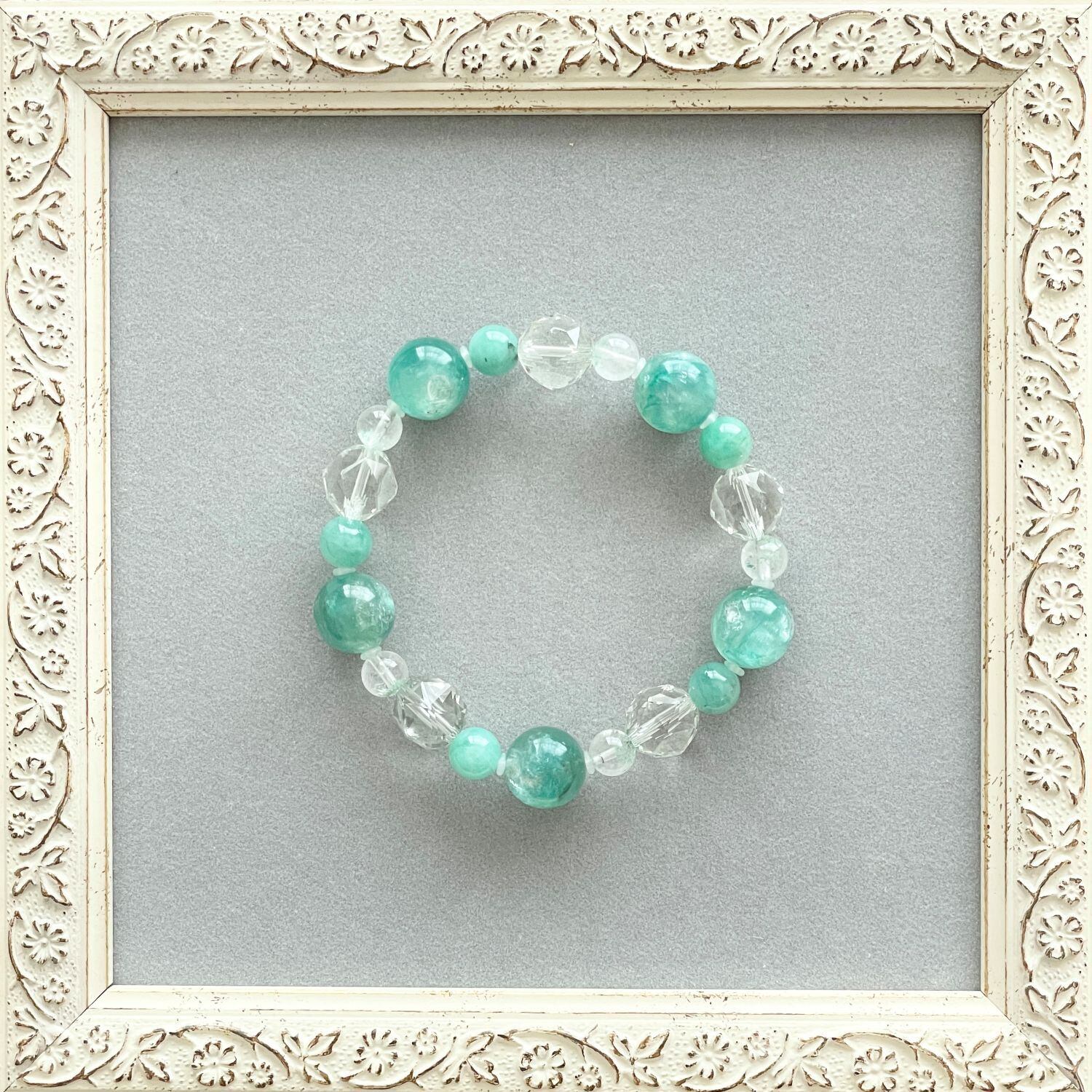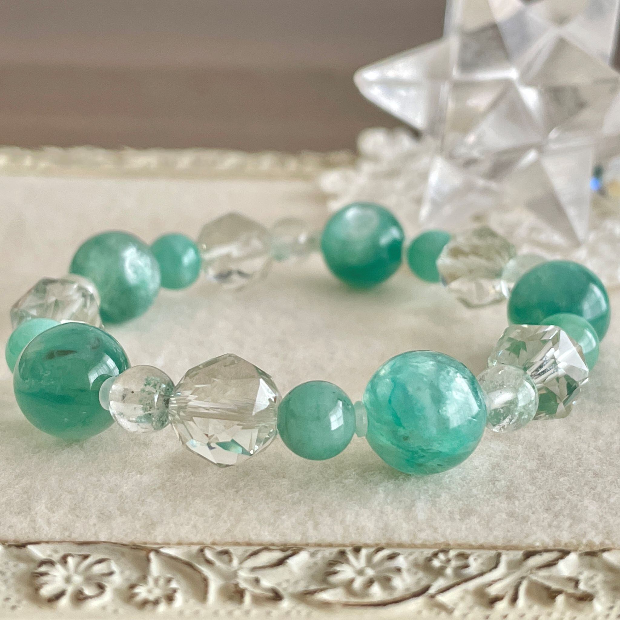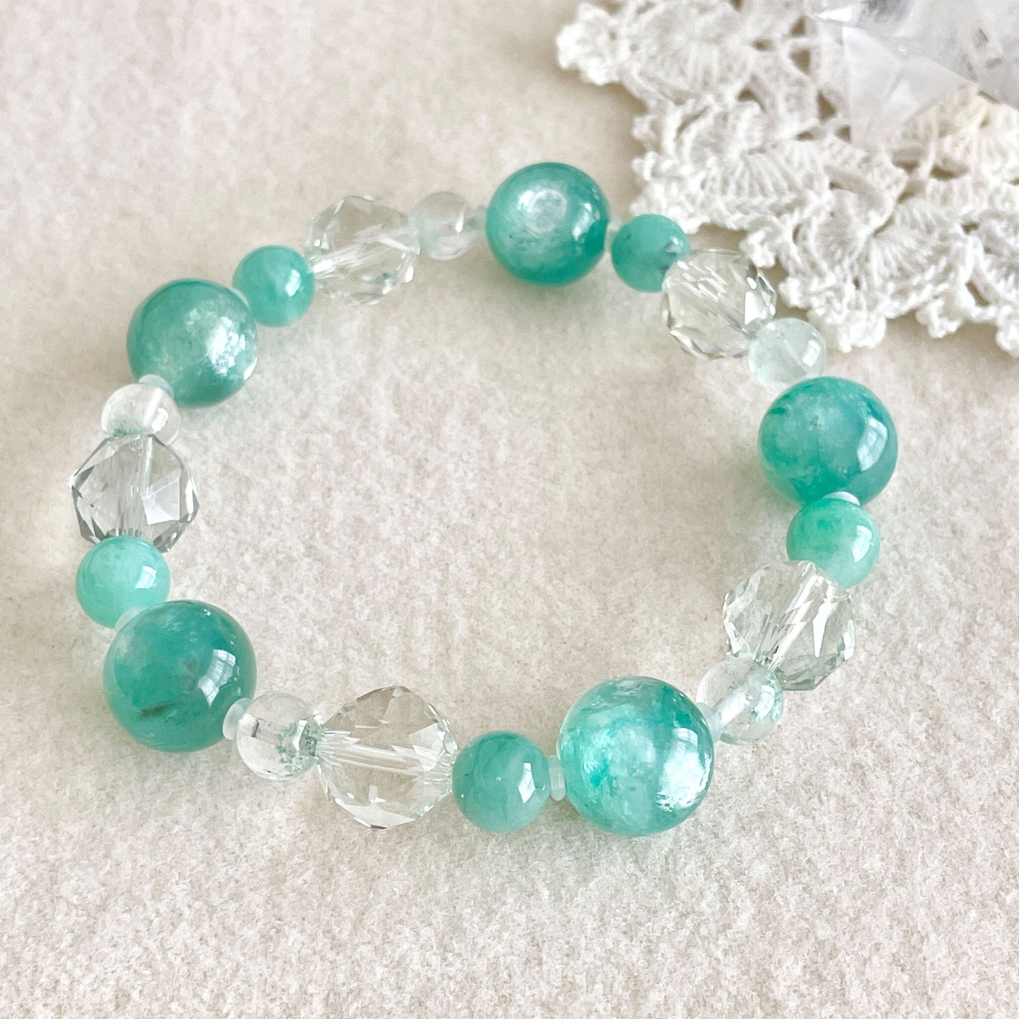 6mm玉のグリーンファントムクォーツは、透明なクォーツが抜け感を出してくれています。