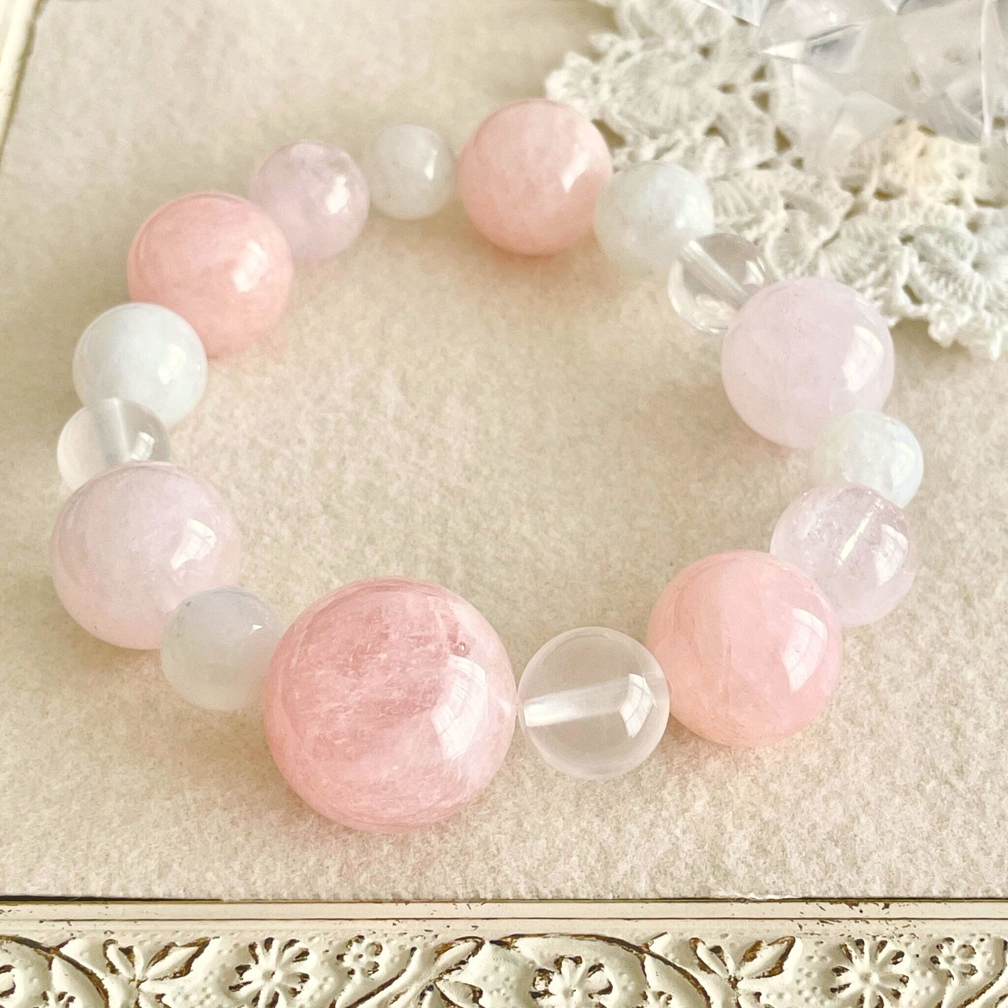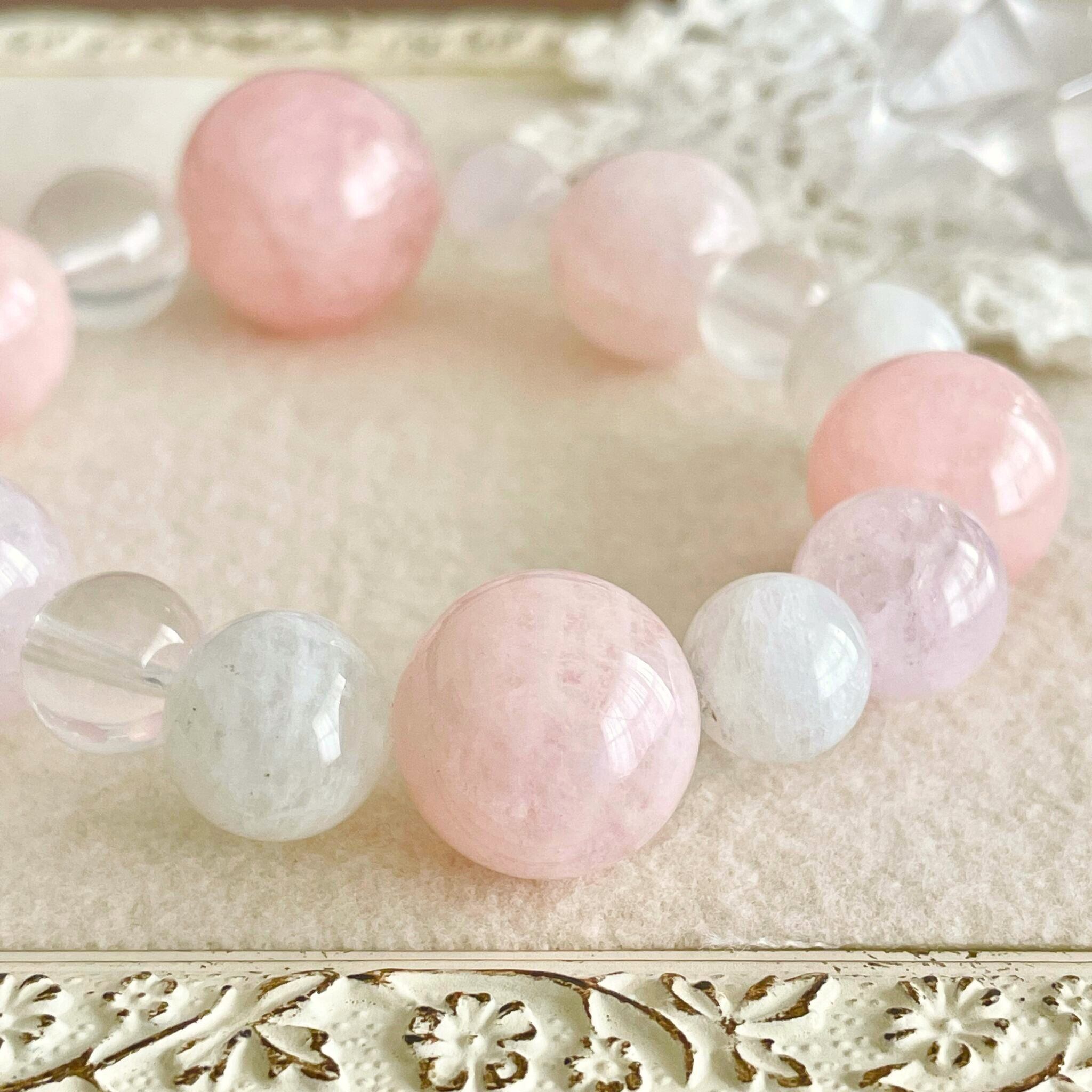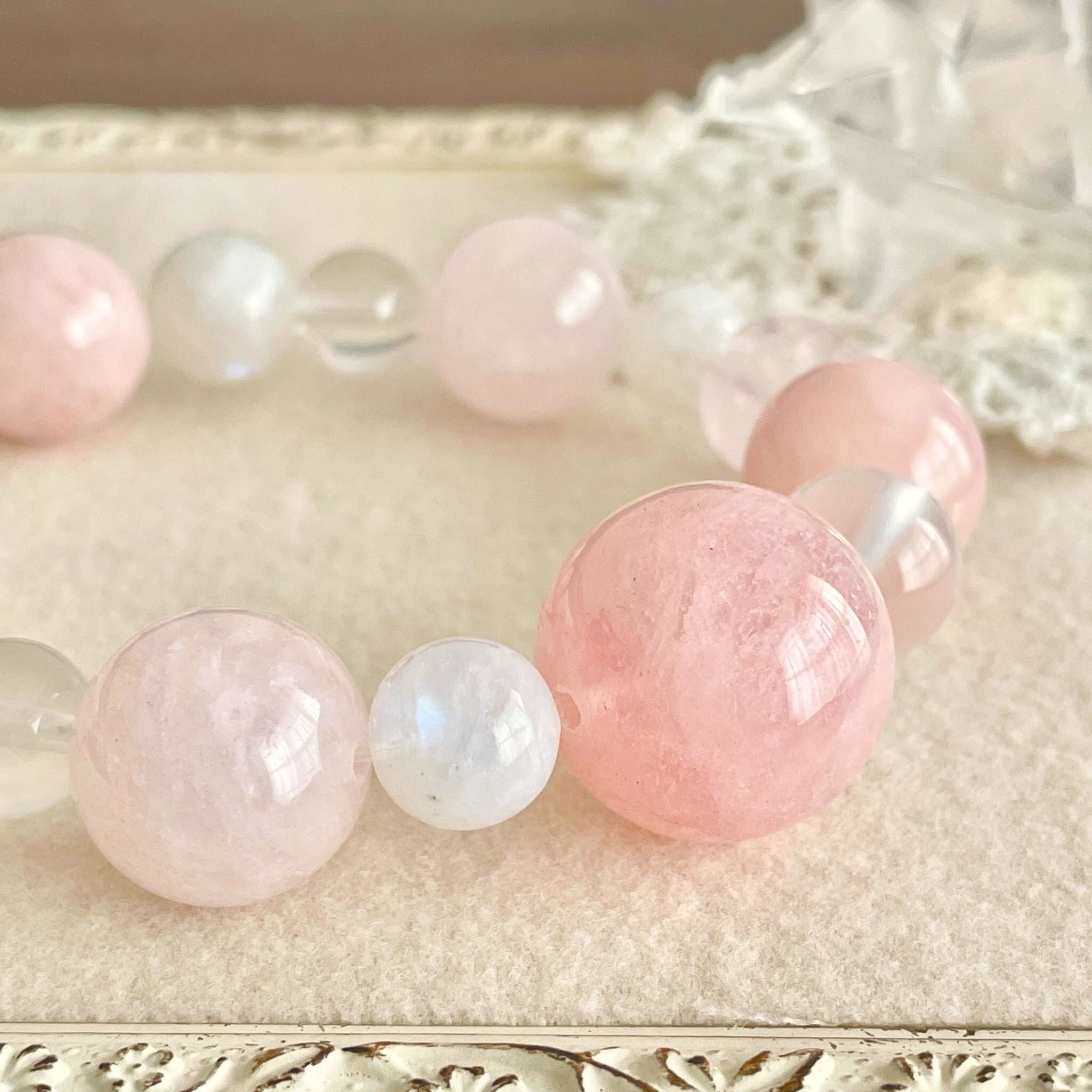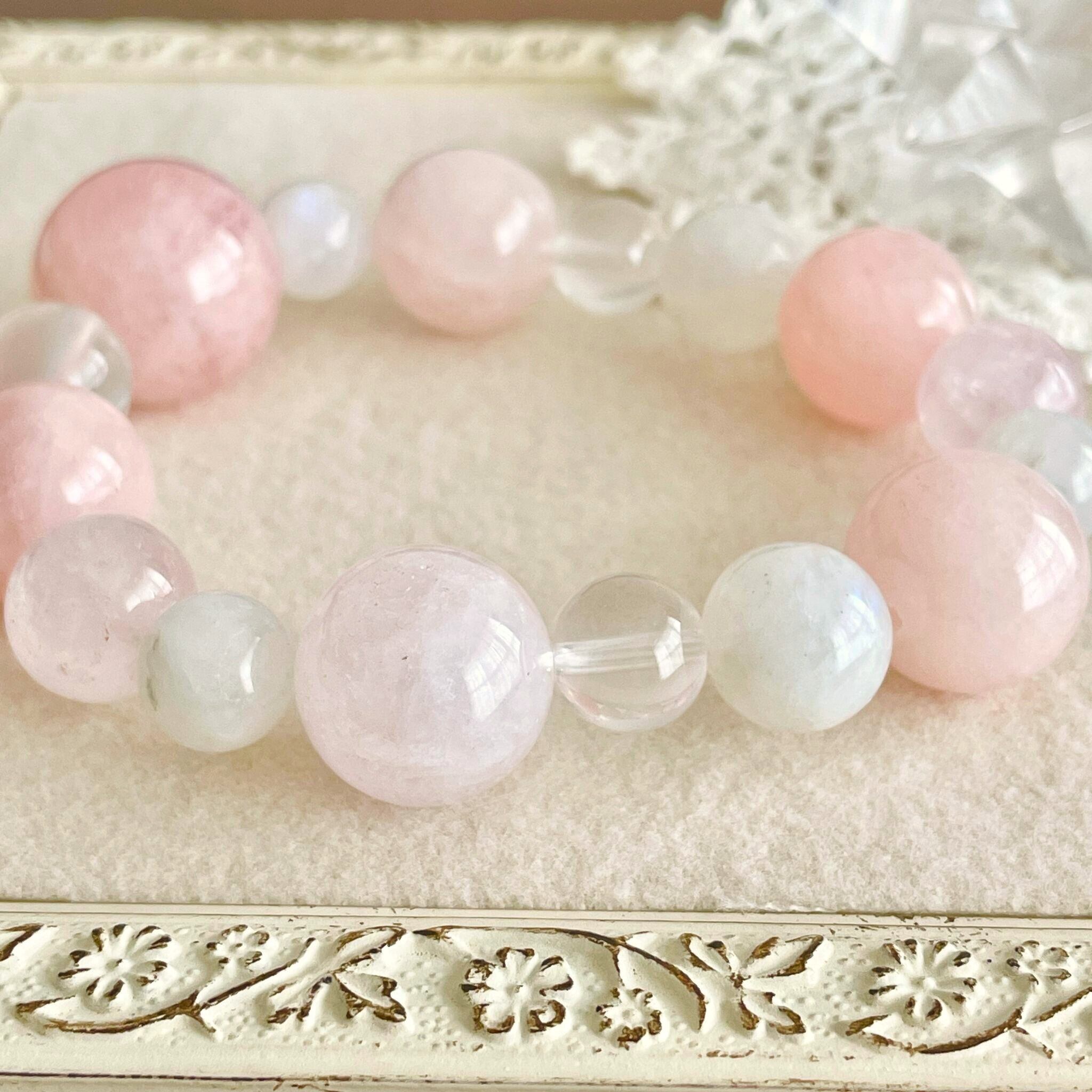ronde 大玉のモルガナイト+レインボームーンストーン+ミルキークォーツのブレスレット mor-b-2505-05
