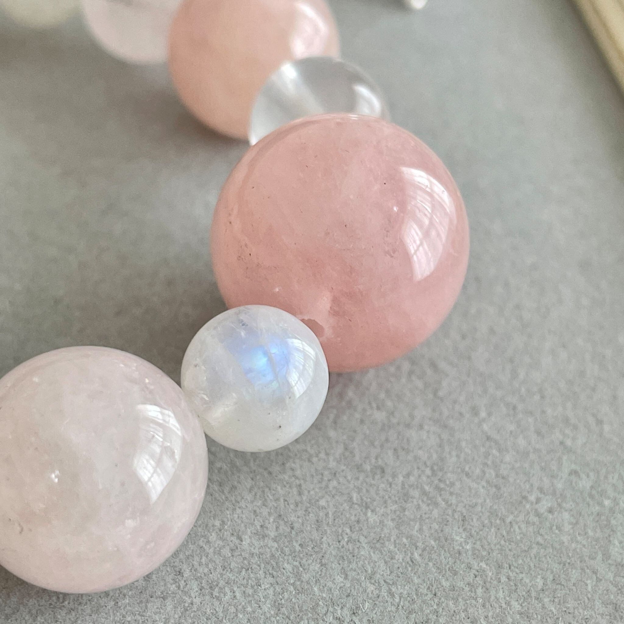 月をイメージさせる優しく静かな佇まいから母性の象徴と言われています。クォーツのしっかりとした面も持ち合わせているので、他の石と合わせても邪魔せず下支えするような、そんな心強い感じがします。