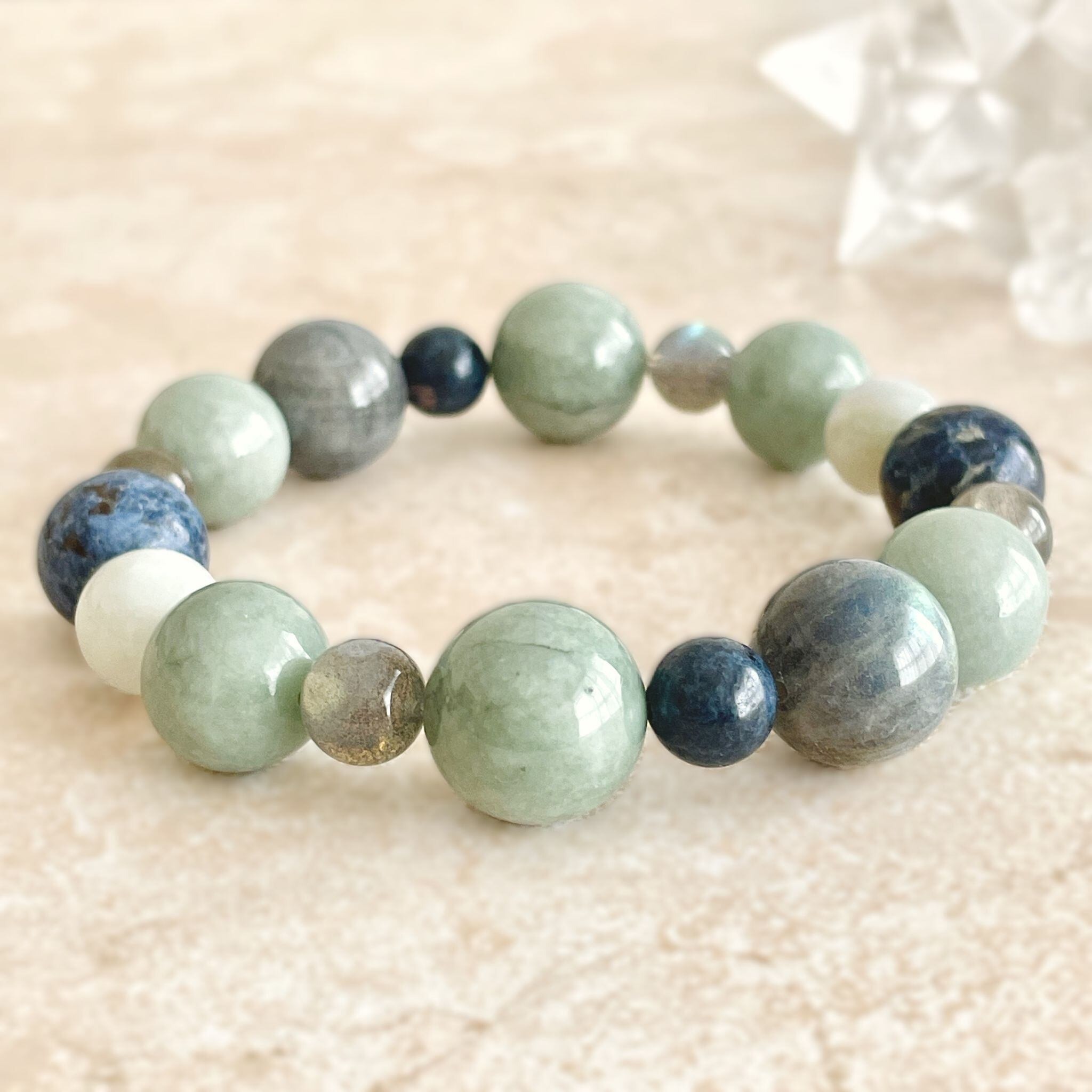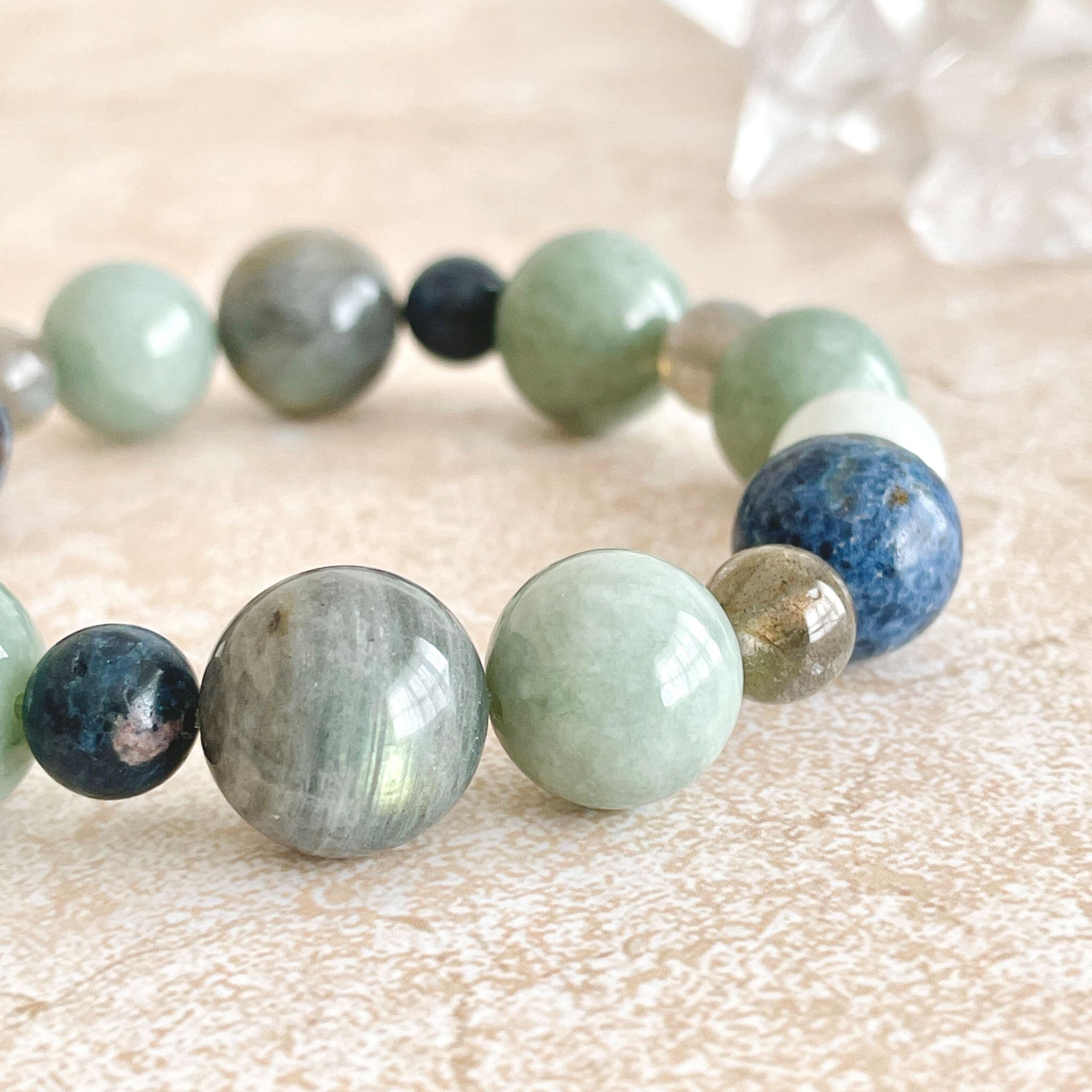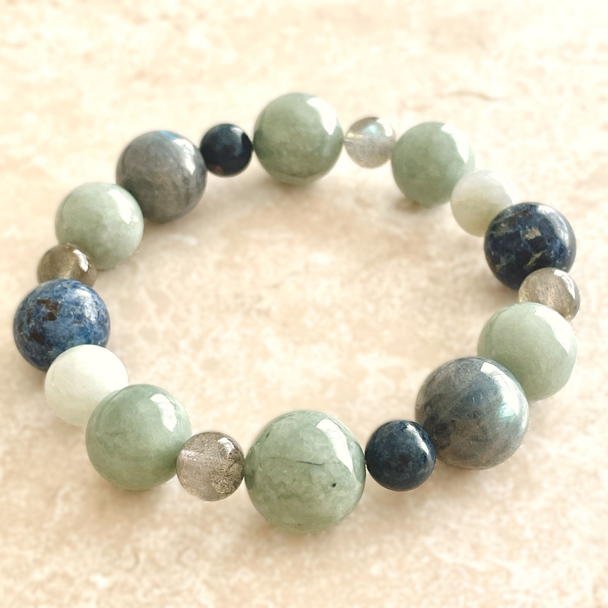 ronde ジェダイト(翡翠)+ラブラドライト+ブルースピネルのブレスレット jad-b-2508-04