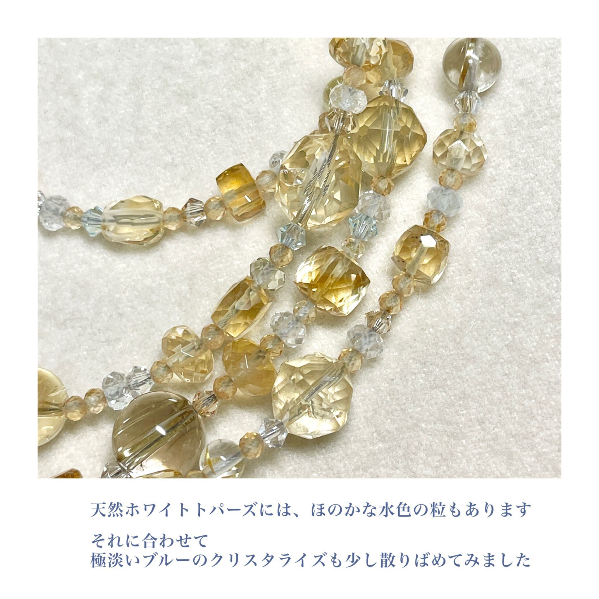 その中で、天然ホワイトトパーズにかすかに感じられる淡い水色を差し色としてガラスビーズ(スワロフスキー(R)・クリスタル)を使って散りばめています。