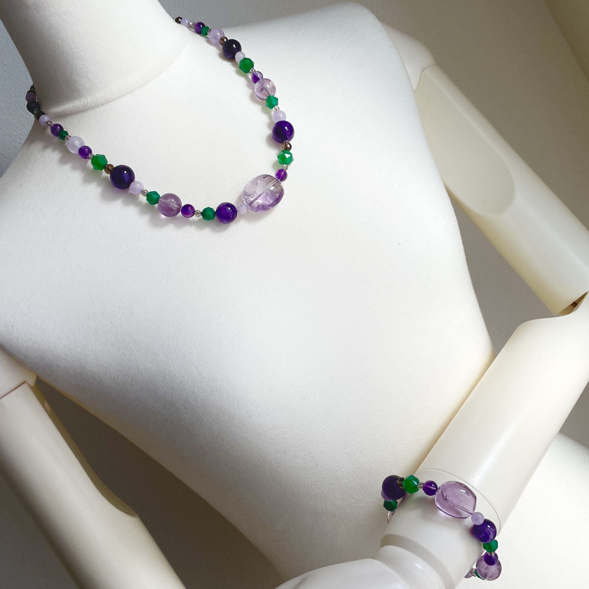 アメシストは、深い紫~ライトカラー~ラベンダーアメシストで色の幅を出しています。またバイカラーやストライプのアメシストを入れることで表情が豊かになりました。