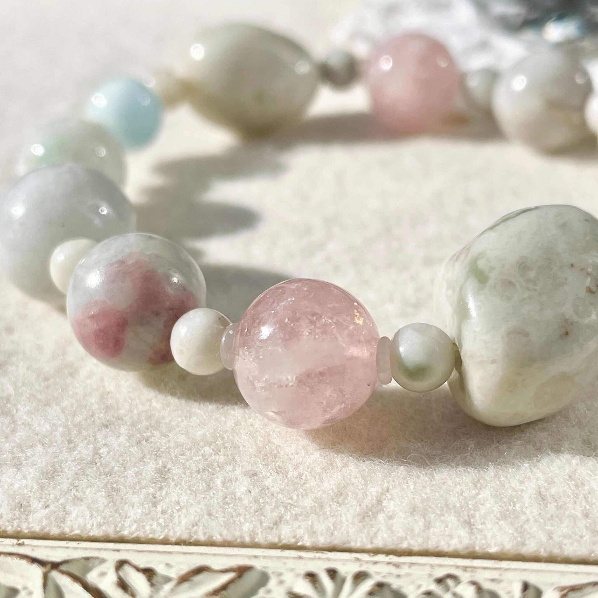 石の意味としては、固定観念やストレスなどの圧力からの解放というニュアンスを持ち、緑色の石の癒しの効果を重ね持つと思われます。