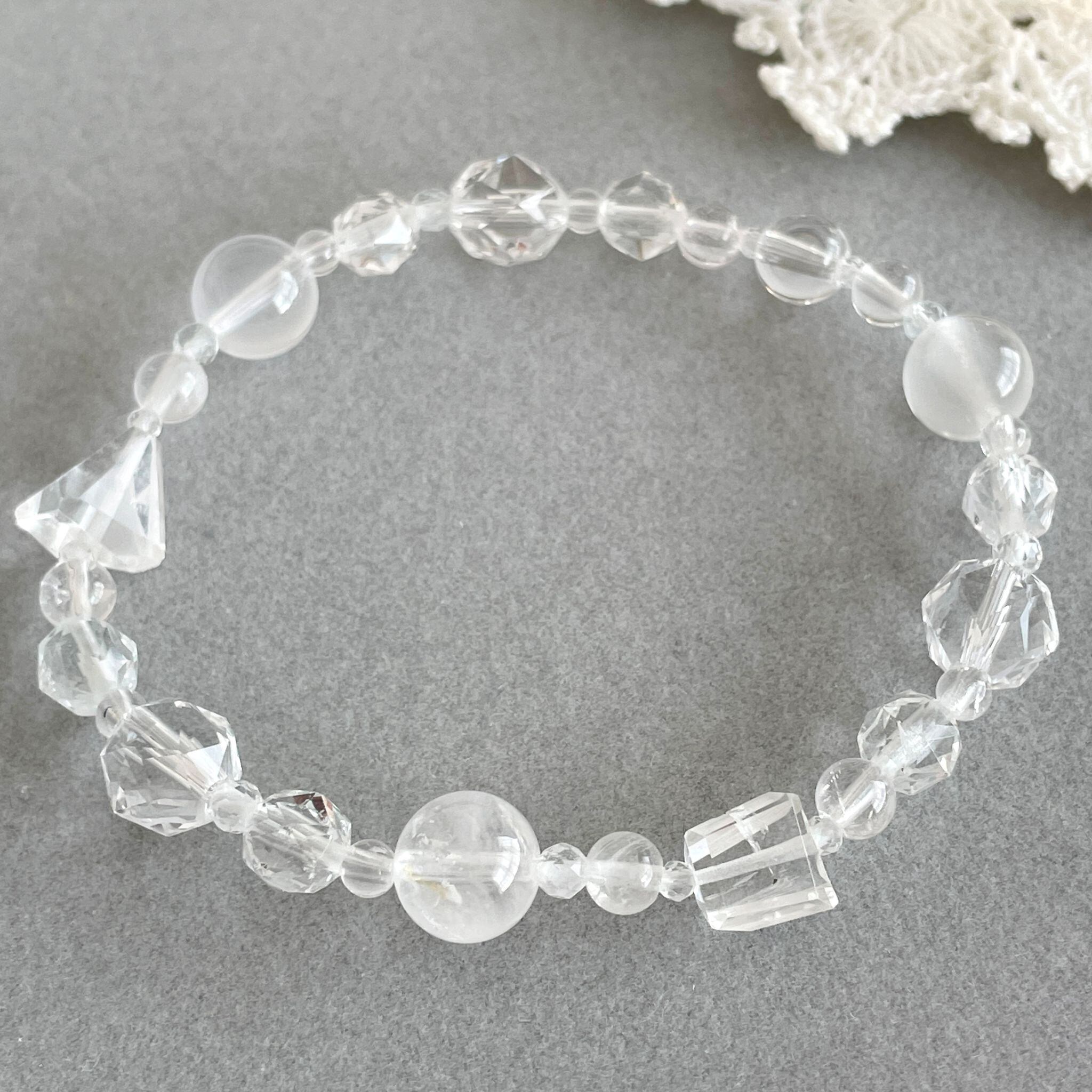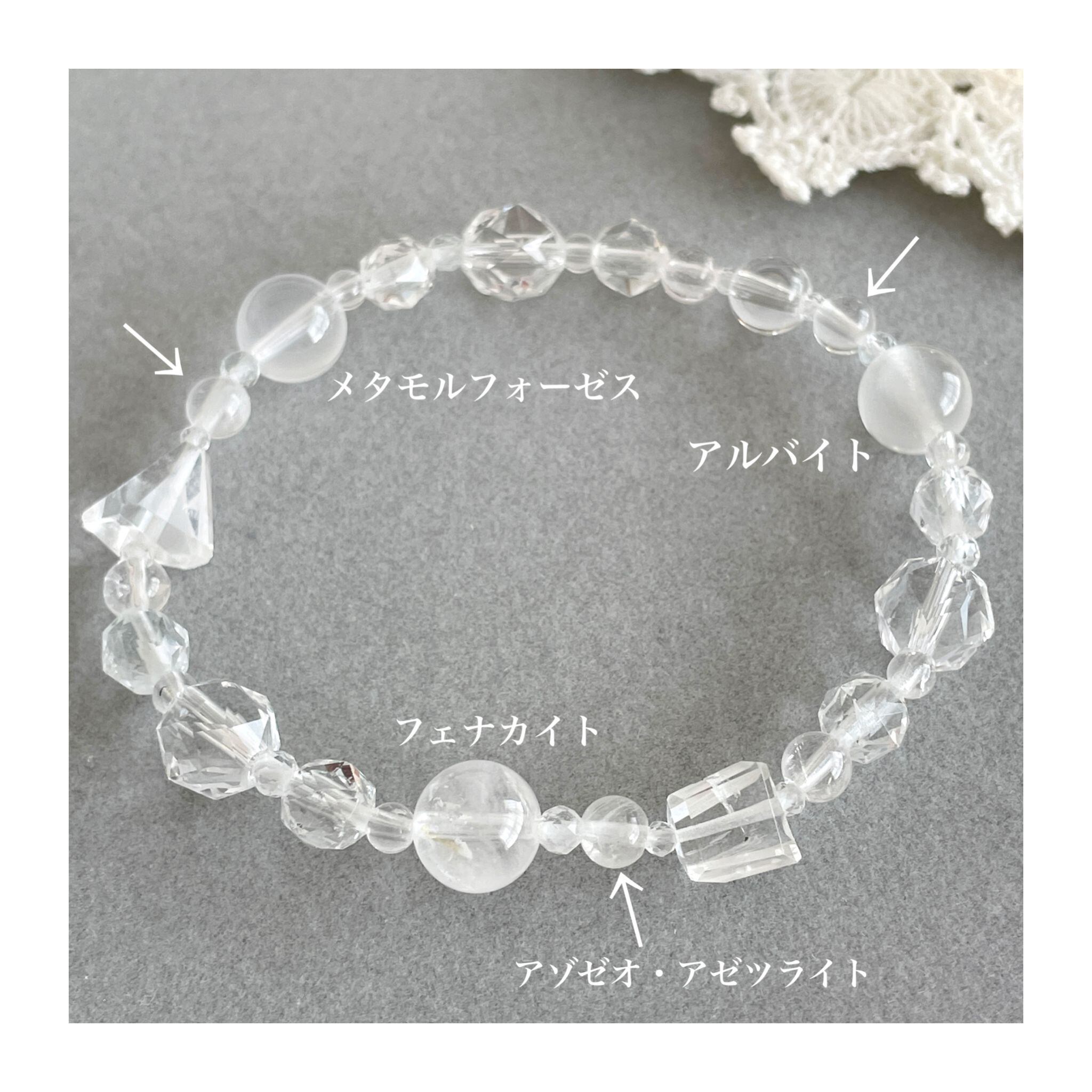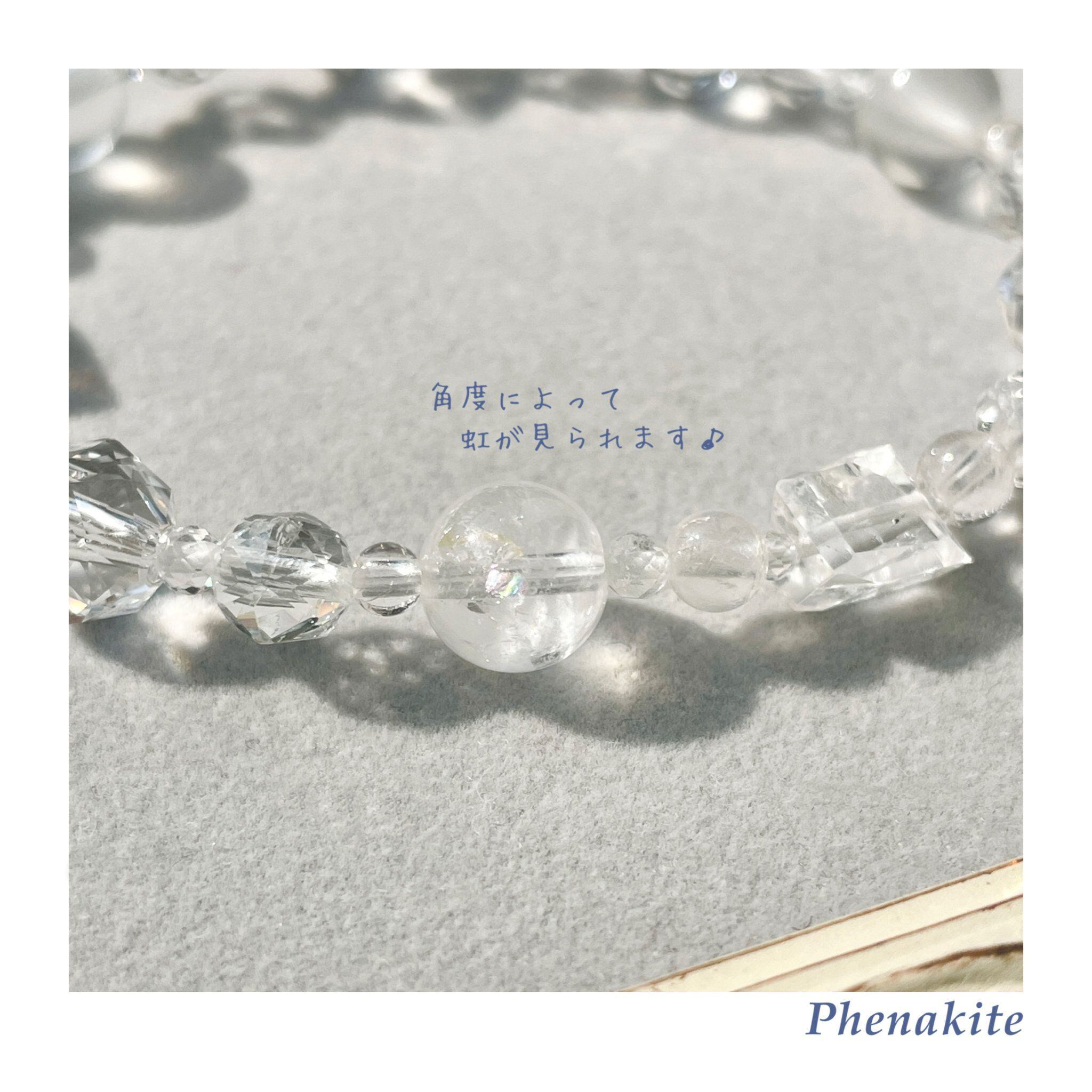 フェナカイトをはじめ、透明感のあるハイパワーな石を8種類使って構成したブレスレットです。