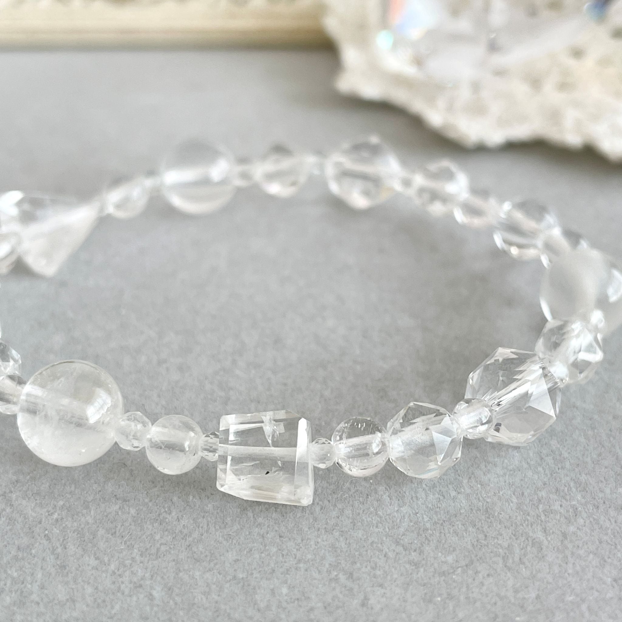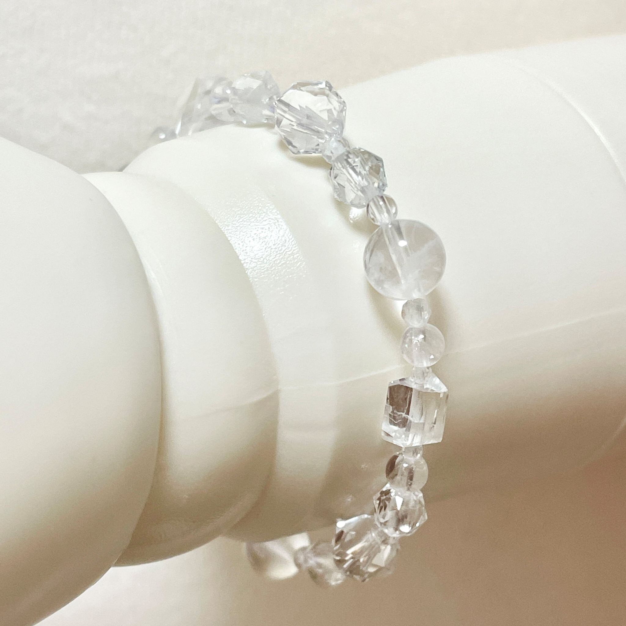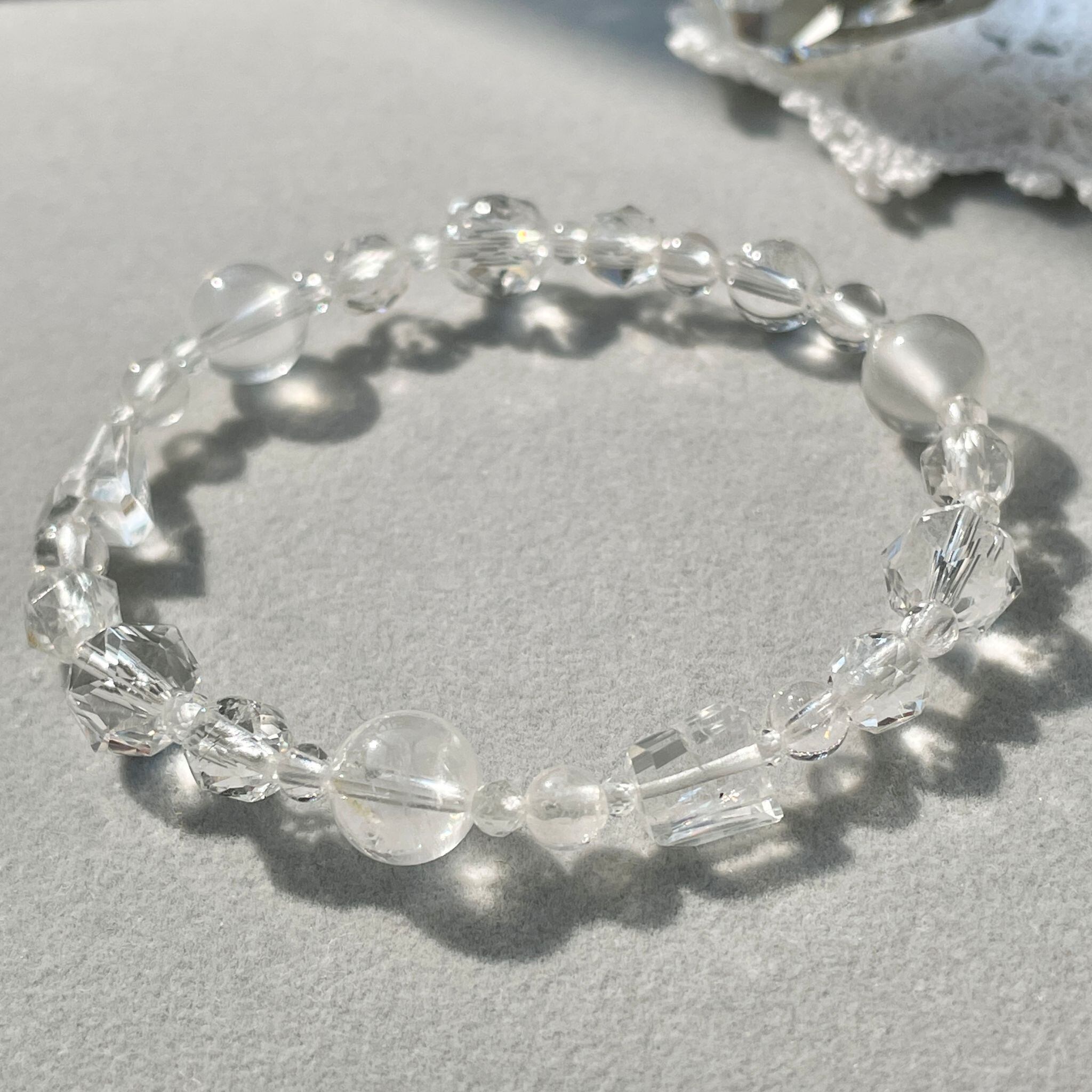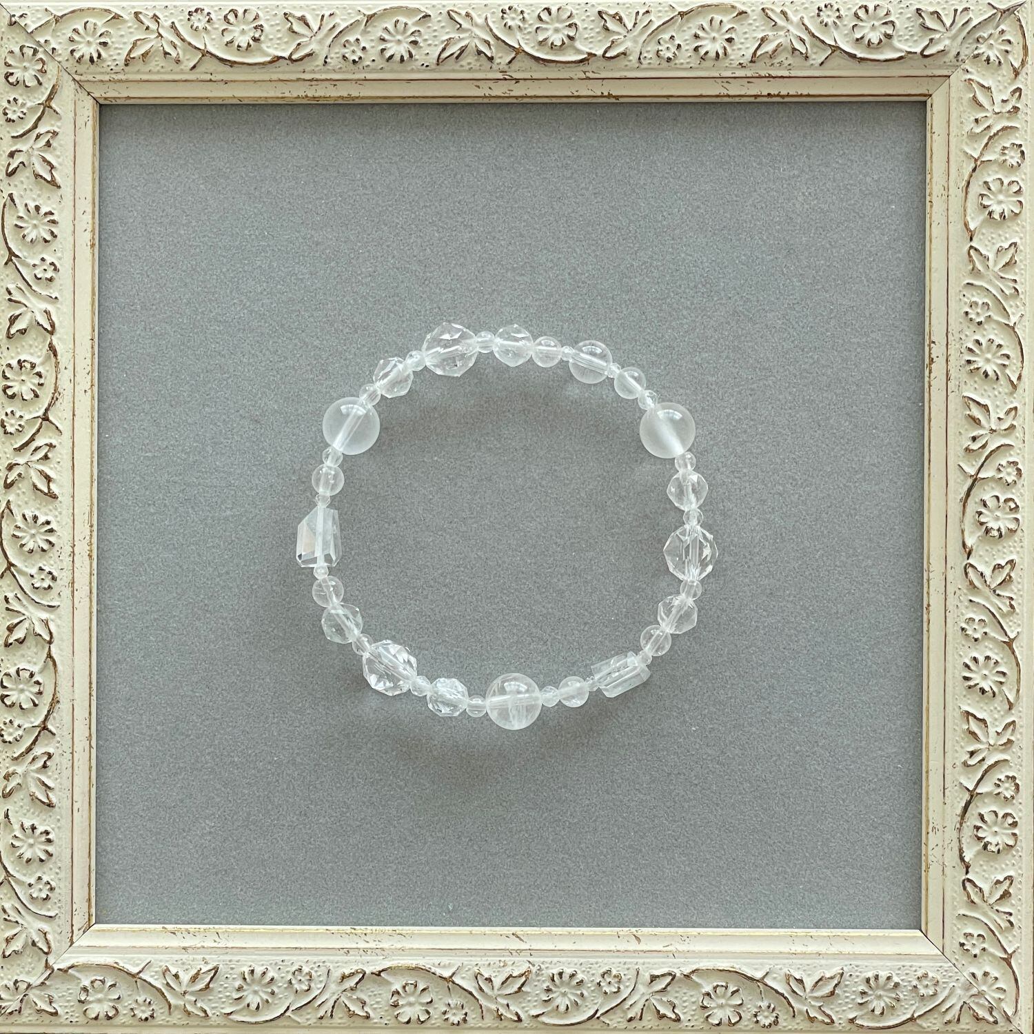 フェナカイトをはじめ、透明感のあるハイパワーな石を8種類使って構成したブレスレットです。