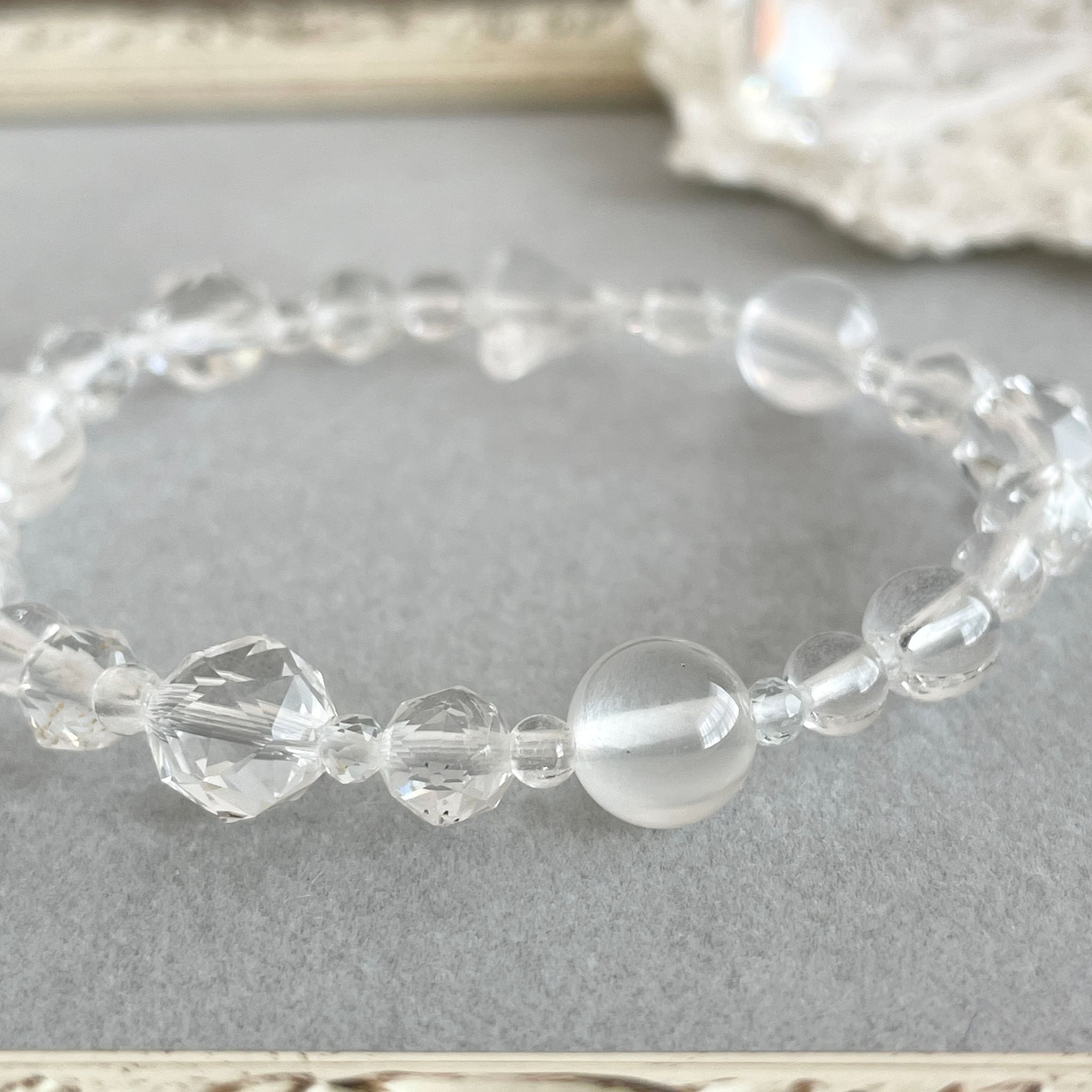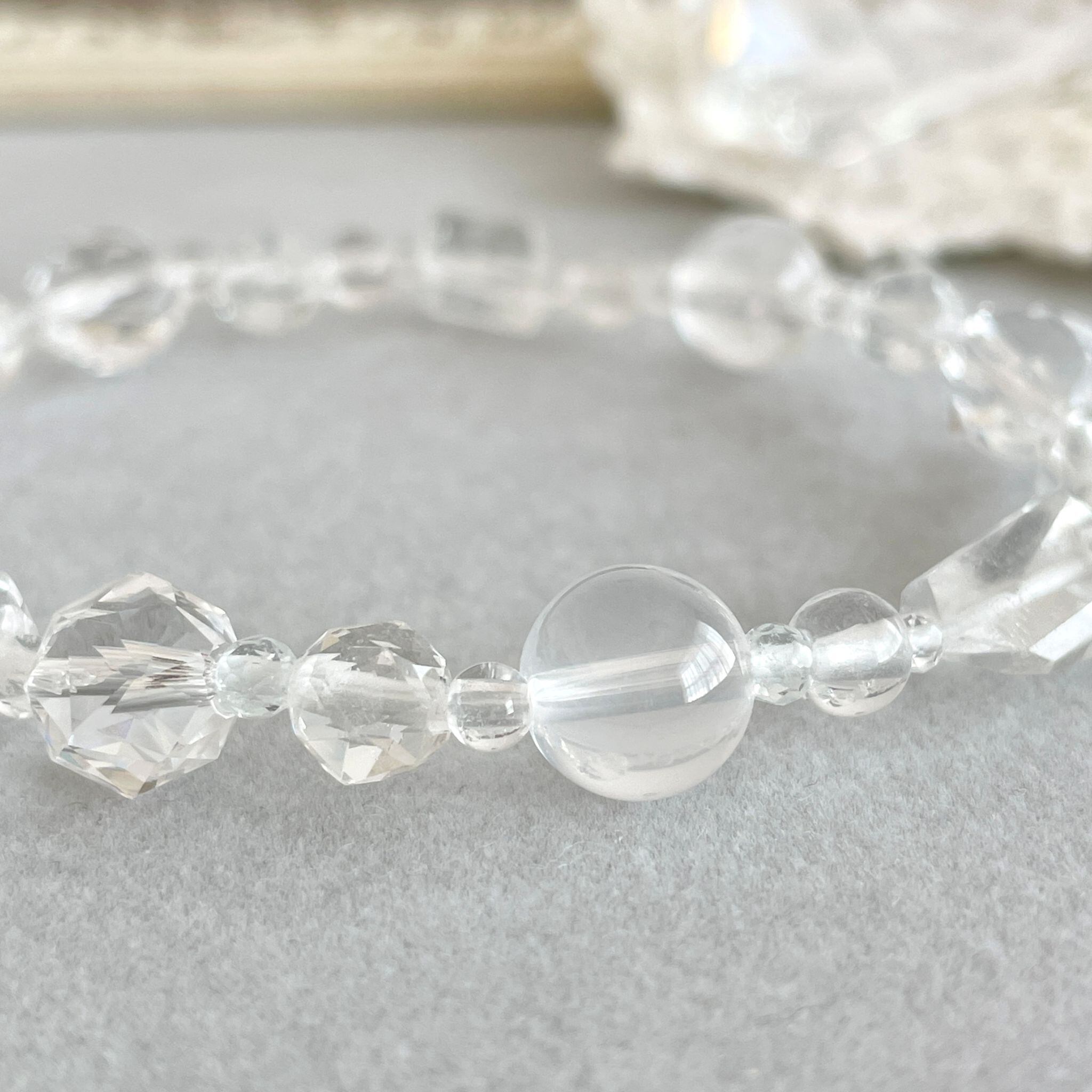 水晶はクセがなく浄化作用が強力な石で、カットや内包物、コーティングによってその特性が変わると言われています。他の石からの影響を受ける事がなく、水晶を使って他の石を浄化する事もできます。