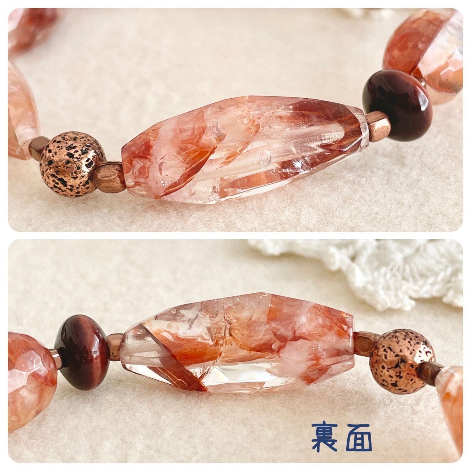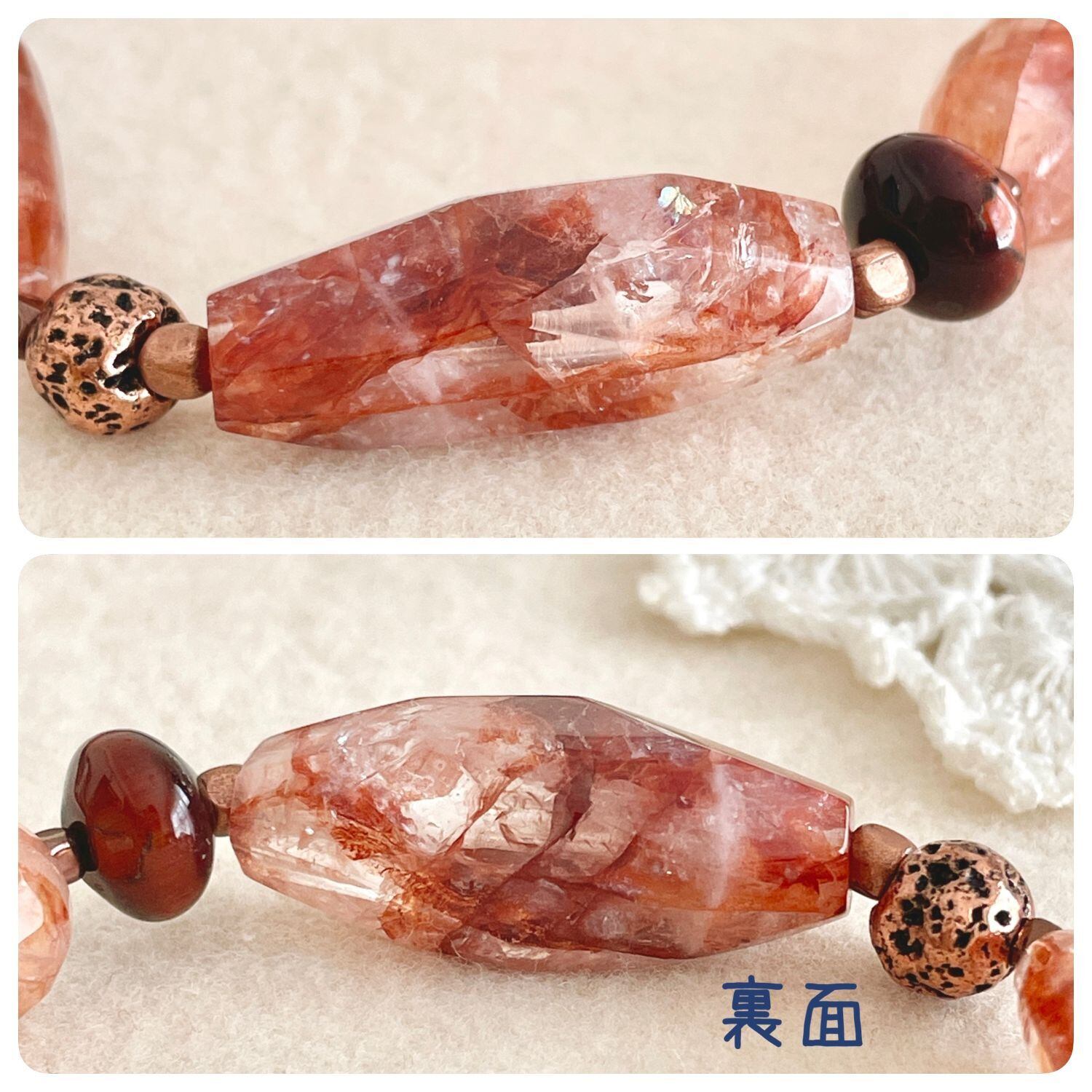 色や形、内包物(インクルージョン)、ひび(クラック)、光り方(例:シラー効果)など石由来のもの、カットや穴の位置によってそれぞれ表情が違います。なかにはカット時の機械によるキズのあるものもございます。その点ご留意下さいますよう願います。