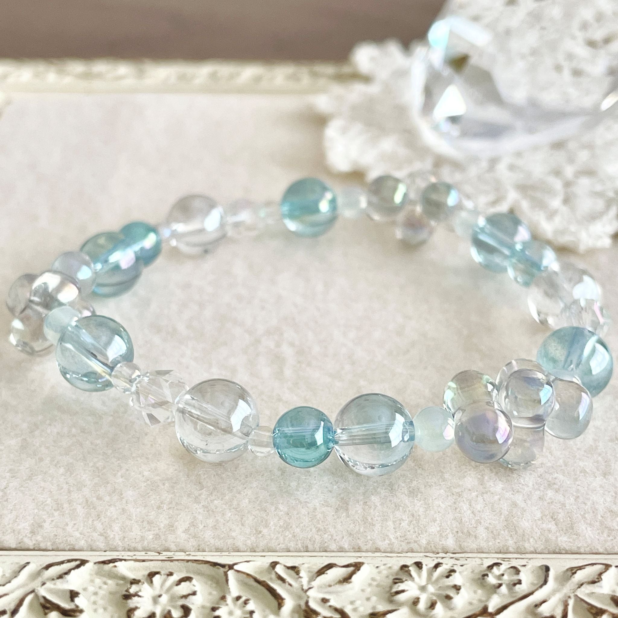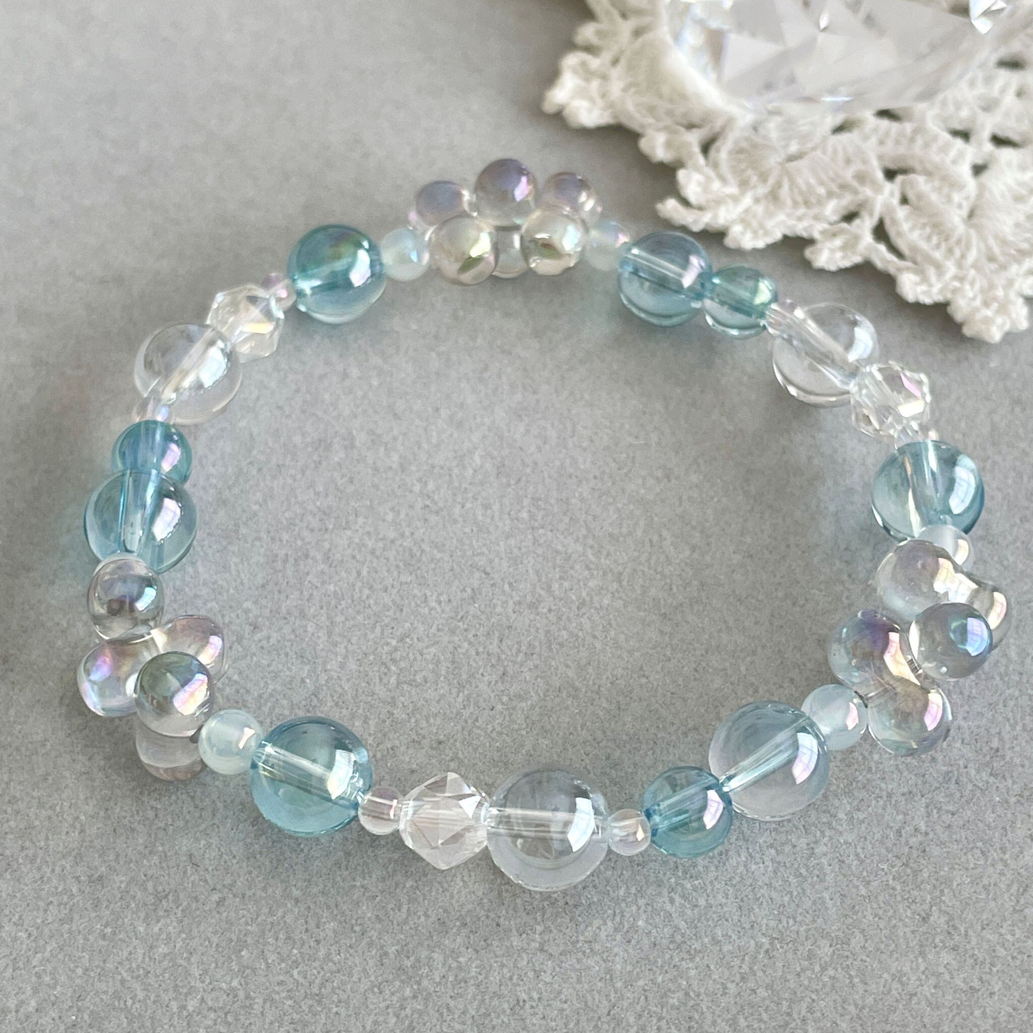 カットのきれいなアクアクリスタルや、淡いパステルブルーカラーのカルセドニー4mm玉などもアクセントにしながら全体をまとめました。