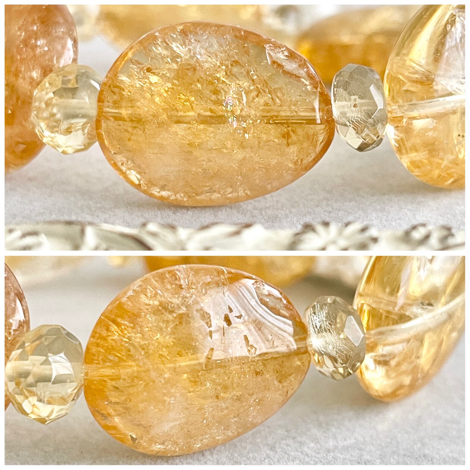 一見、黄色一色に見えますが、光によって透明なところが見えたり、虹が見えたりします。そして、天然のクラックが入っていることでより様々な表情を見せてくれています。