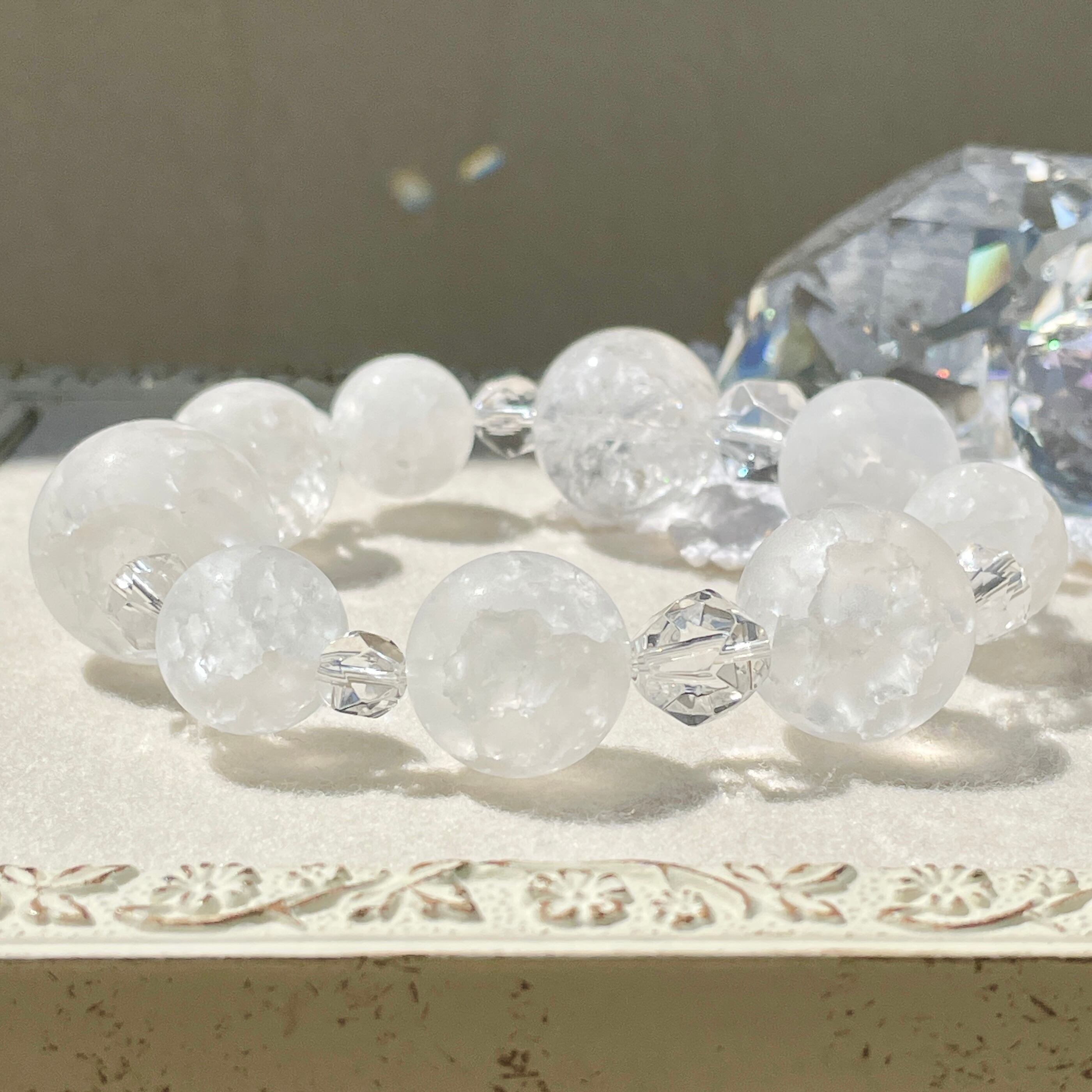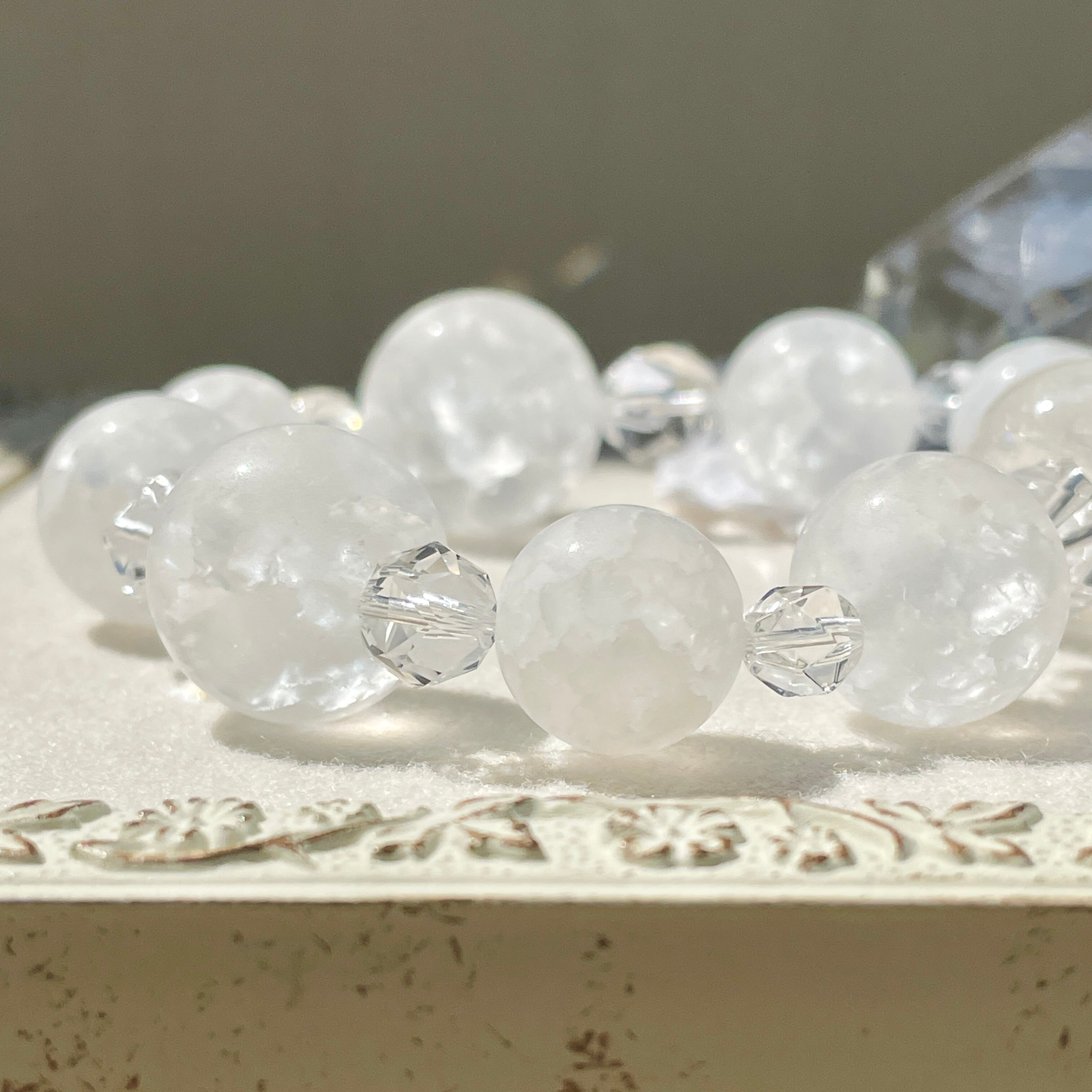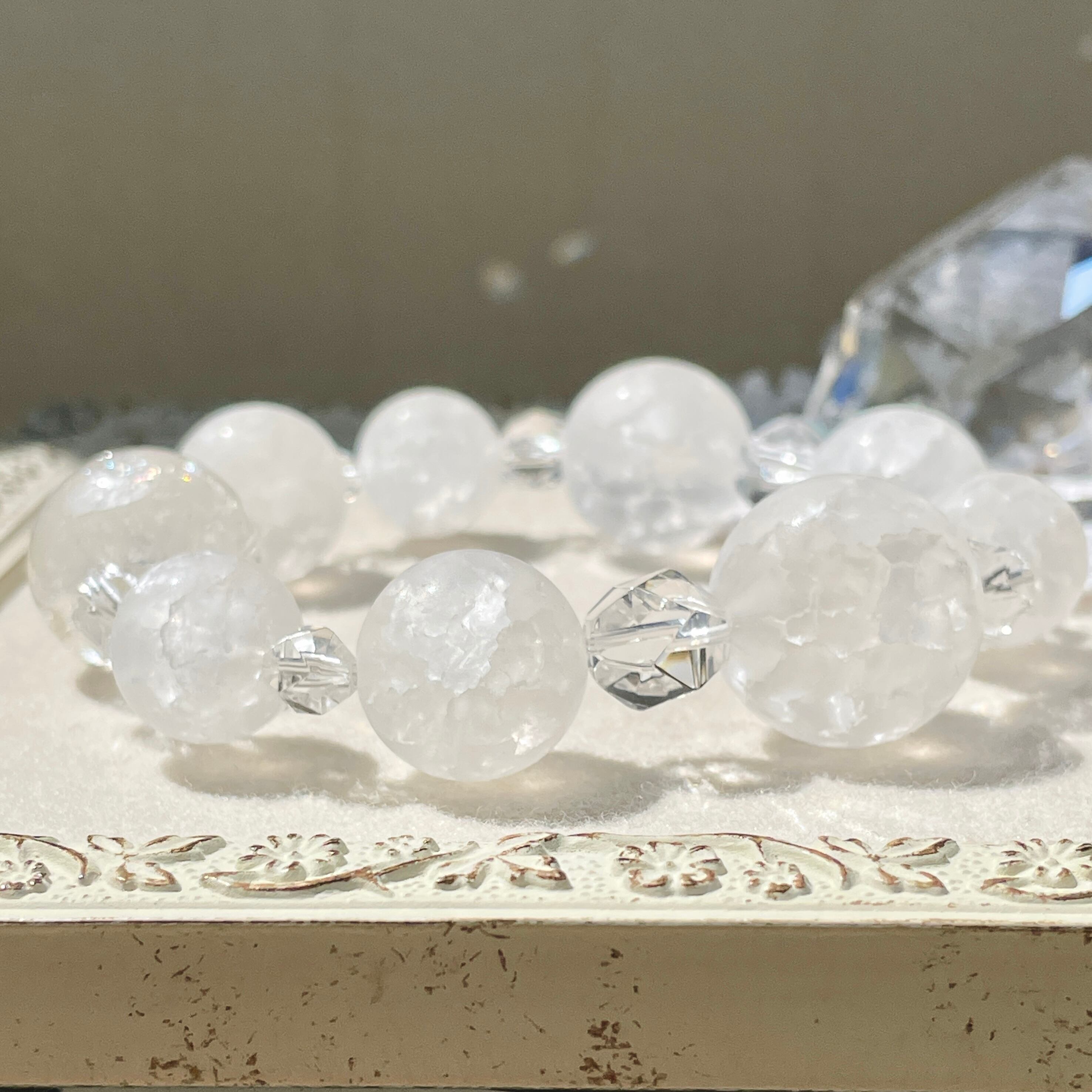白っぽい14~20mmのクリスタル(天然水晶)の大きな丸玉は、表面のフロスト加工に加え、ザクザクとした印象の人工クラックが入っています。雪や氷を思わせる見た目から「スノーフレーククリスタル」とも呼ばれています。