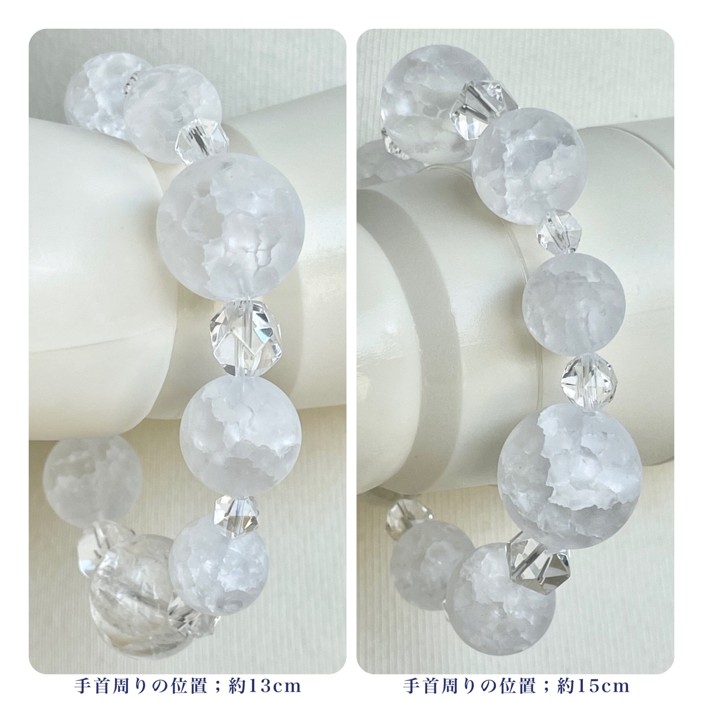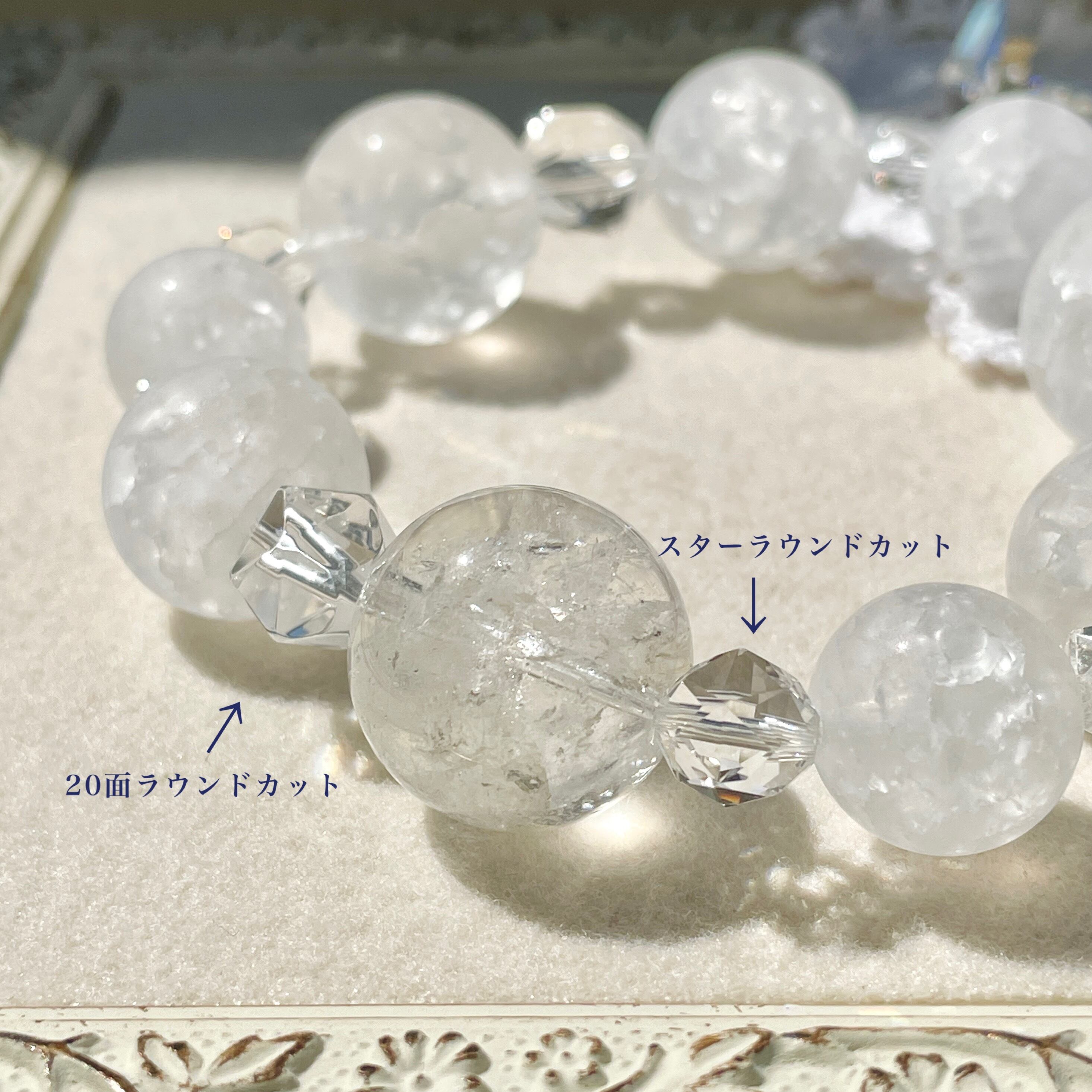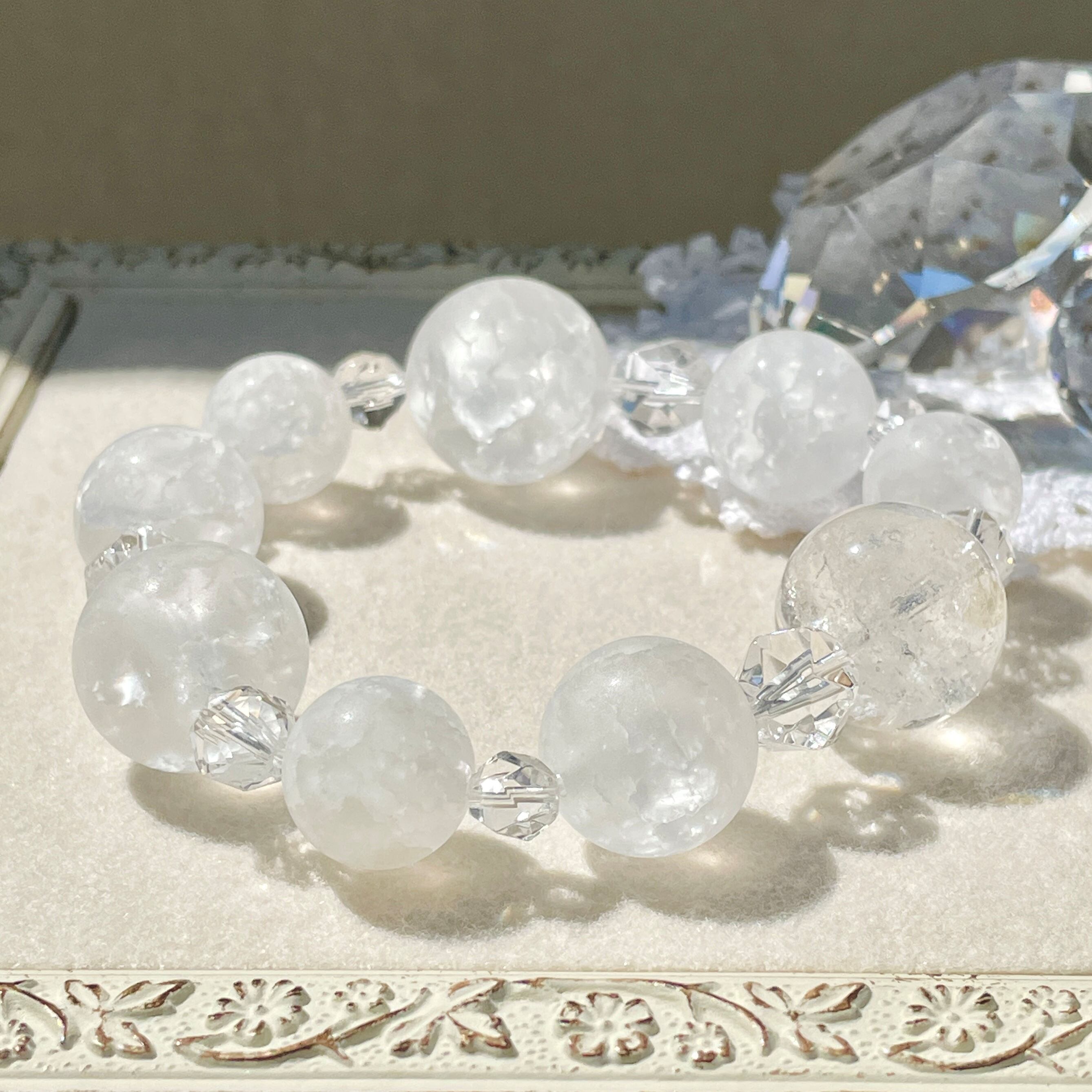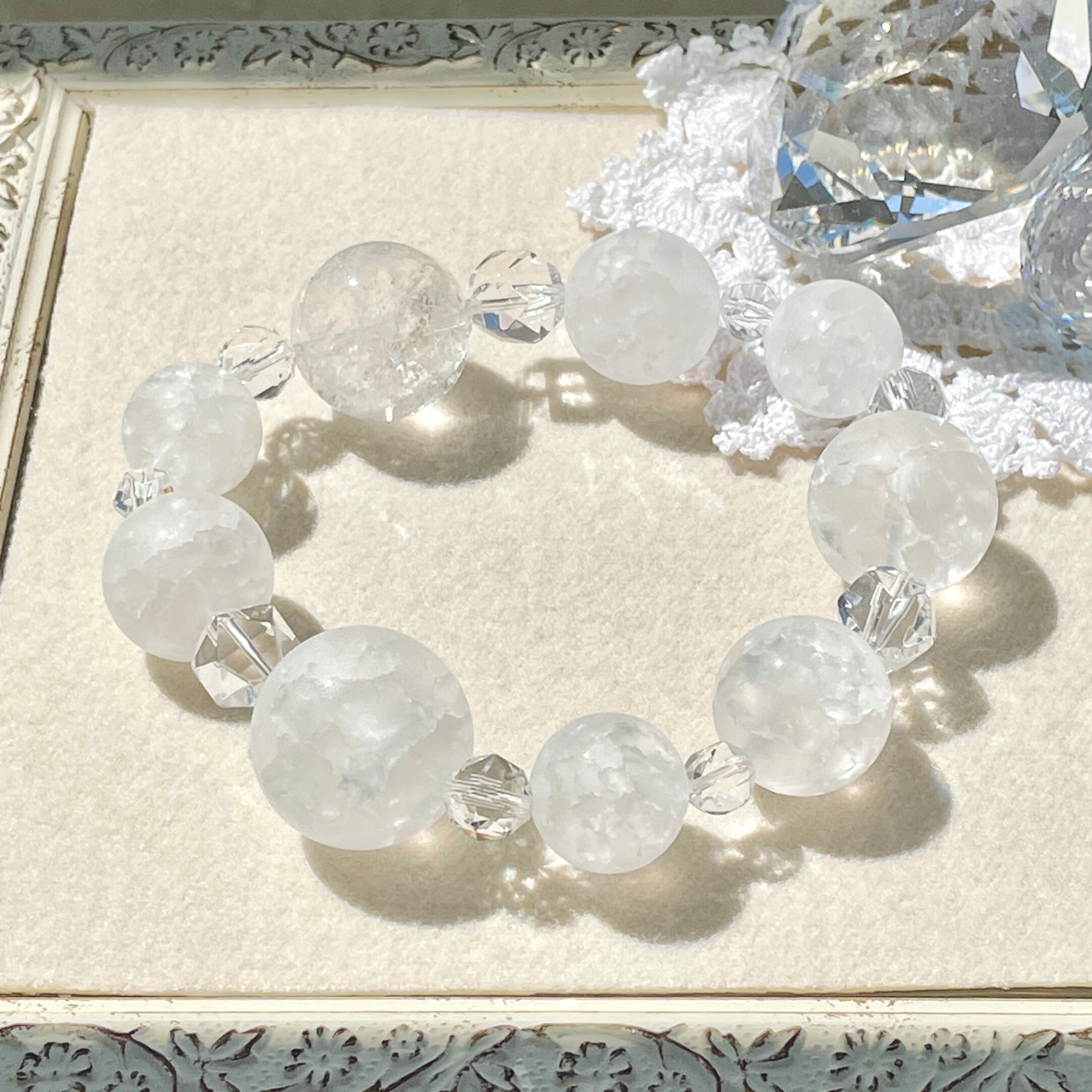 白っぽい14~20mmのクリスタル(天然水晶)の大きな丸玉は、表面のフロスト加工に加え、ザクザクとした印象の人工クラックが入っています。雪や氷を思わせる見た目から「スノーフレーククリスタル」とも呼ばれています。