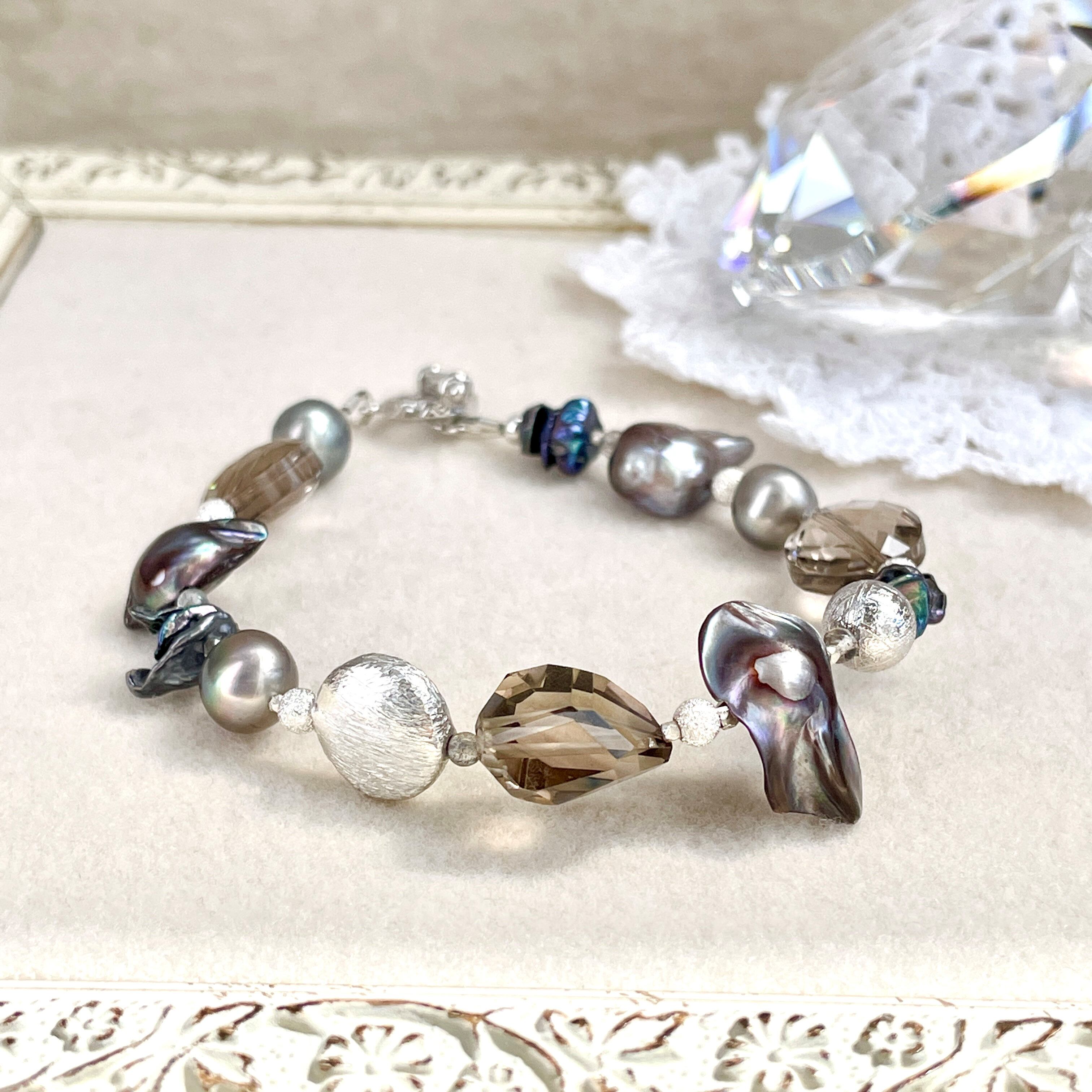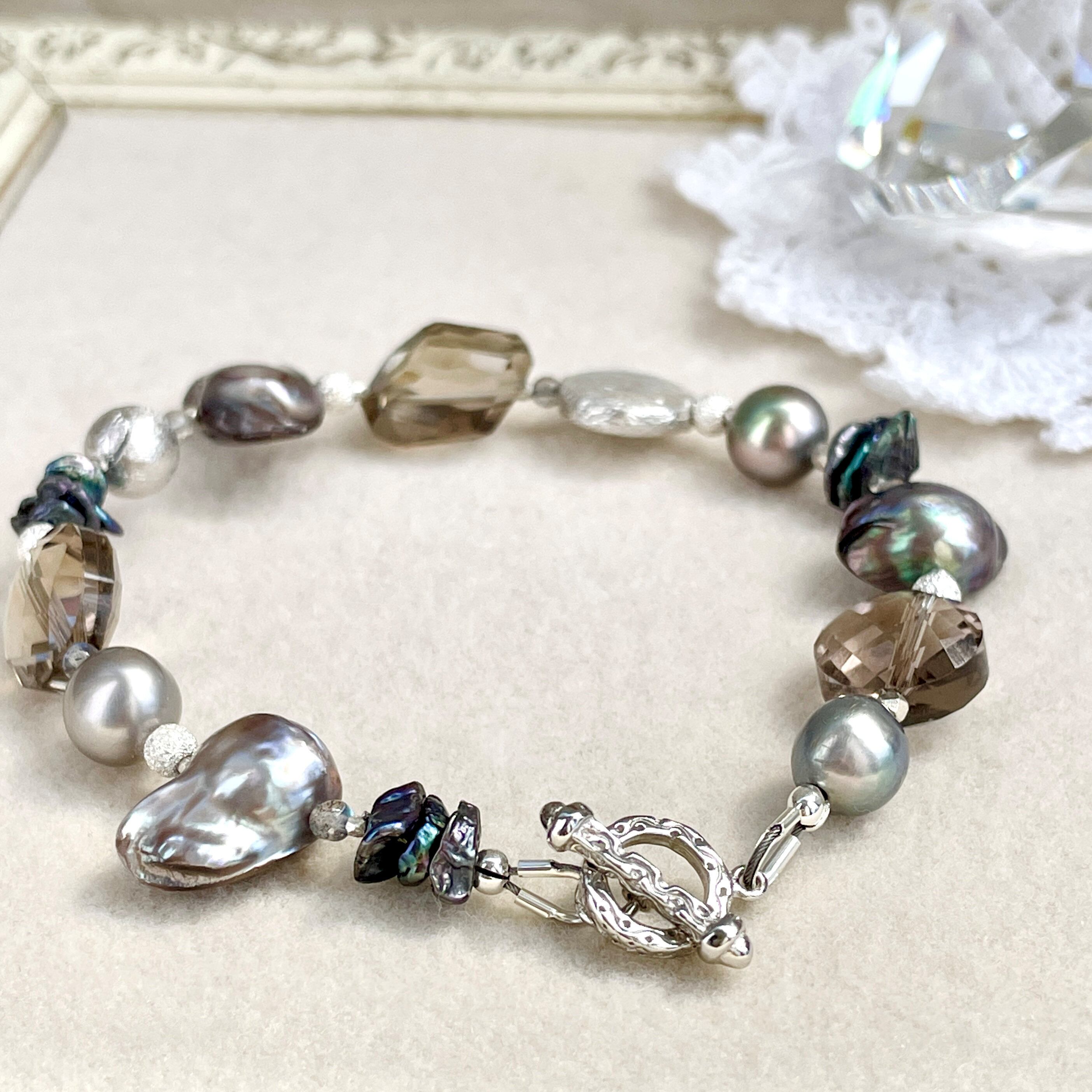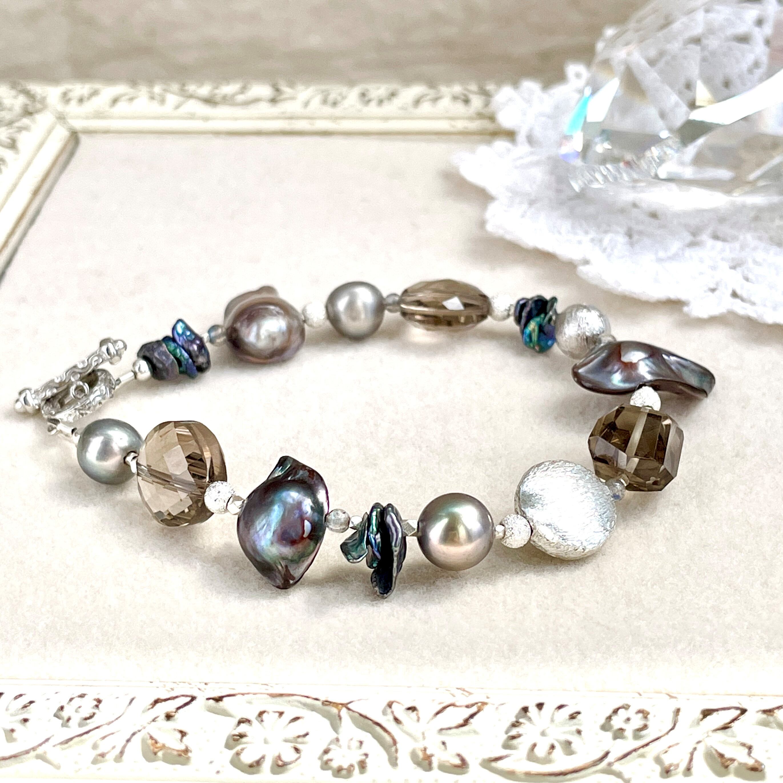 silver925 淡水パール+スモーキークォーツ+メテオライトのブレスレット pea-bs-2209-10