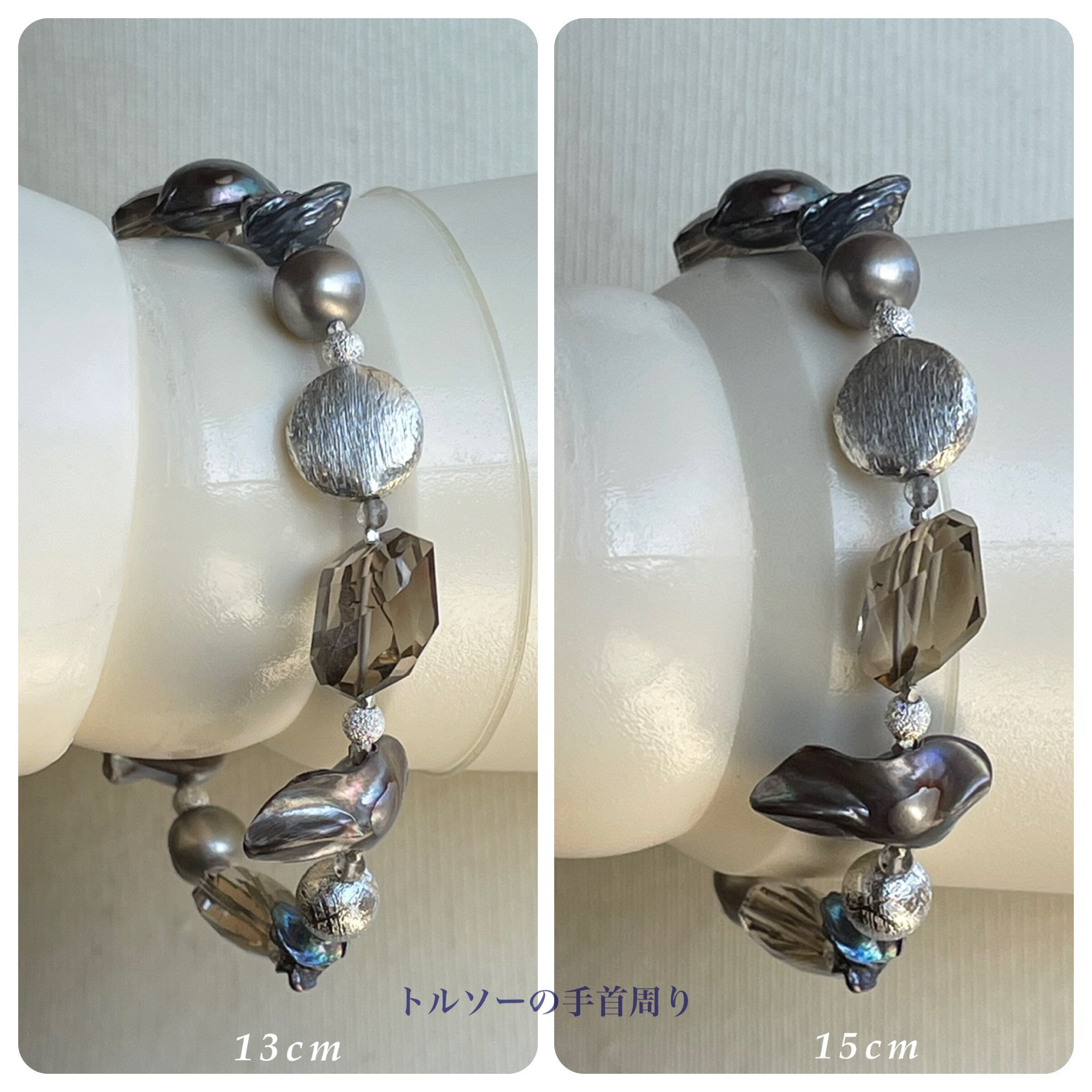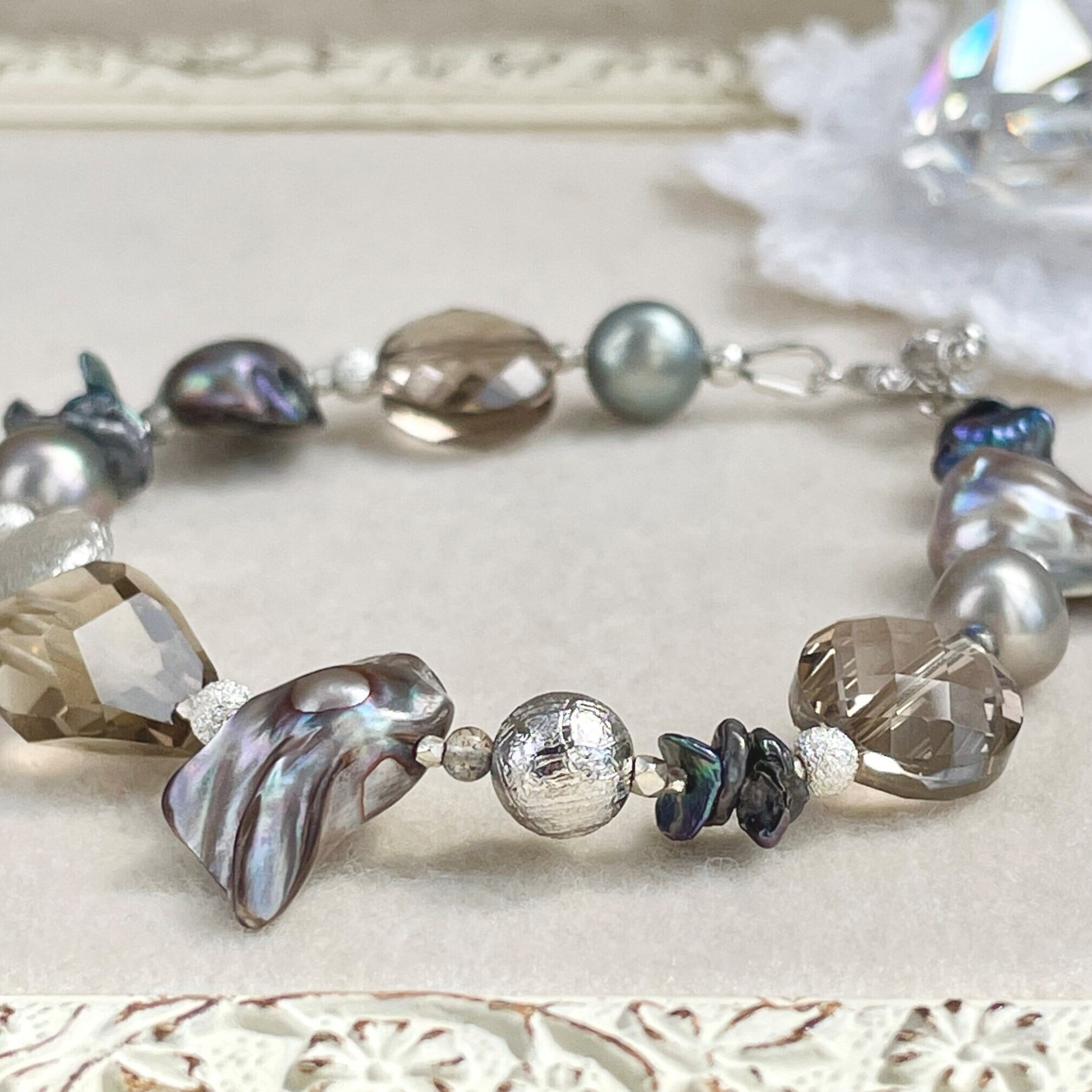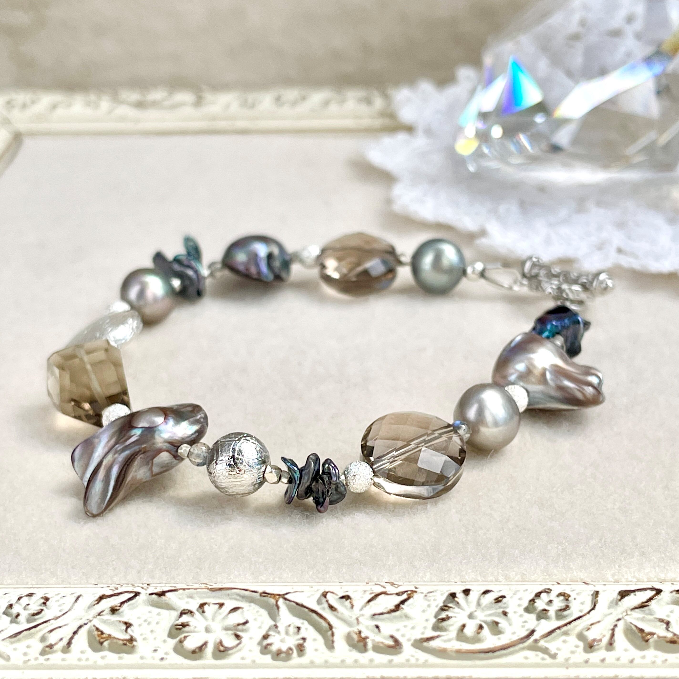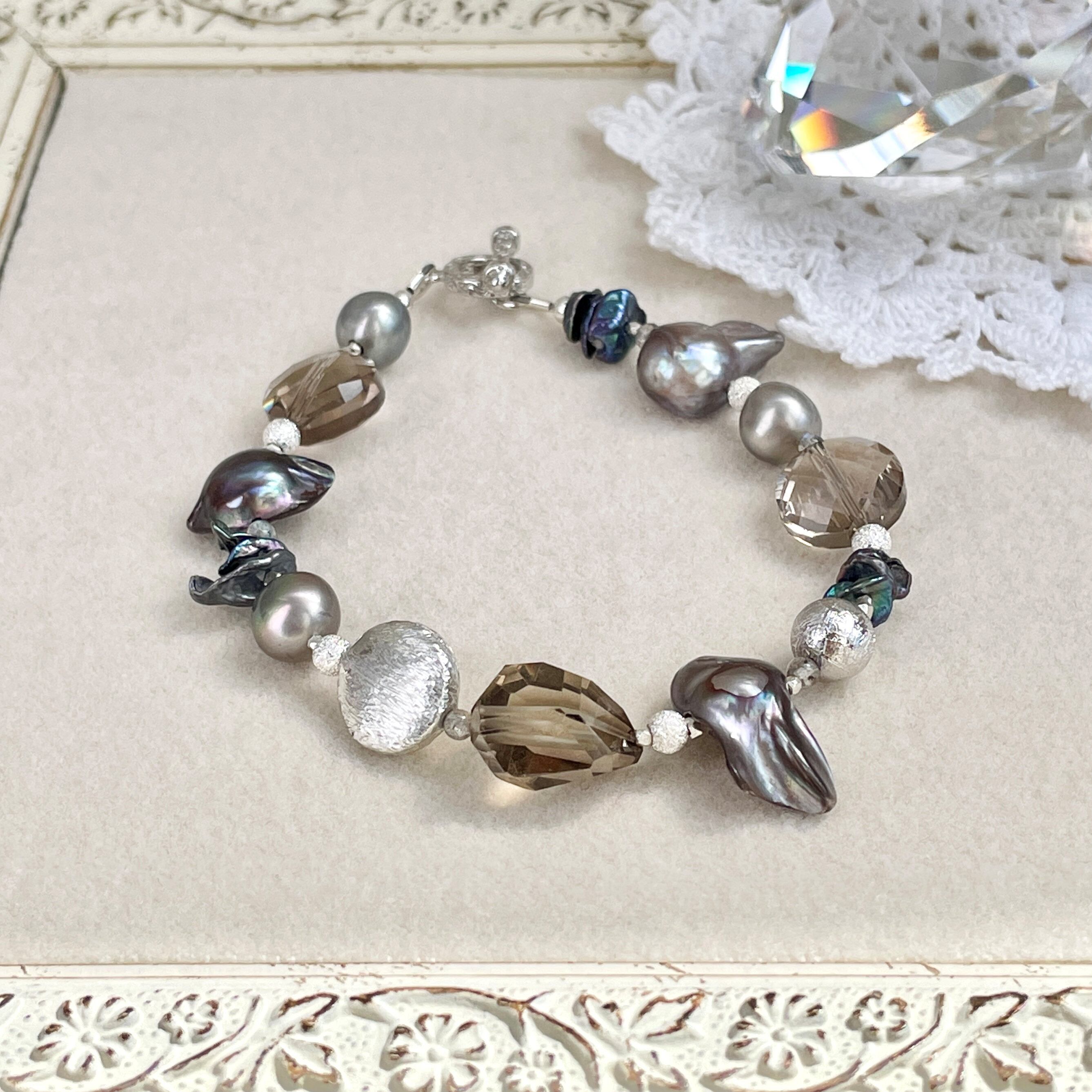 silver925 淡水パール+スモーキークォーツ+メテオライトのブレスレット pea-bs-2209-10