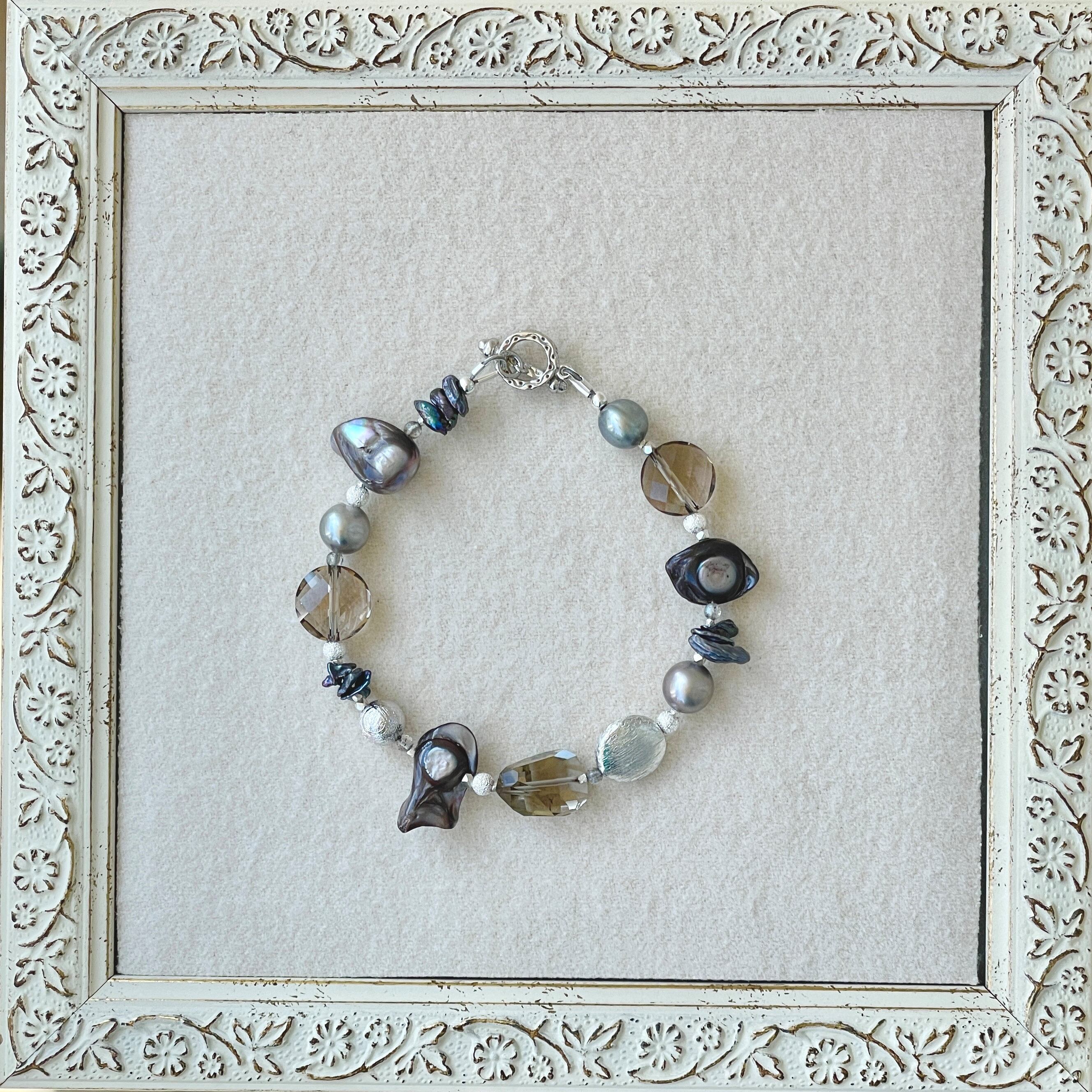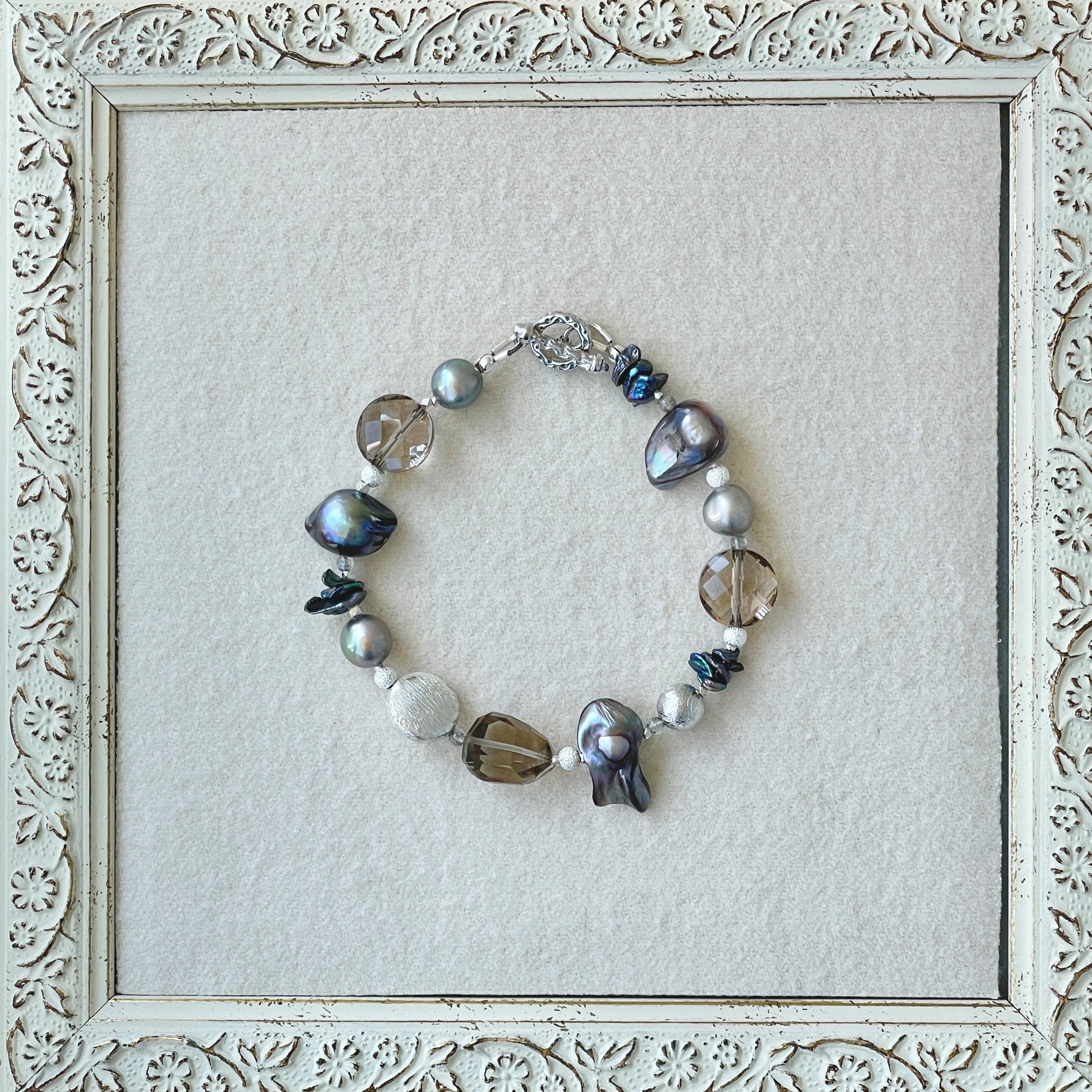 個性的な形の淡水パールと天然石をシックな色でまとめたブレスレットです。何気にひと癖ある石を忍ばせてあります。