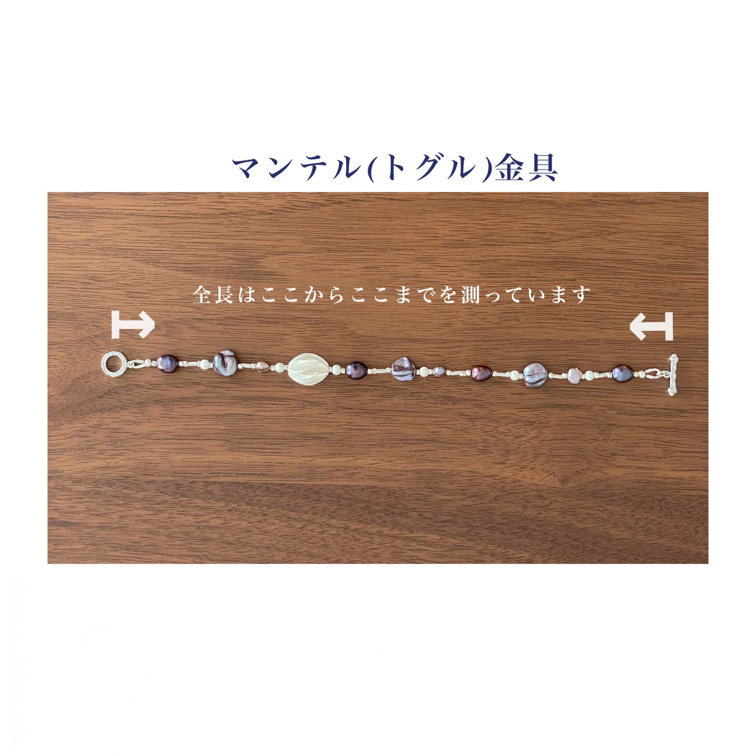 変形バロック型やチップ型など変わった形の淡水パールたちは、グレイッシュパープル~ネイビーの落ち着いた色合いとメタリックなつや感が、大人ないい感じです。