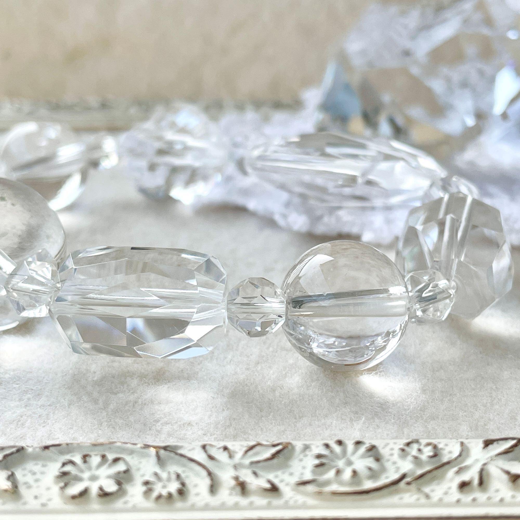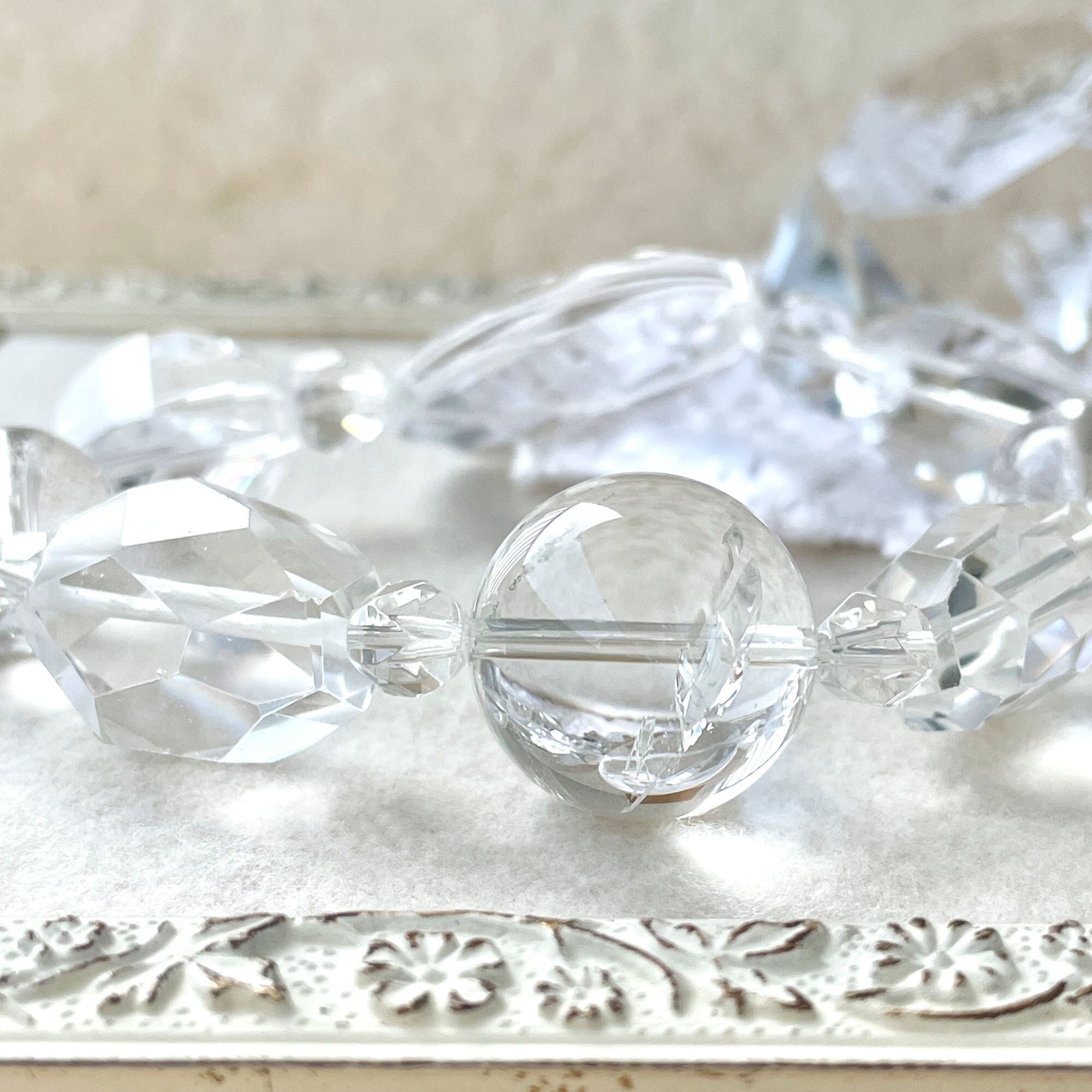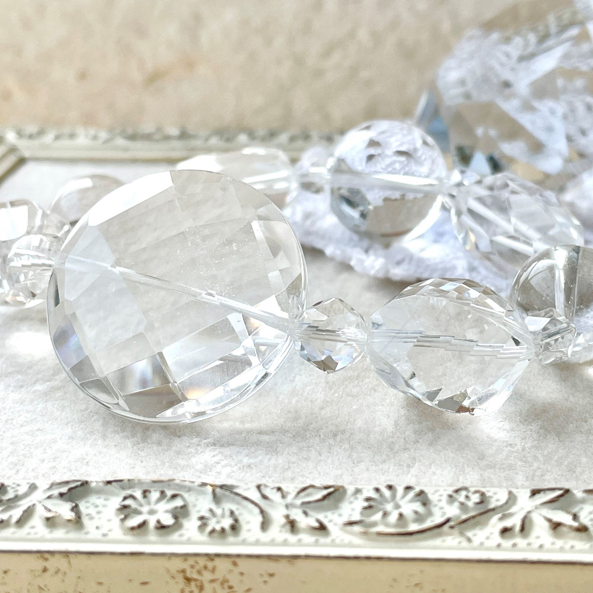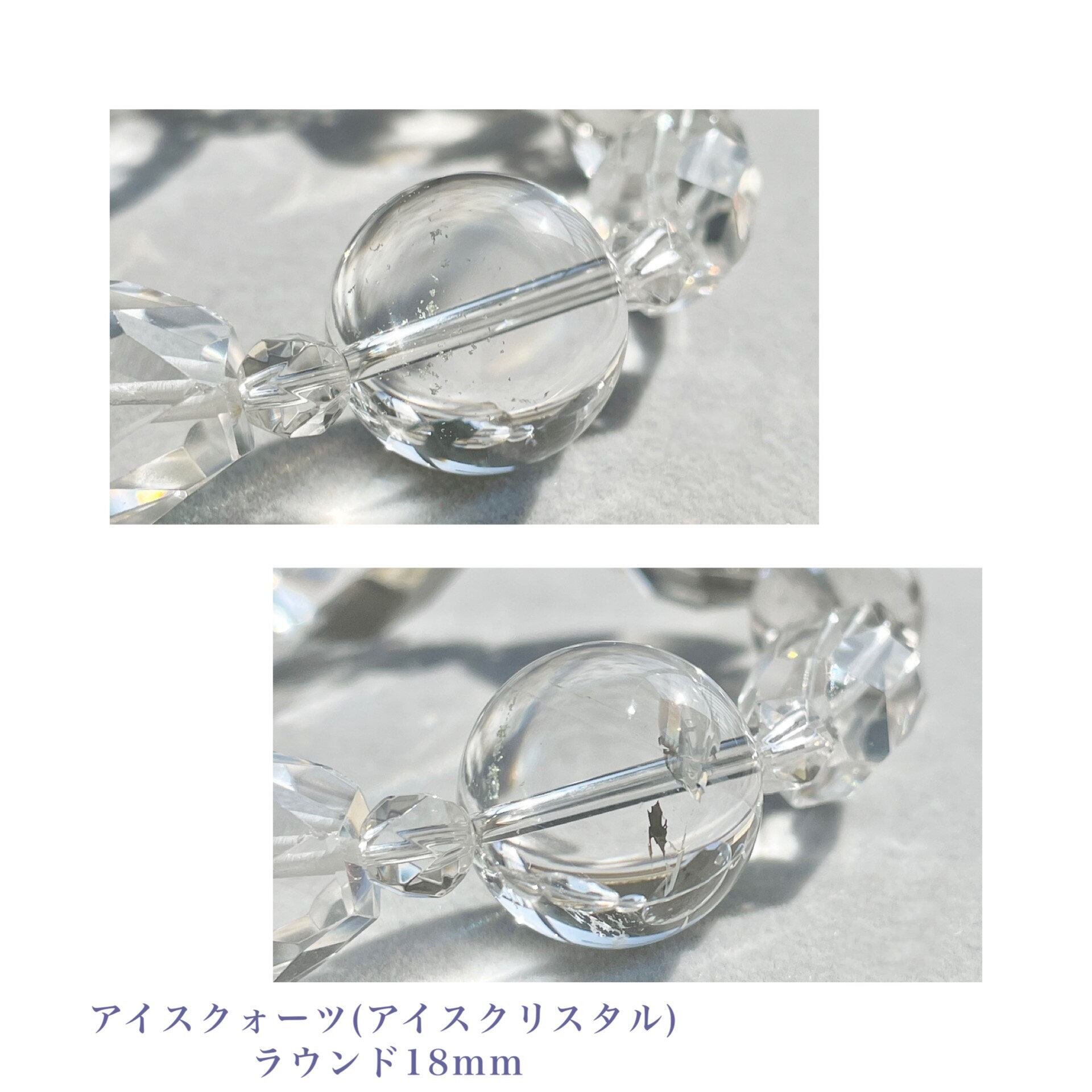 それに合わせて、約20mmのタンブルカットや18mmのツイスト多面カット、大きな丸玉のアイスクォーツでデザインを構成しています。