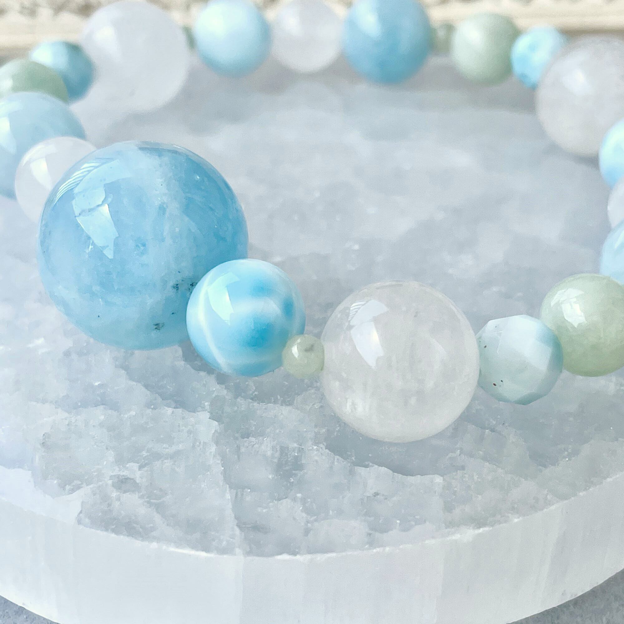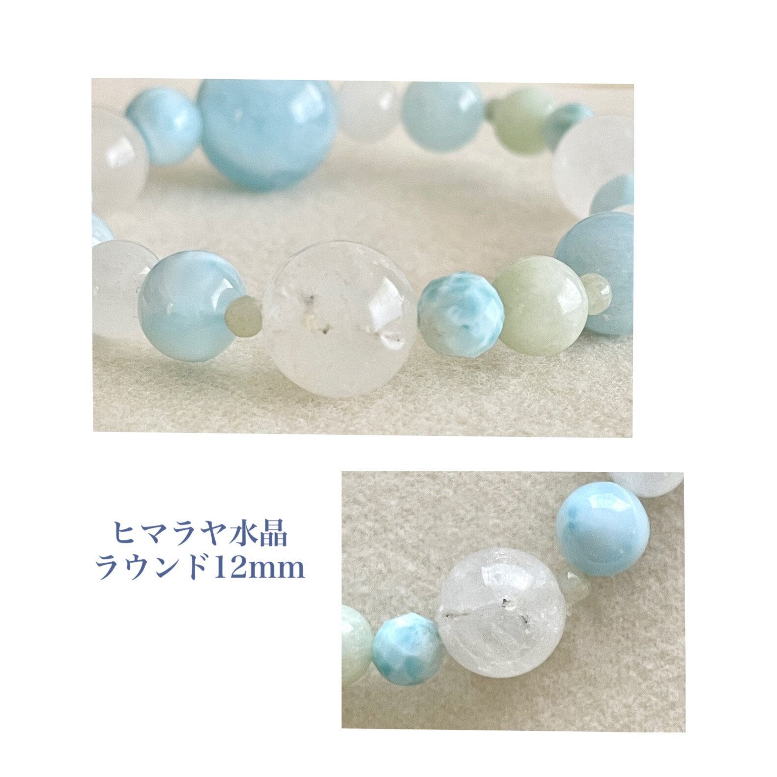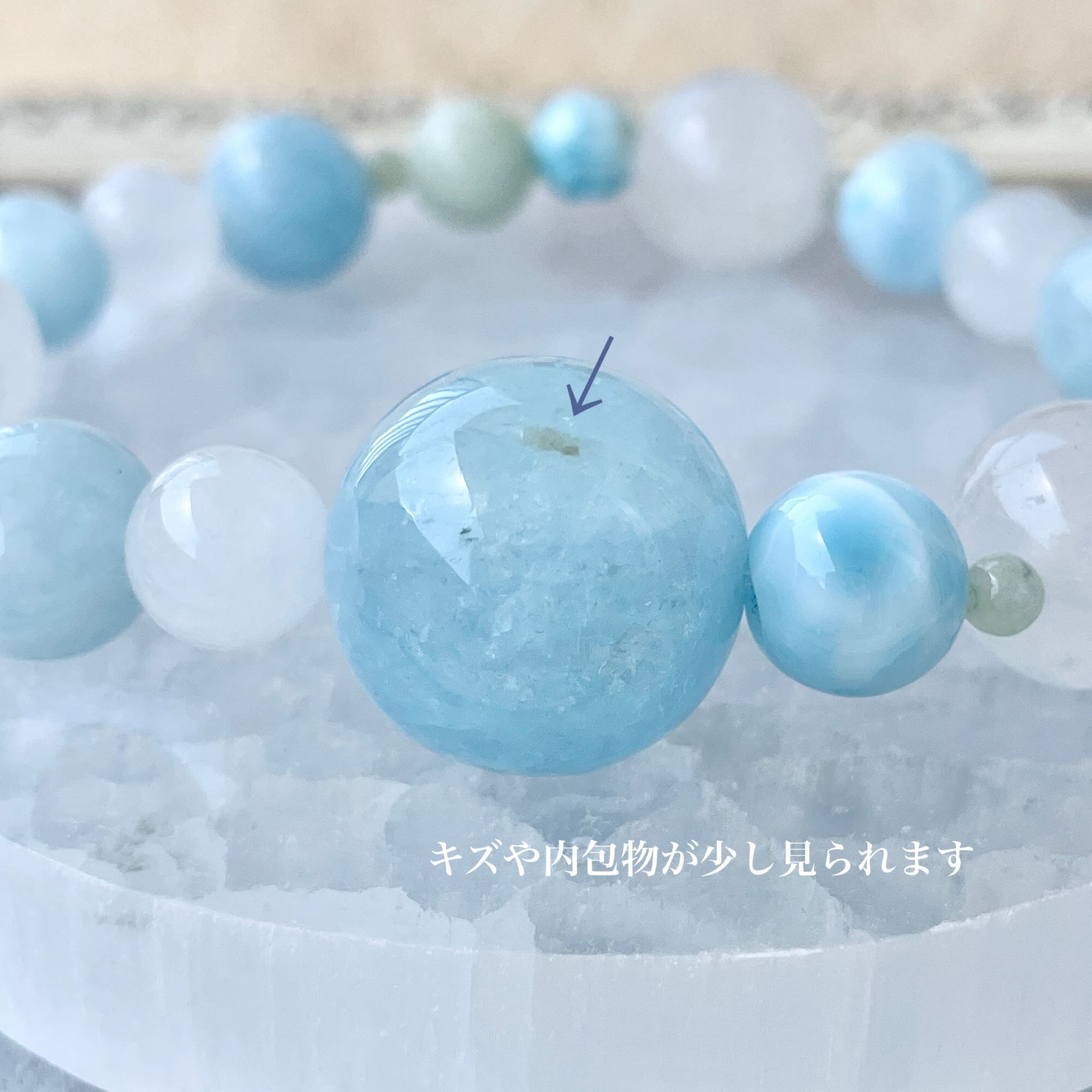 8.5mmのラリマーは、アイスラリマーと呼ばれる淡い色のタイプを選びました。カット入りのラリマーの6mm玉も淡い色を選んでいます。