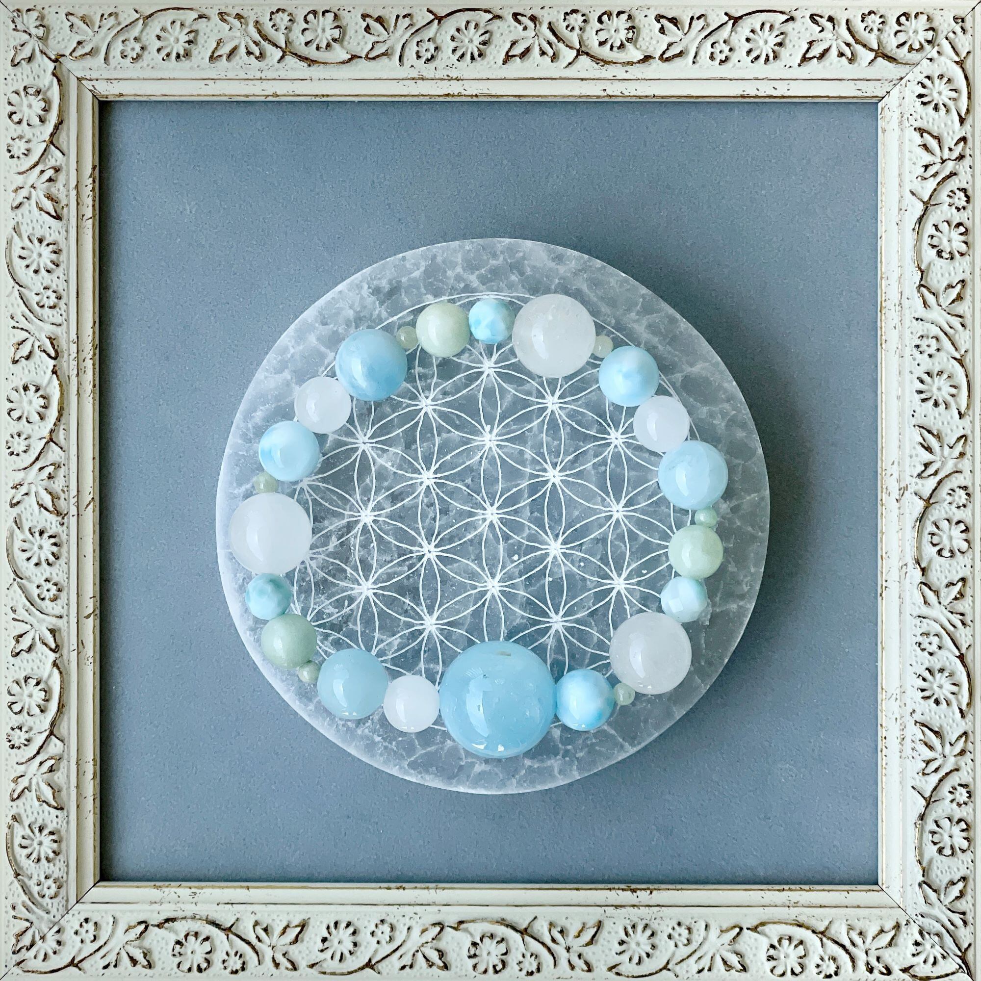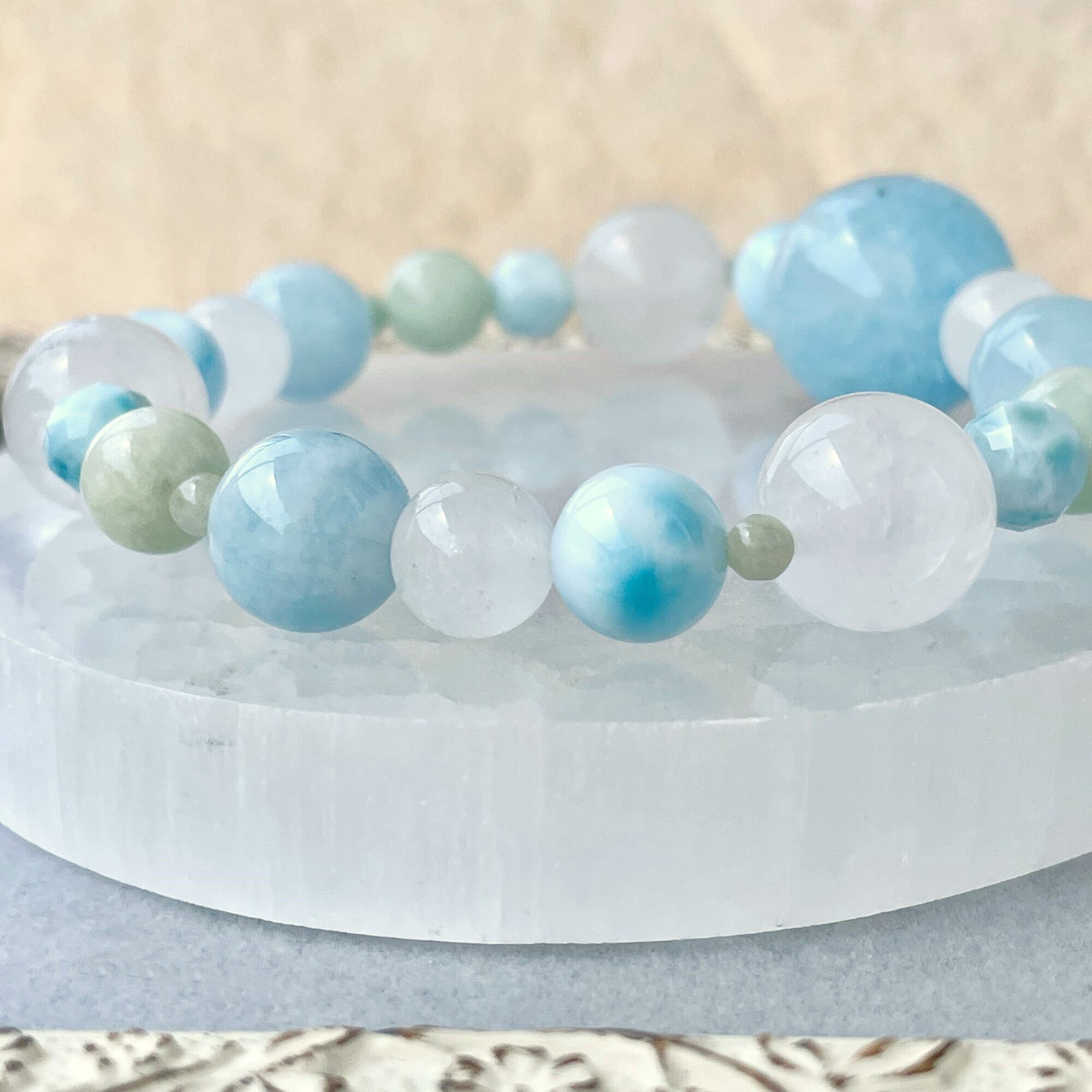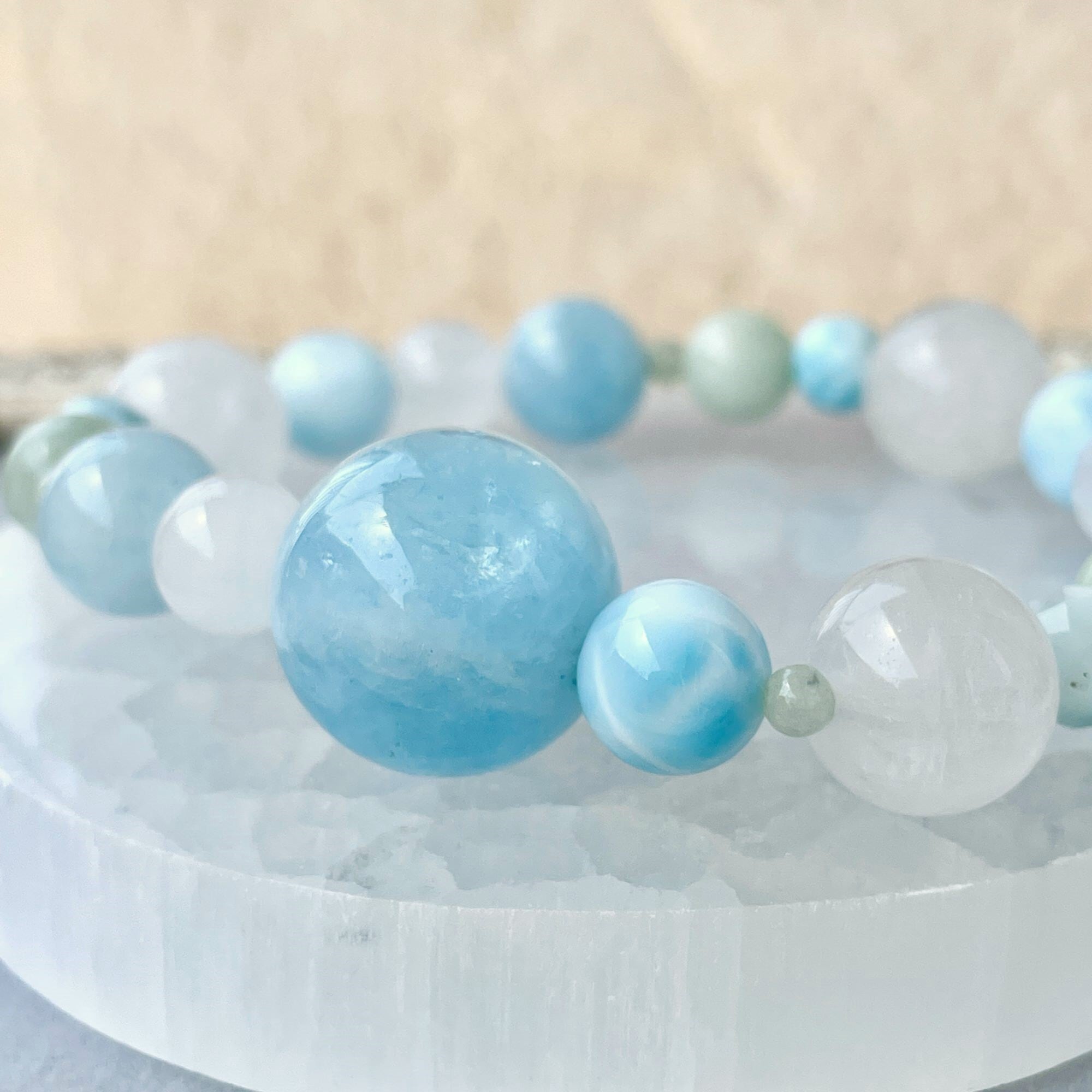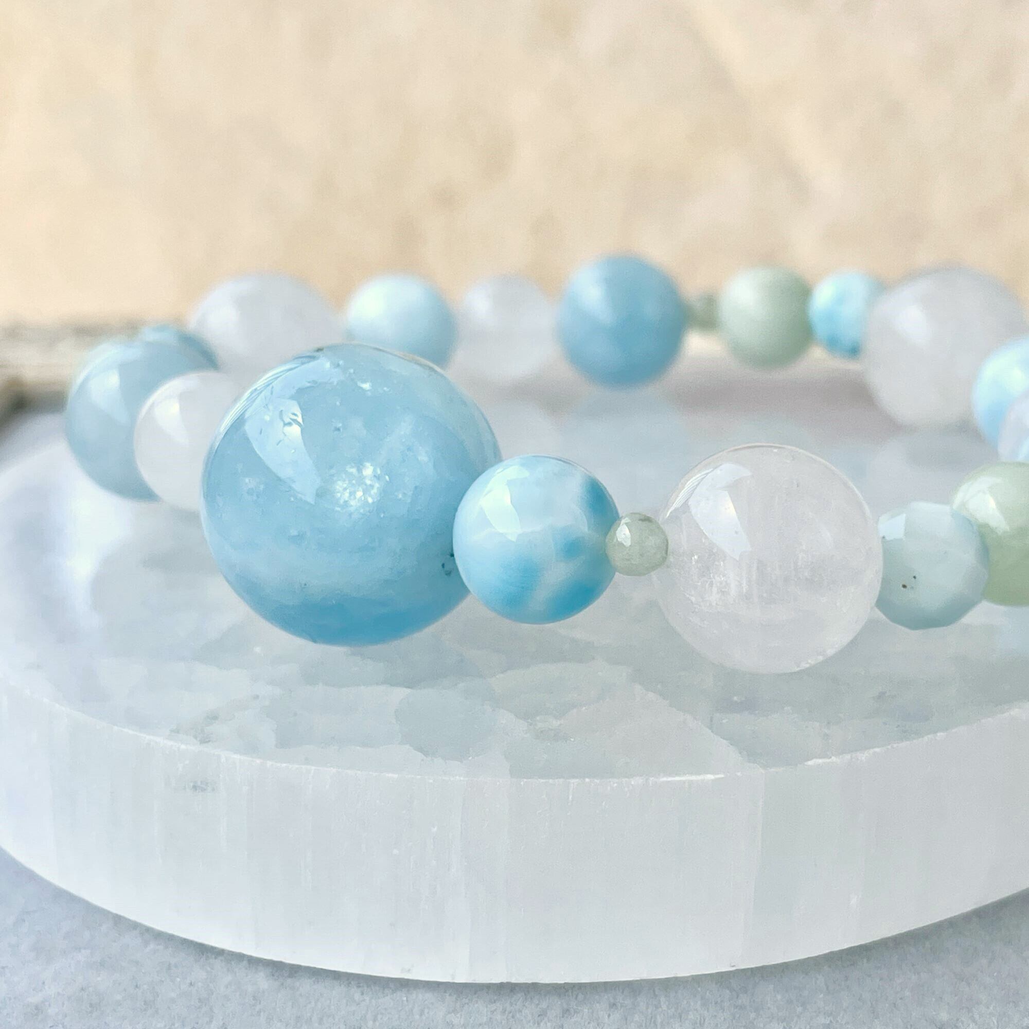 8.5mmのラリマーは、アイスラリマーと呼ばれる淡い色のタイプを選びました。カット入りのラリマーの6mm玉も淡い色を選んでいます。