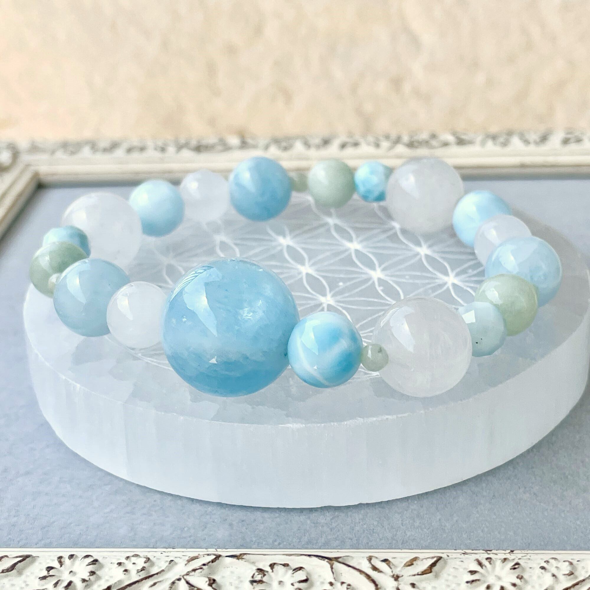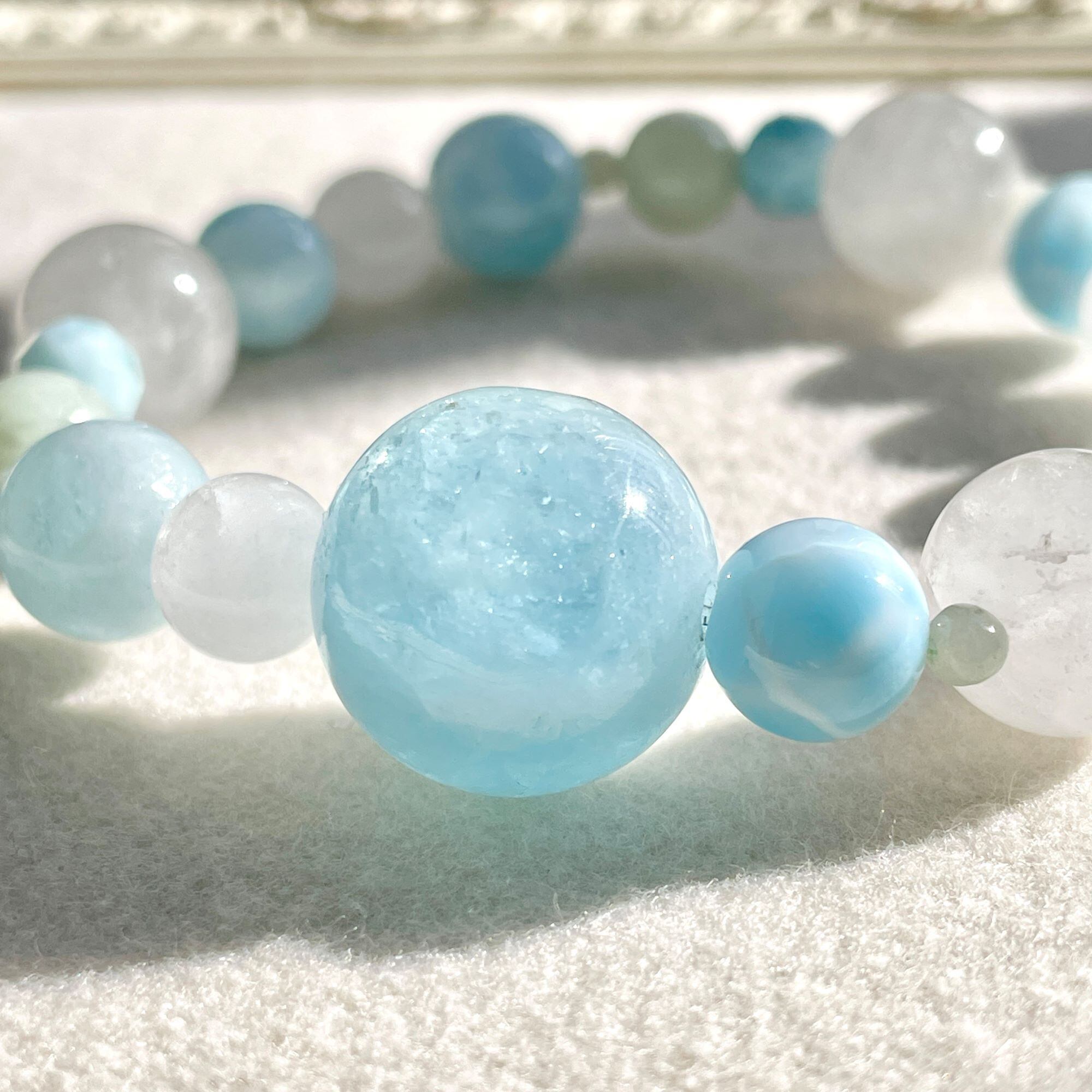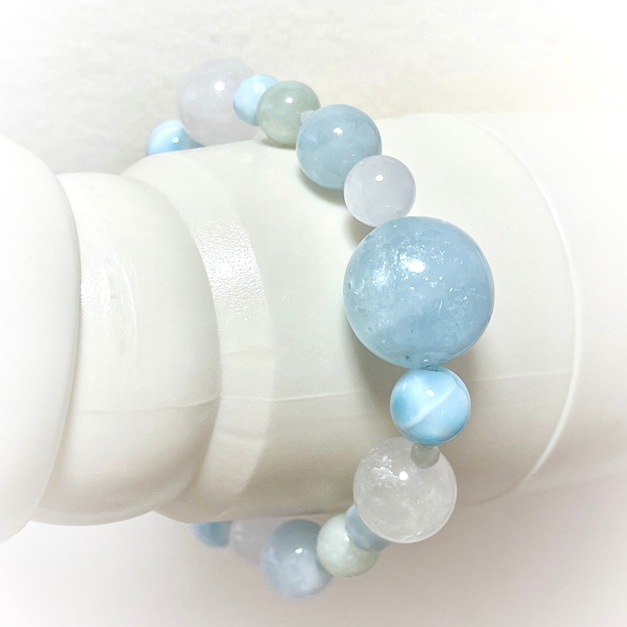 アクアマリンの大きな丸玉をポイントに、ラリマー、翡翠(ジェダイト)、ヒマラヤ水晶で全体を構成したアシンメトリーのブレスレットです。