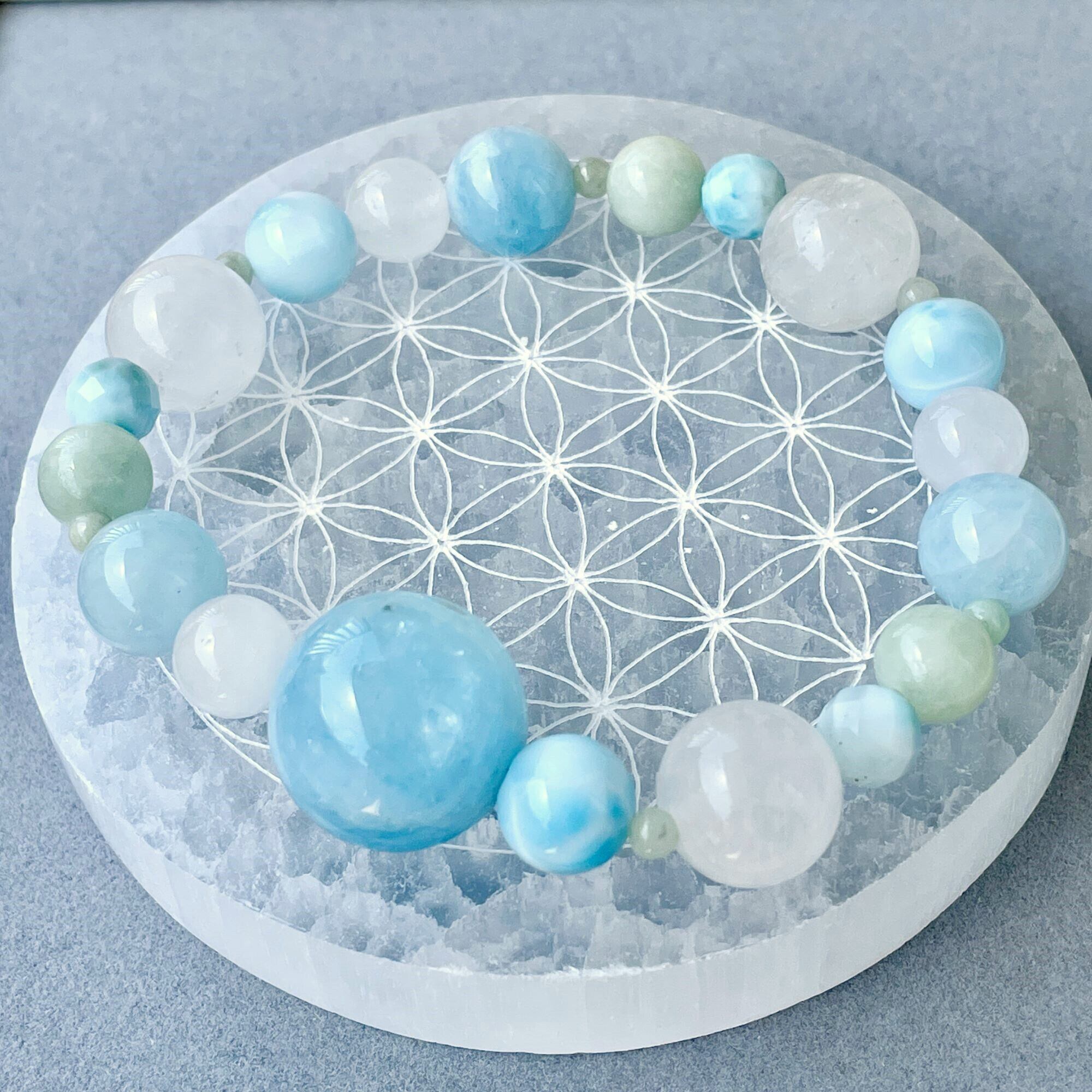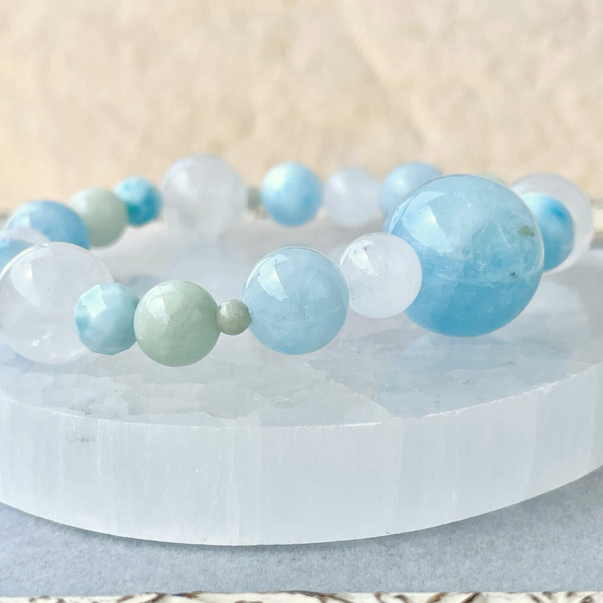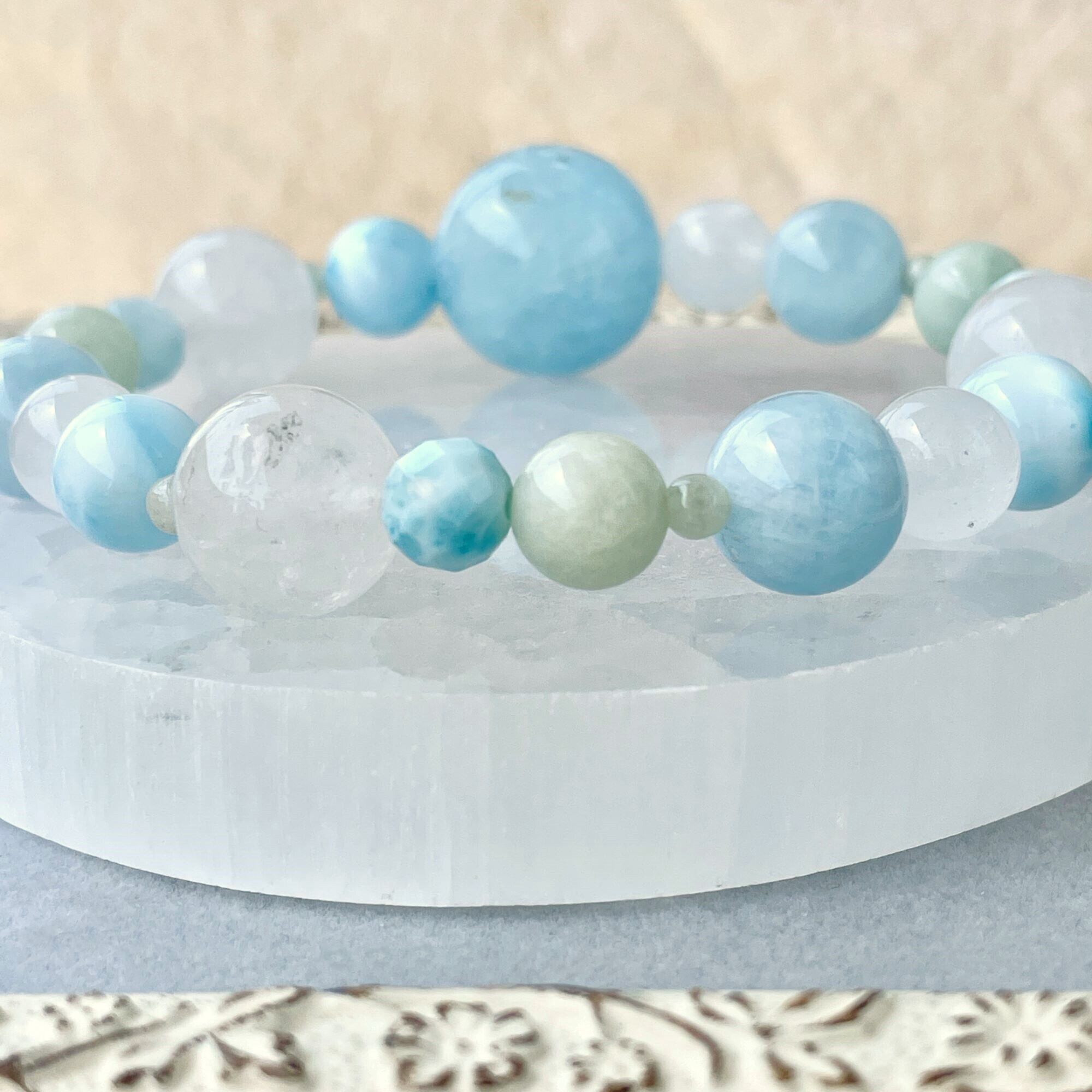 アクアマリンの大きな丸玉をポイントに、ラリマー、翡翠(ジェダイト)、ヒマラヤ水晶で全体を構成したアシンメトリーのブレスレットです。