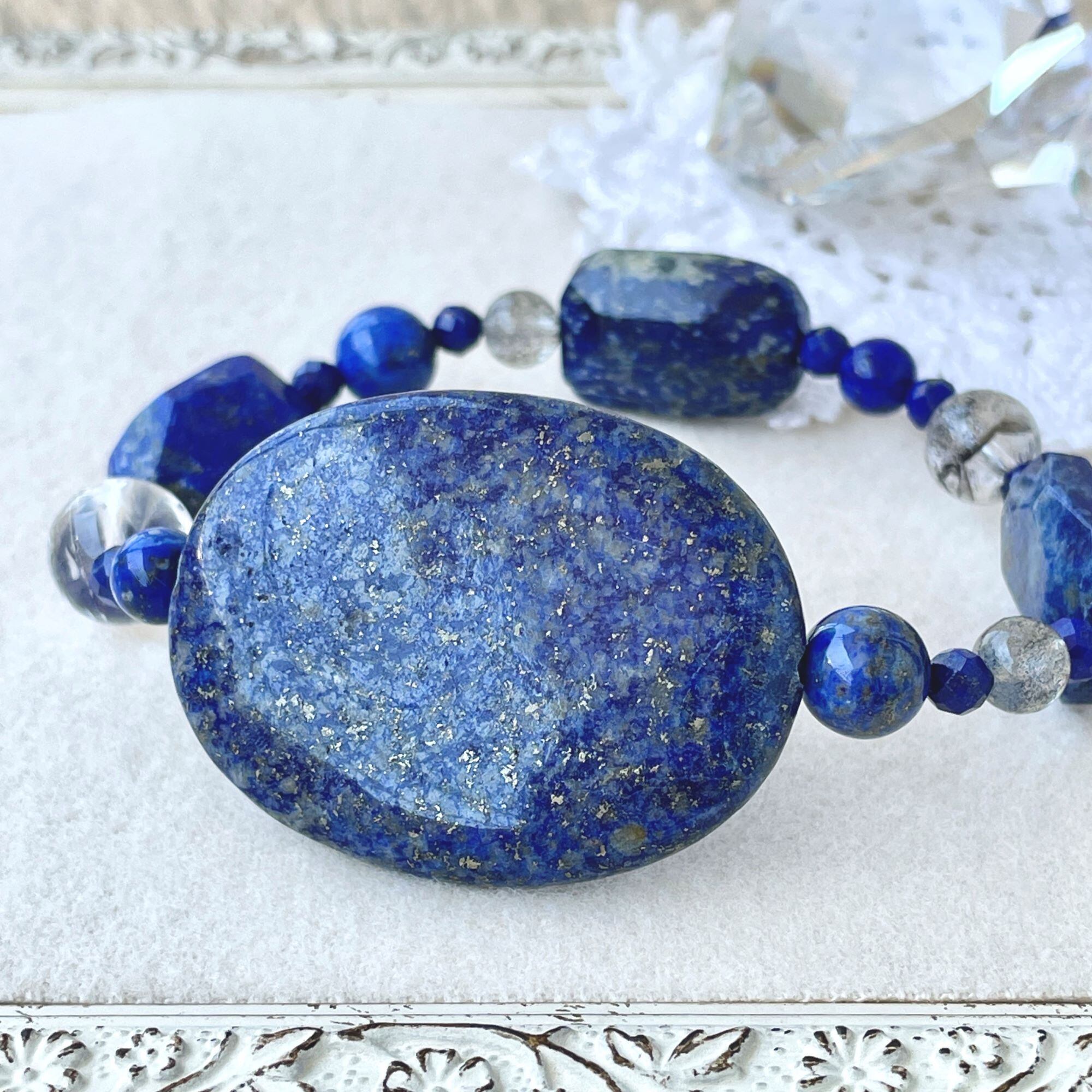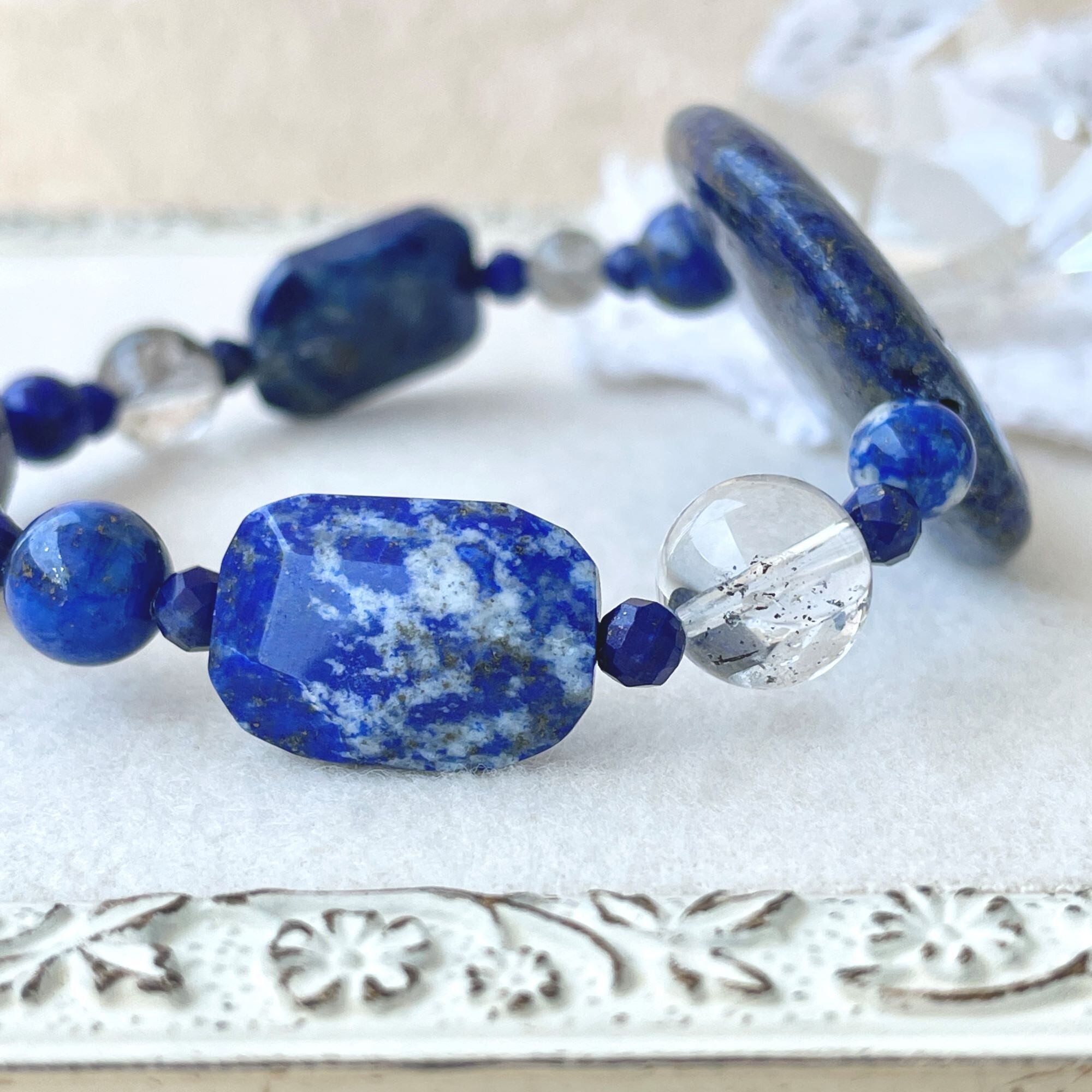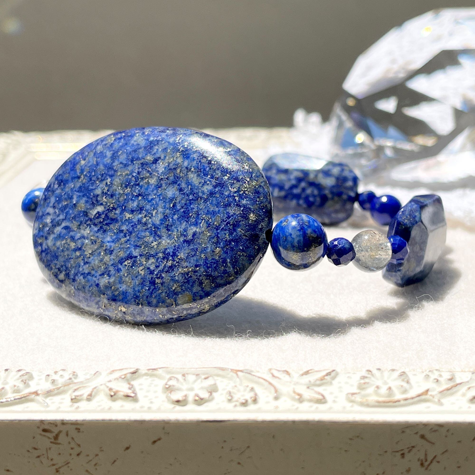 内包物やクラックによって、それぞれに表情がある石たちです。ラピスラズリの個性に馴染みながらも抜け感を作ってくれています。