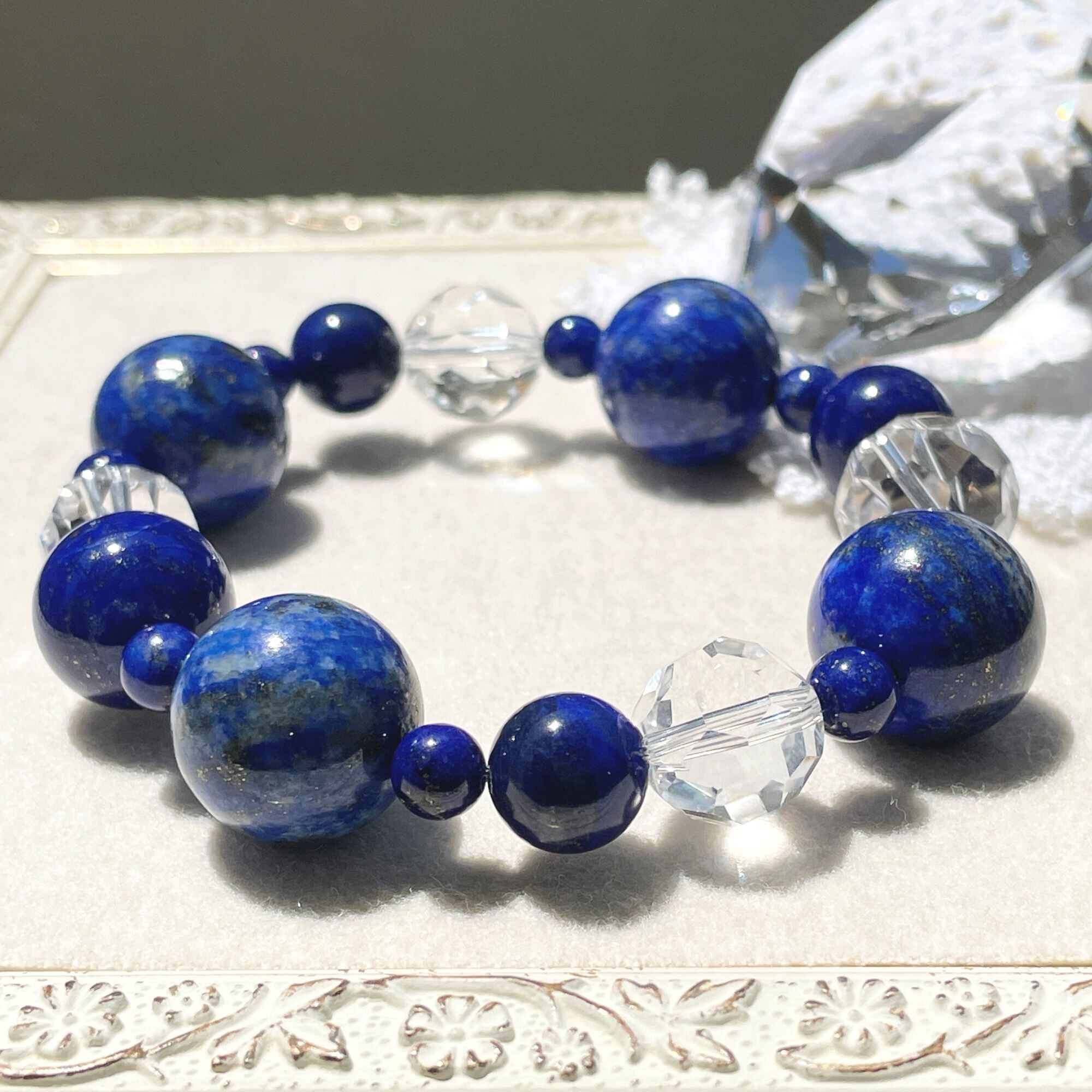 アクセントに使ったクリスタル(天然水晶)には、バッキーボールカット(五角形と六角形が混ざり合ったサッカーボールのような形状のカット)という凝ったカッティングが施されています。石質もよく輝きも美しいので、ラピスラズリたちをうまく引き立たせてくれていると思います。