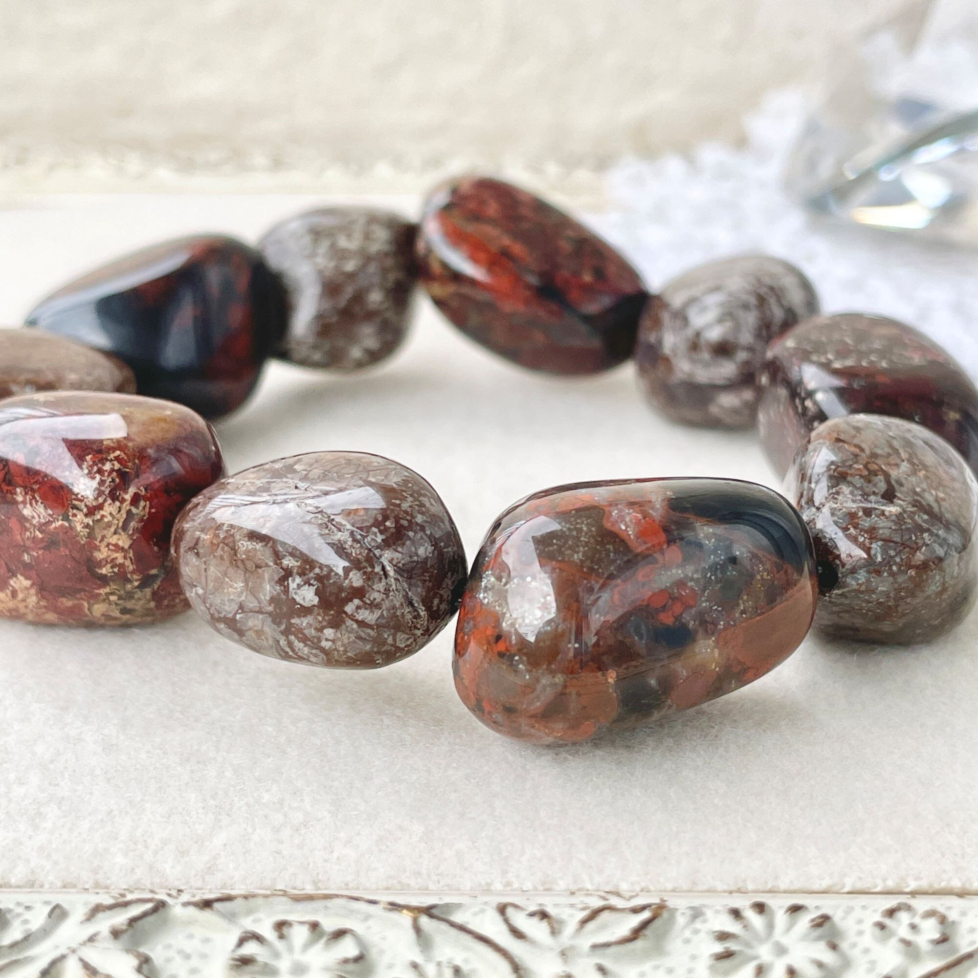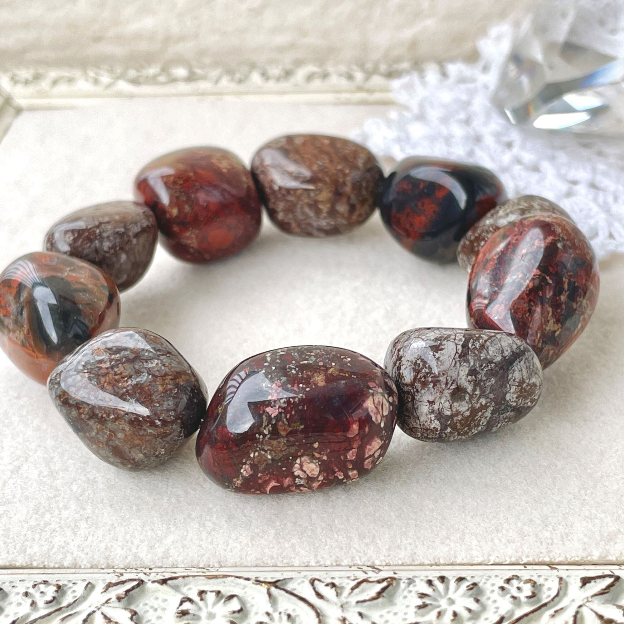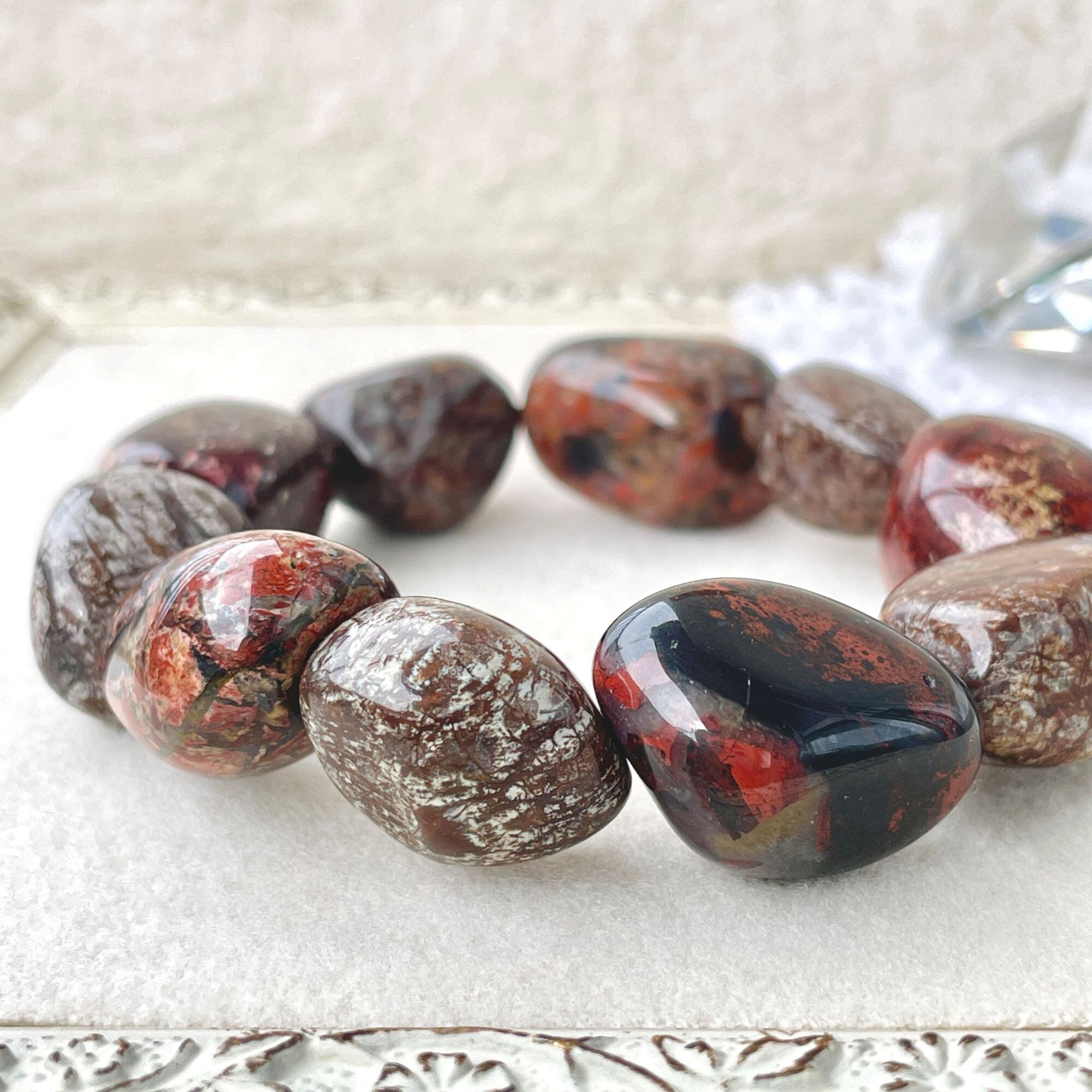 ポピージャスパーは、赤~黒の色合いの柄がポピーの花を連想させることから名付けられた石名のようです。1つ1つ表情の違う石たちですが、こちらは、少しローズがかったブラウン系の石を中心にして全体を構成し選びました。