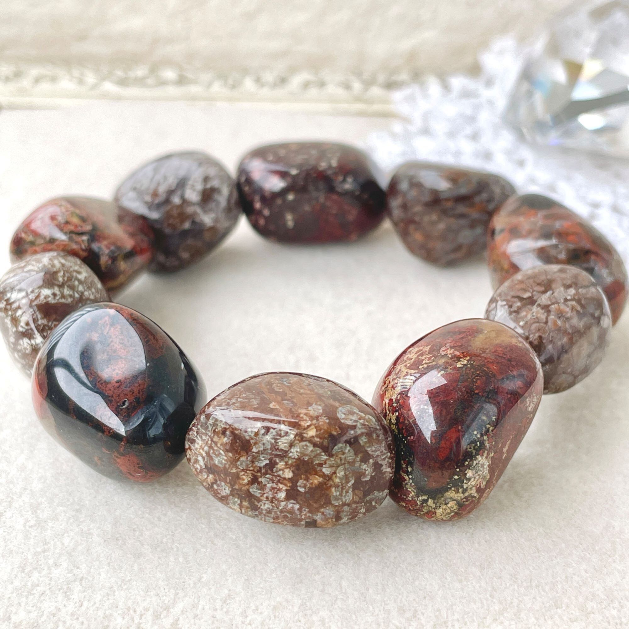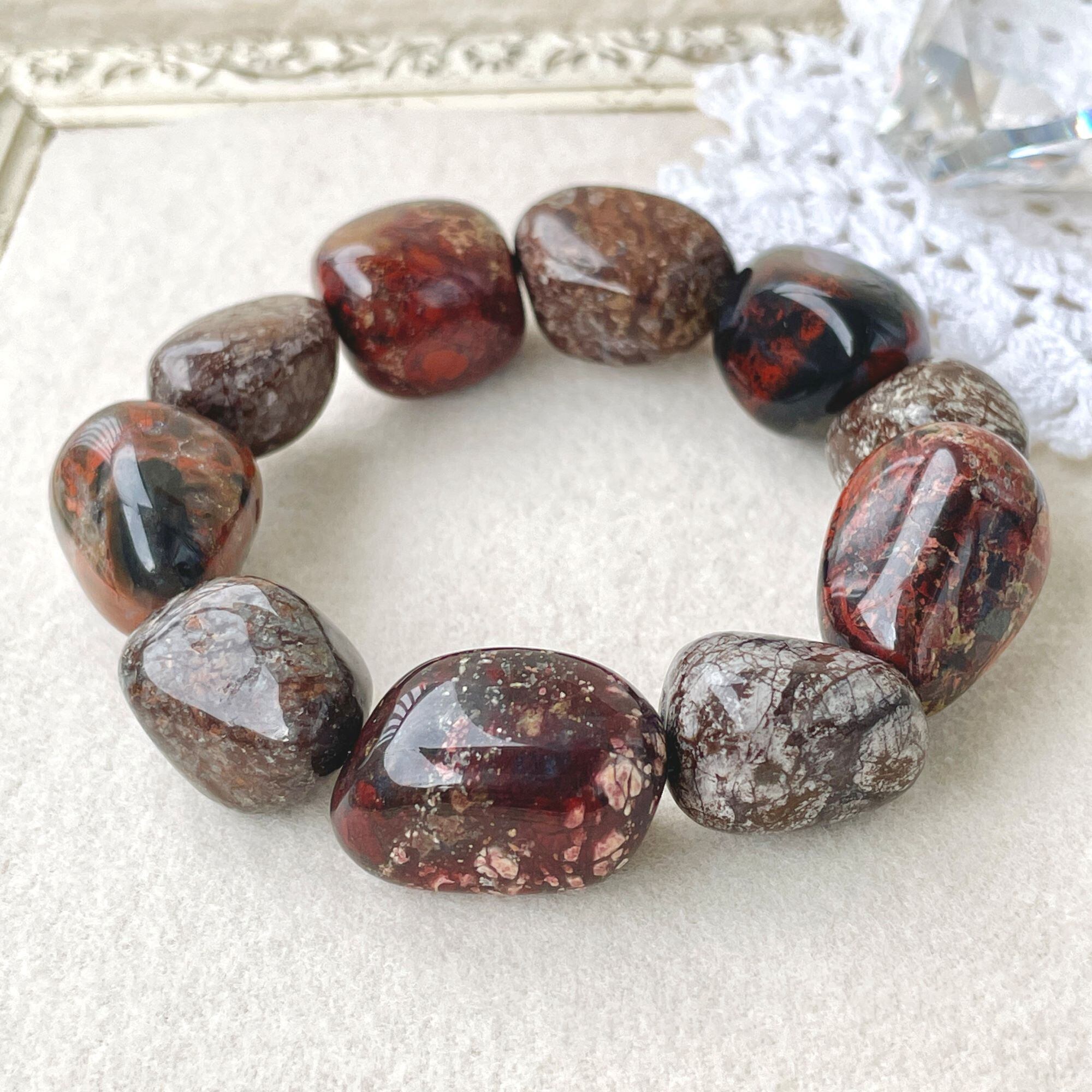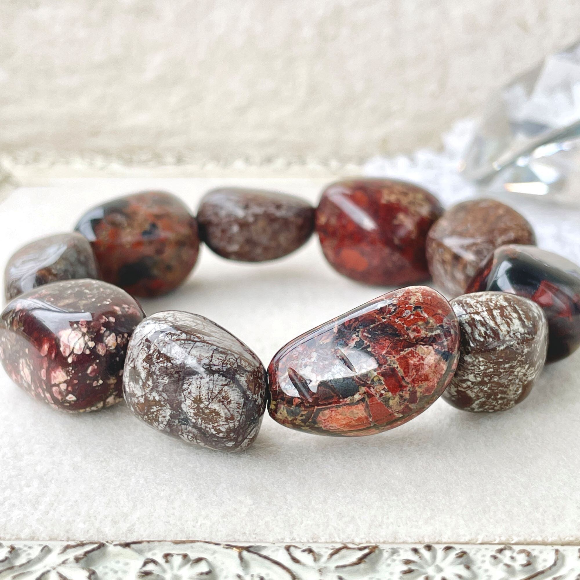 ポピージャスパーは、赤~黒の色合いの柄がポピーの花を連想させることから名付けられた石名のようです。1つ1つ表情の違う石たちですが、こちらは、少しローズがかったブラウン系の石を中心にして全体を構成し選びました。