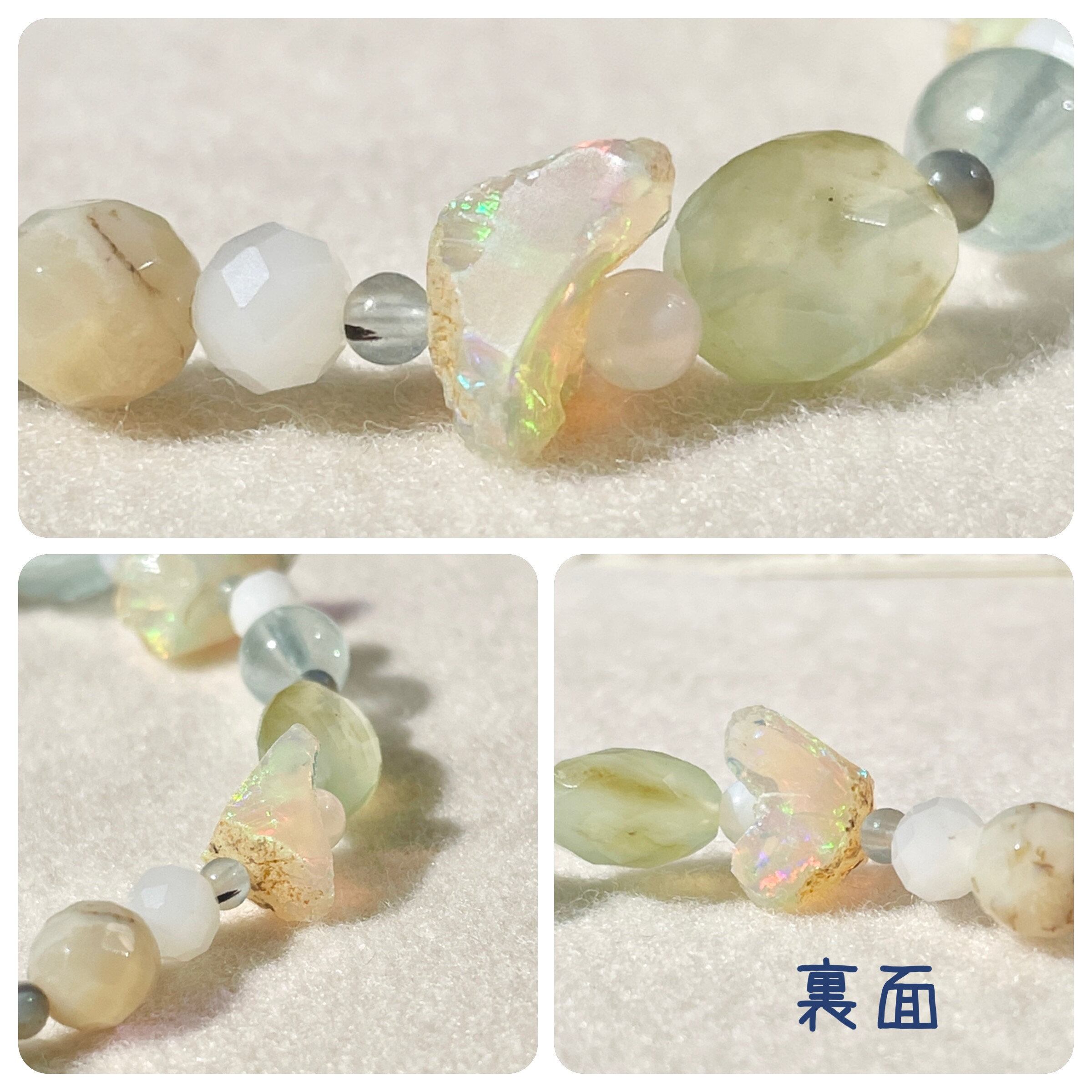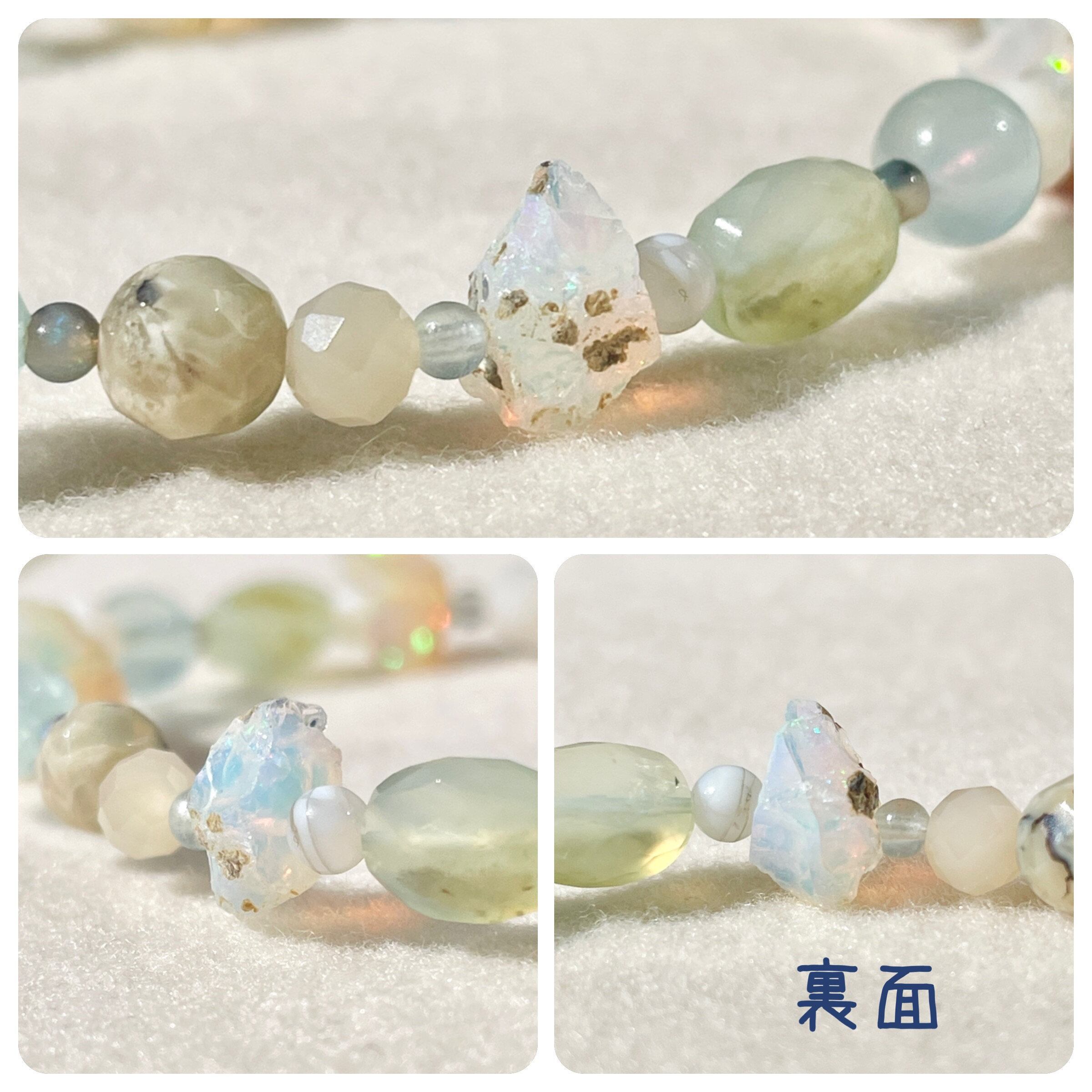 こちらのブレスレットはどちらのタイプも使い、形もラフロックやタンブルカット、丸玉などを大小で変化をつけ、いろんな表情のオパールをお楽しみいただけます。