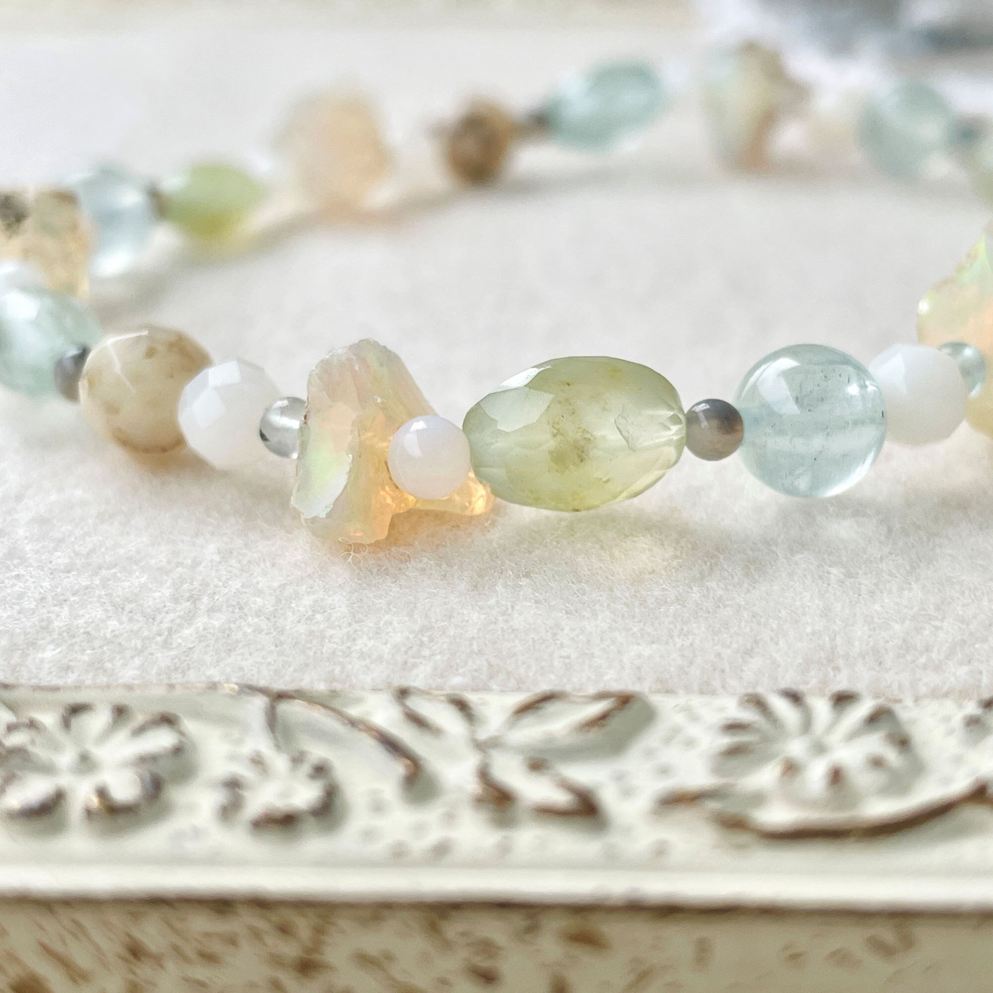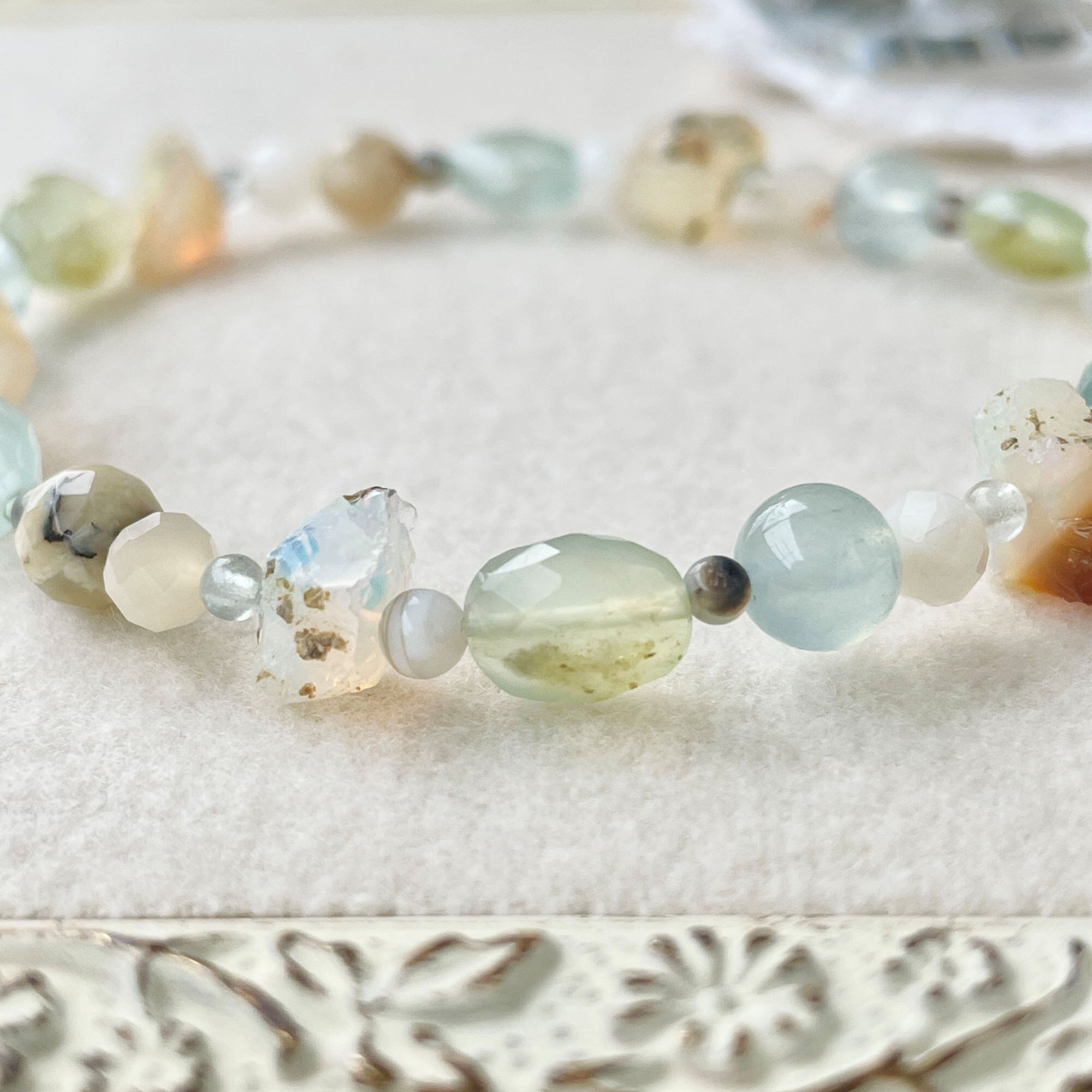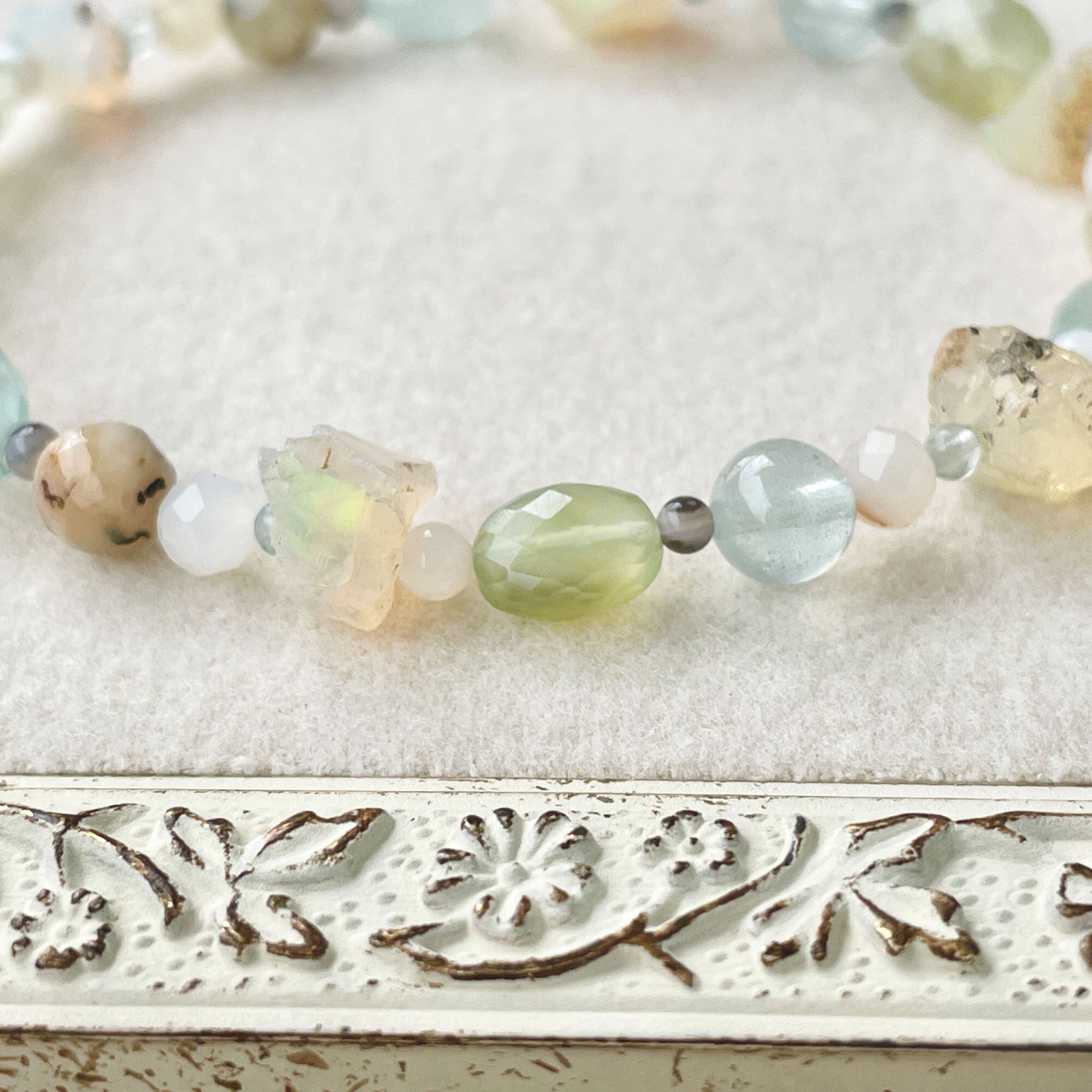 グリーンみを帯びたブルーオパールのタンブルカットに寄せてくすみブルーの色合いのものを合わせ、全体を優しい色合いでまとめました。
