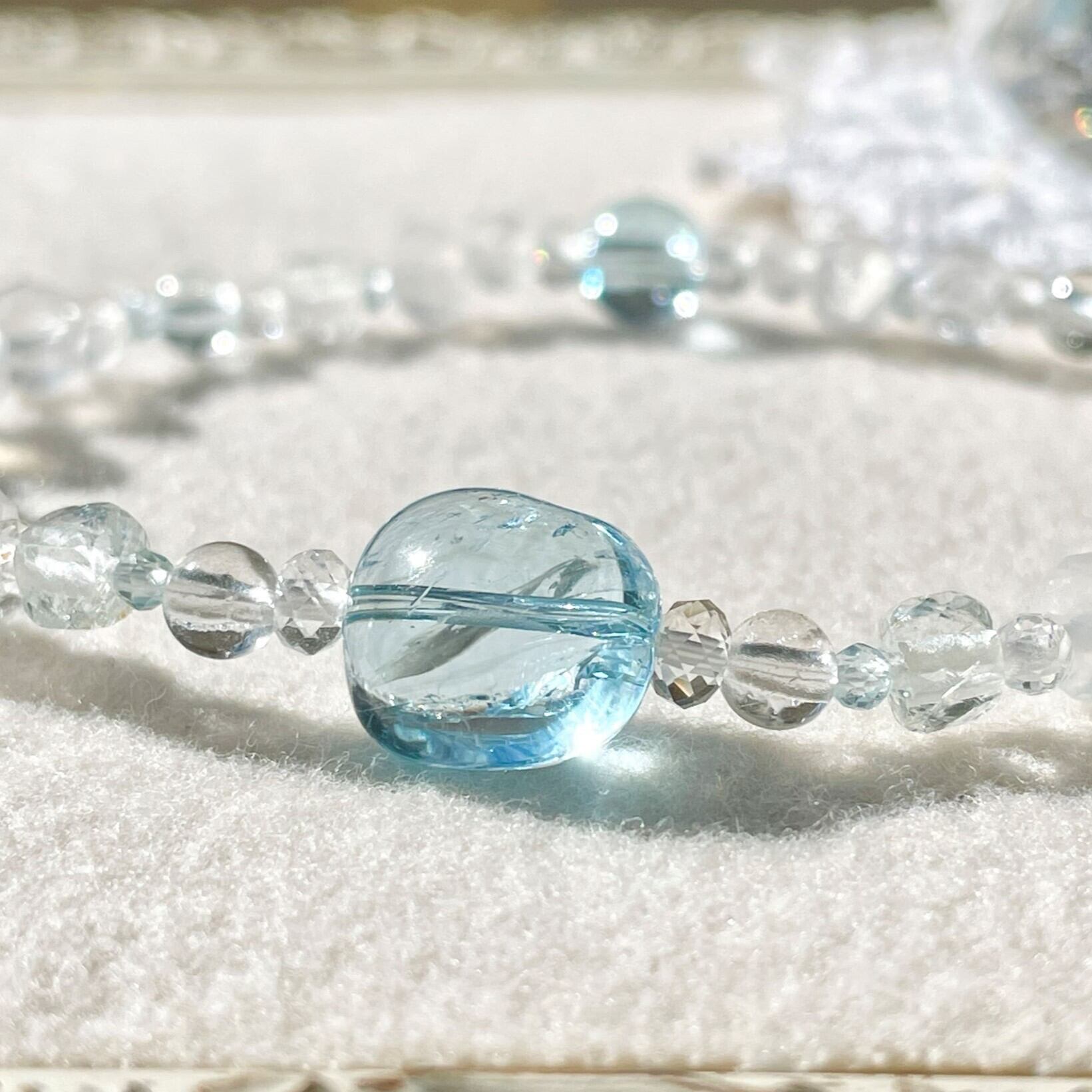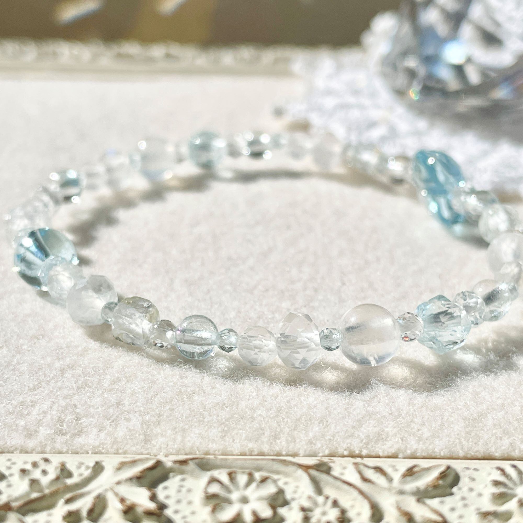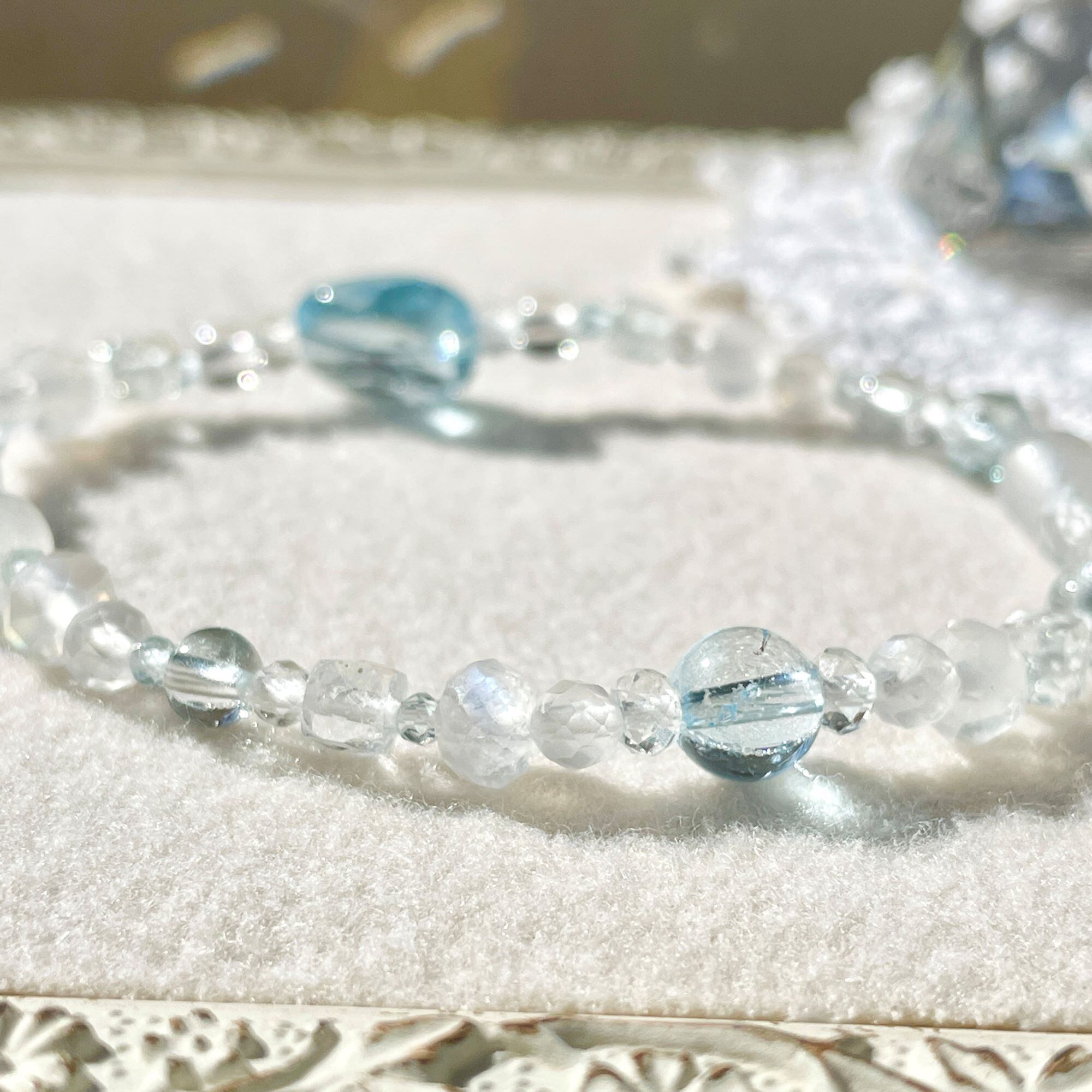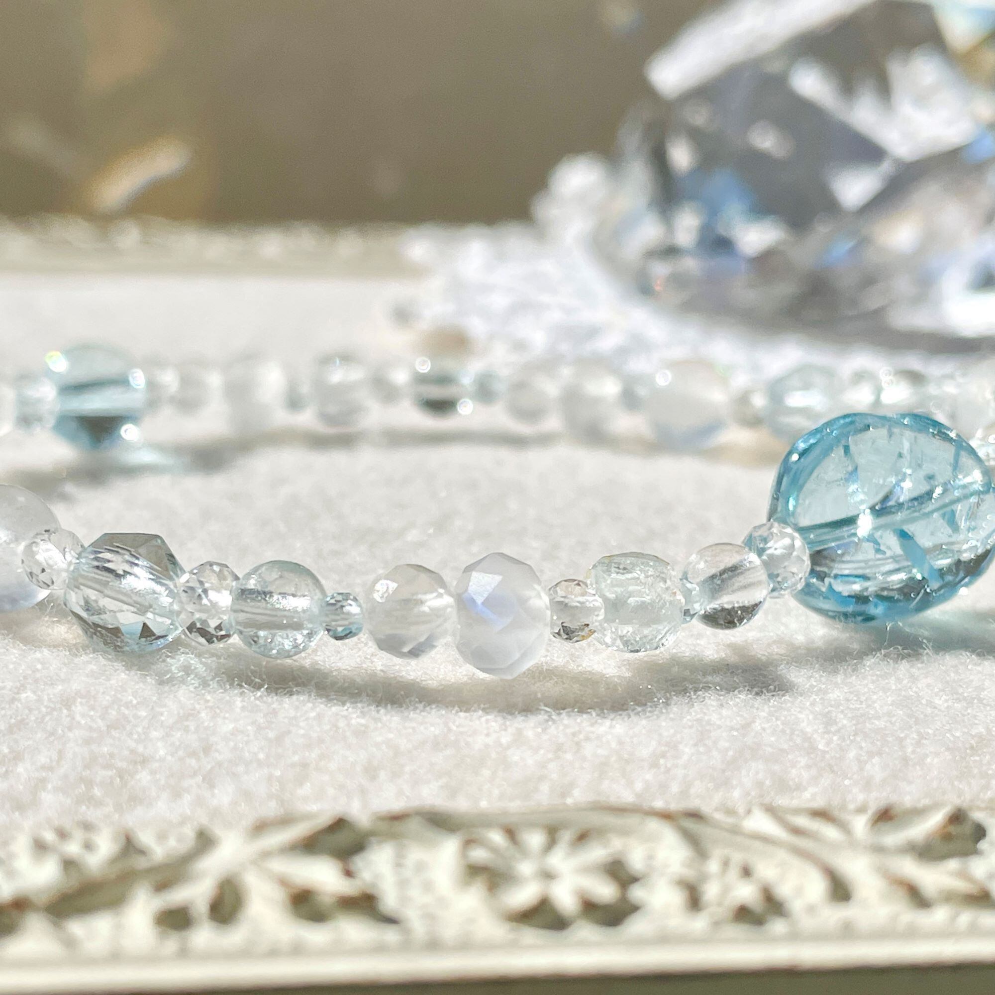 天然色のホワイトトパーズにはほんのりブルーの粒が含まれていることがあります。そんな淡いカラーも織り交ぜ全体に散りばめてバランスをとっています。