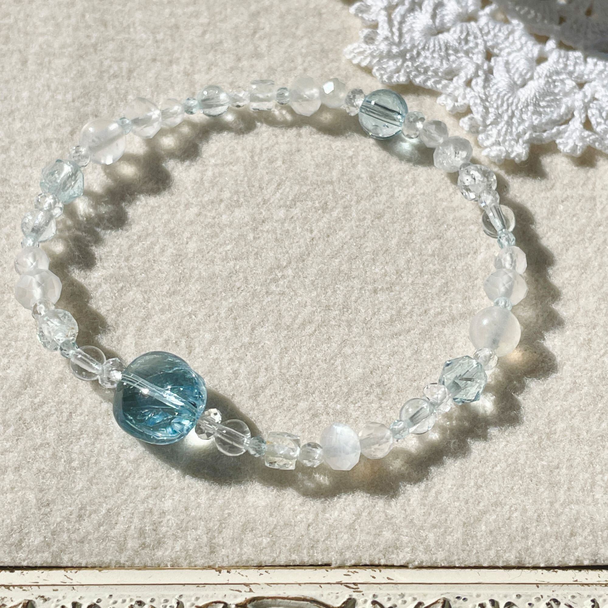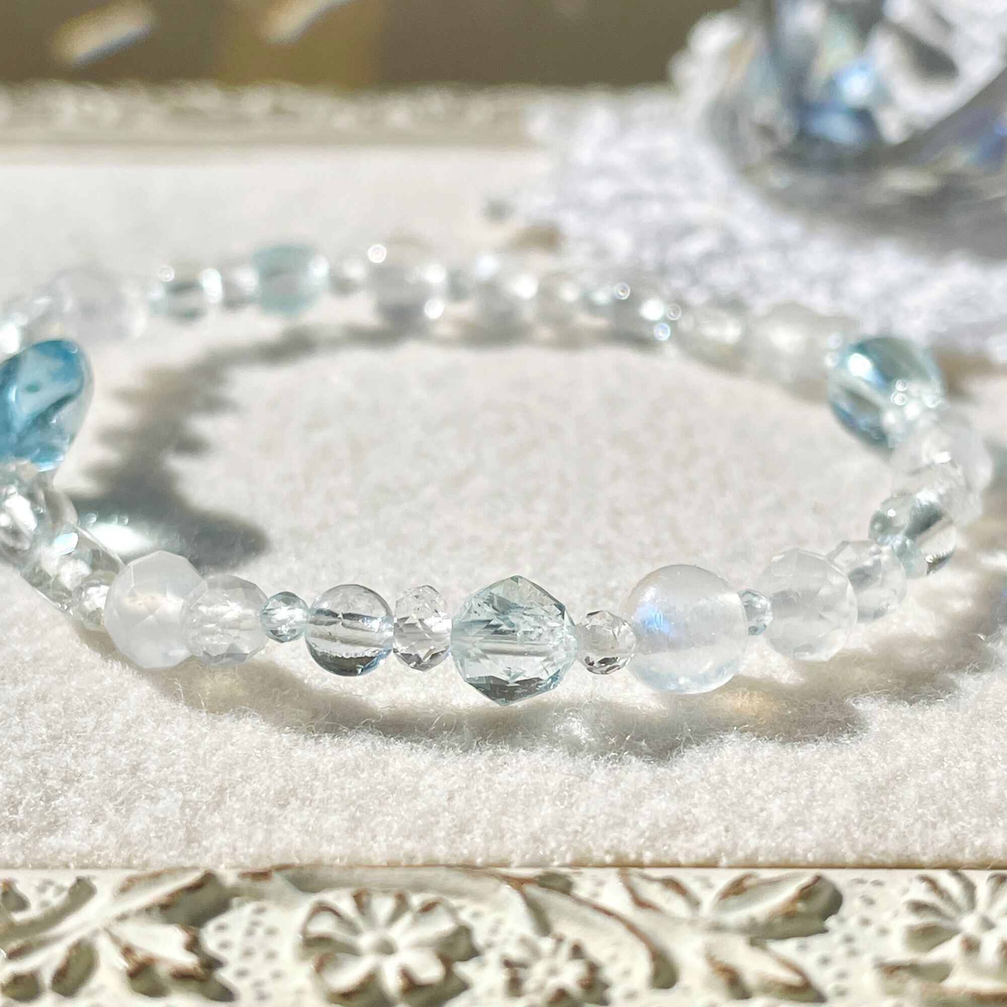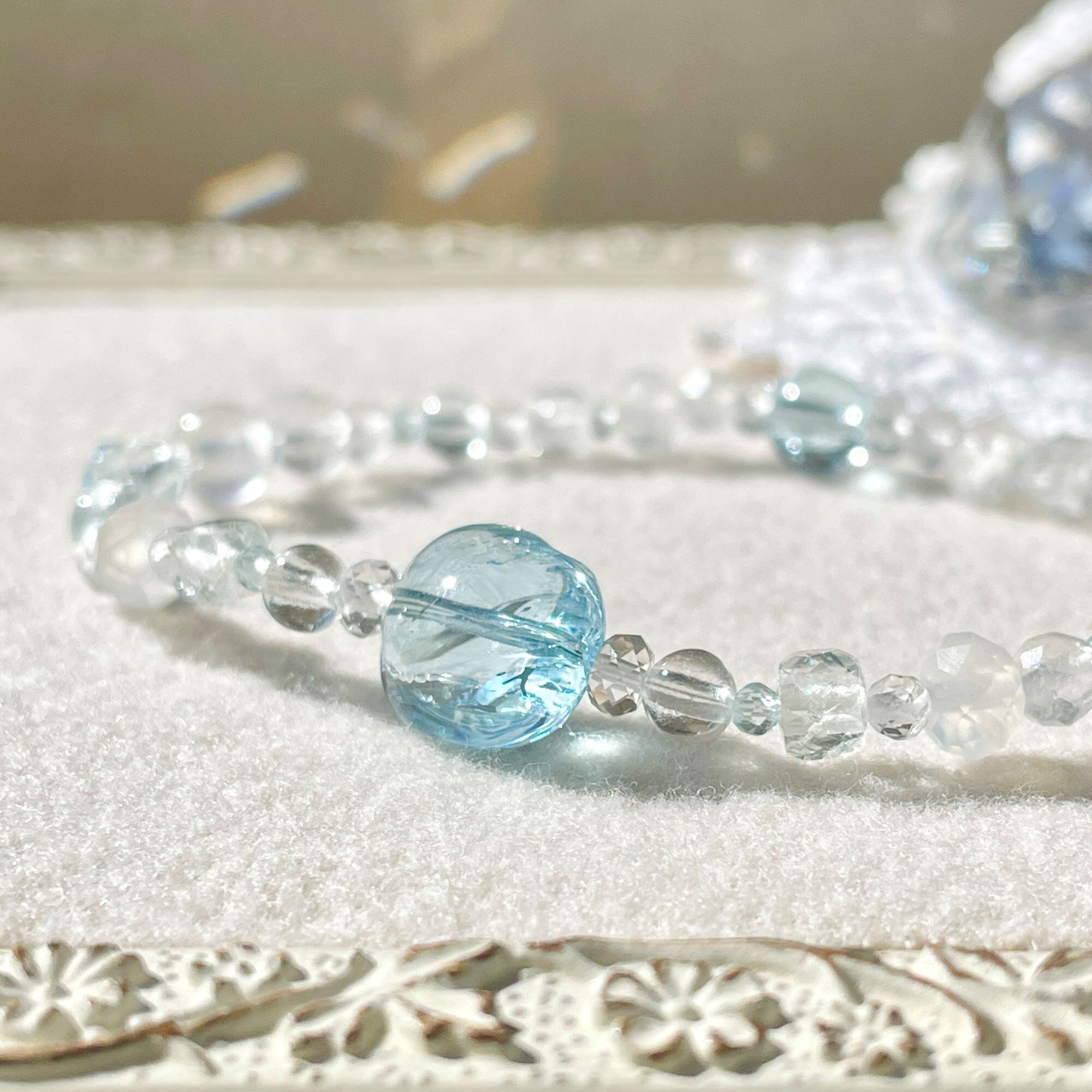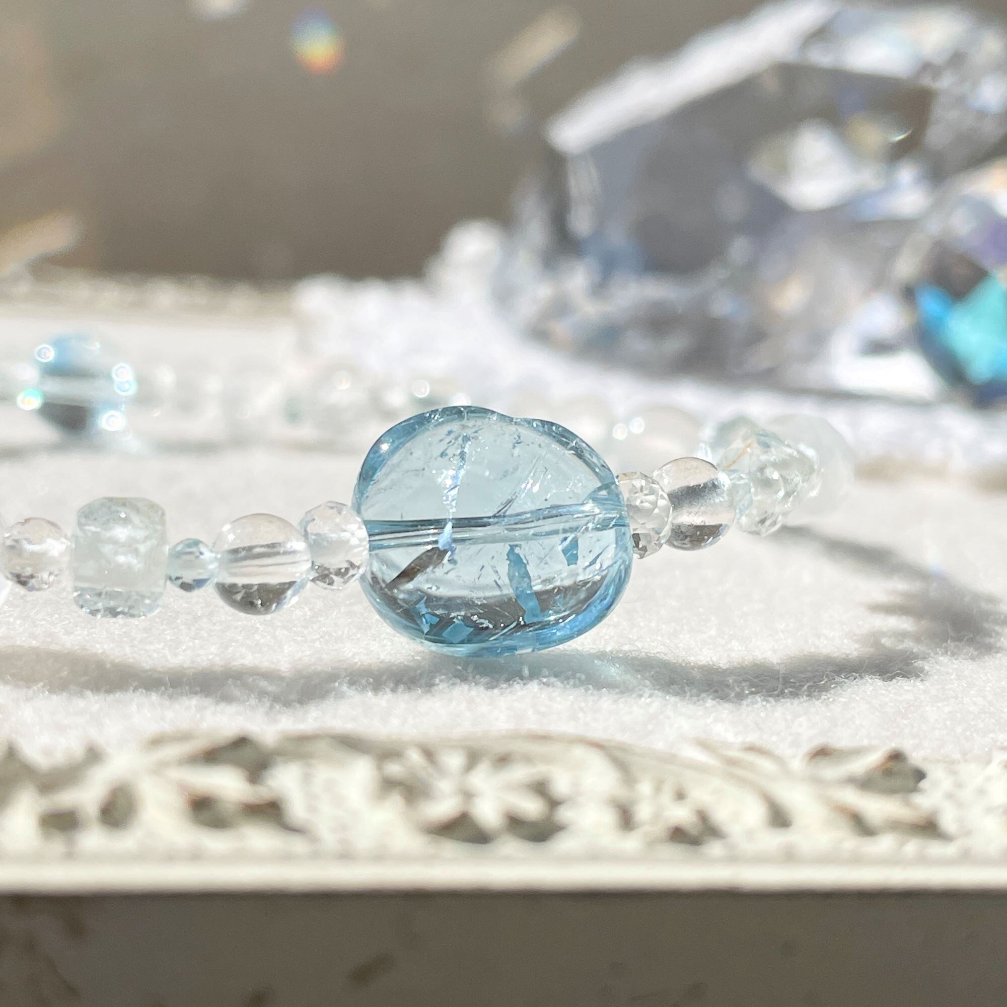 天然色のホワイトトパーズにはほんのりブルーの粒が含まれていることがあります。そんな淡いカラーも織り交ぜ全体に散りばめてバランスをとっています。