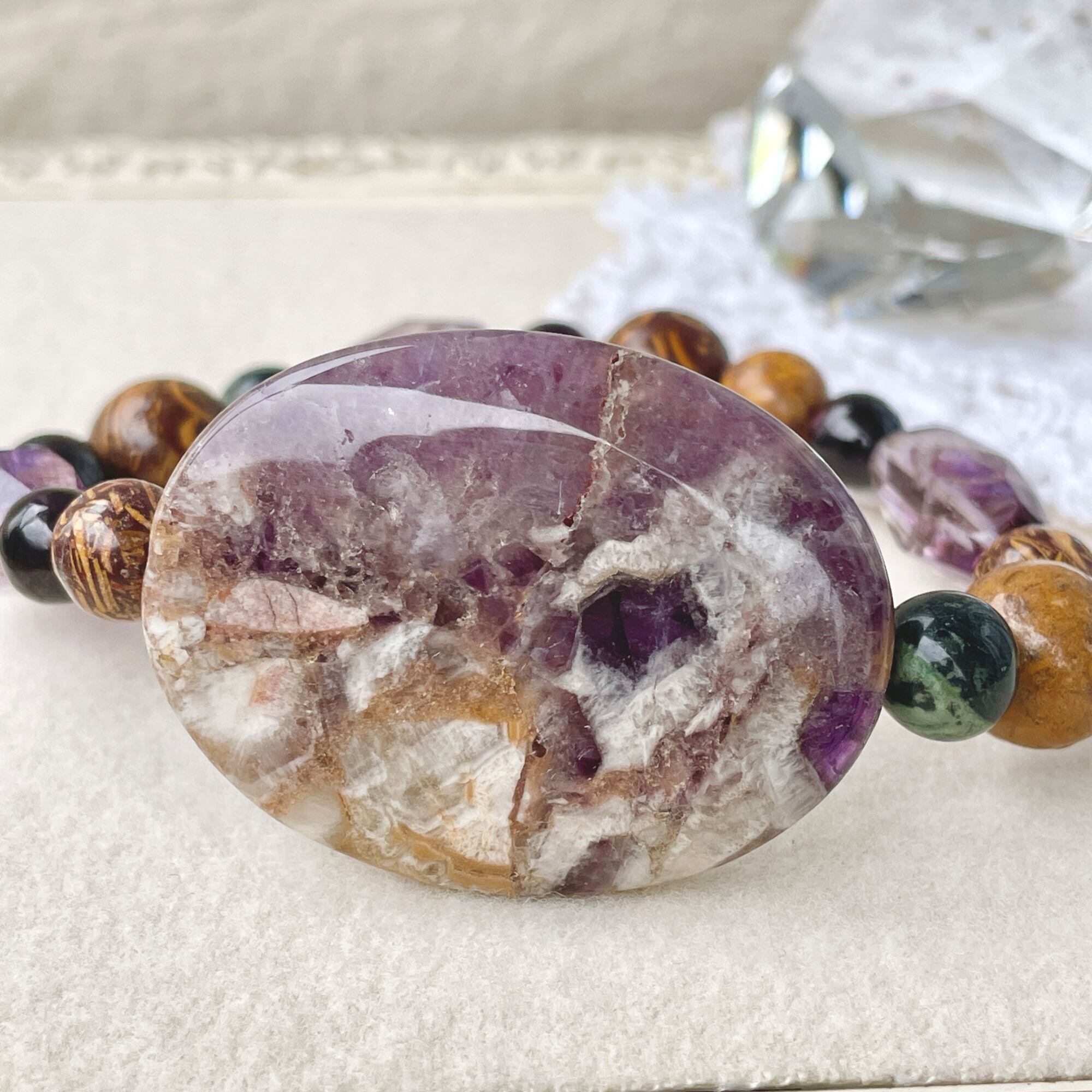 落ちついた紫色のアメシストに白(ミルキークォーツ)や金茶色の内包物が混ざり合っています。