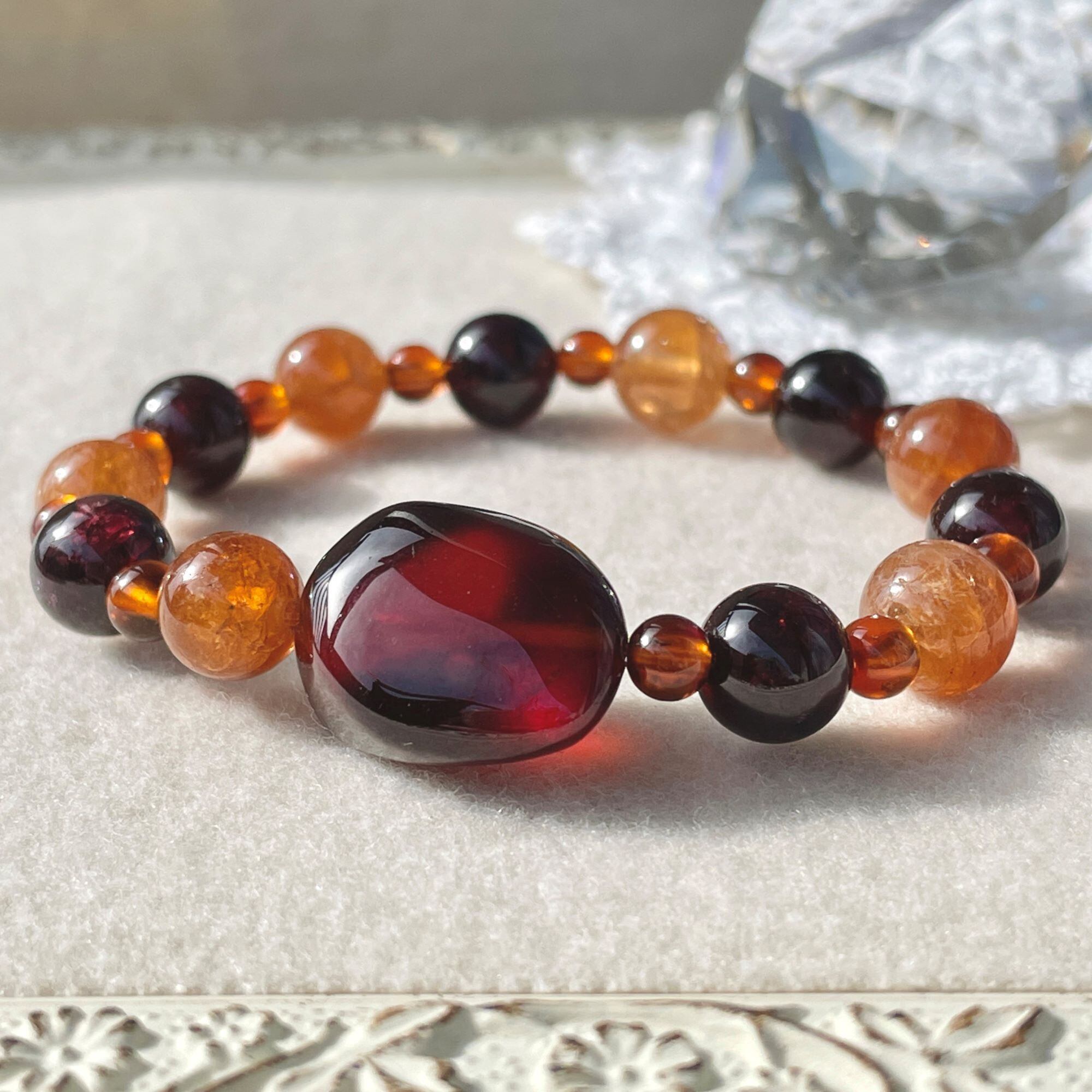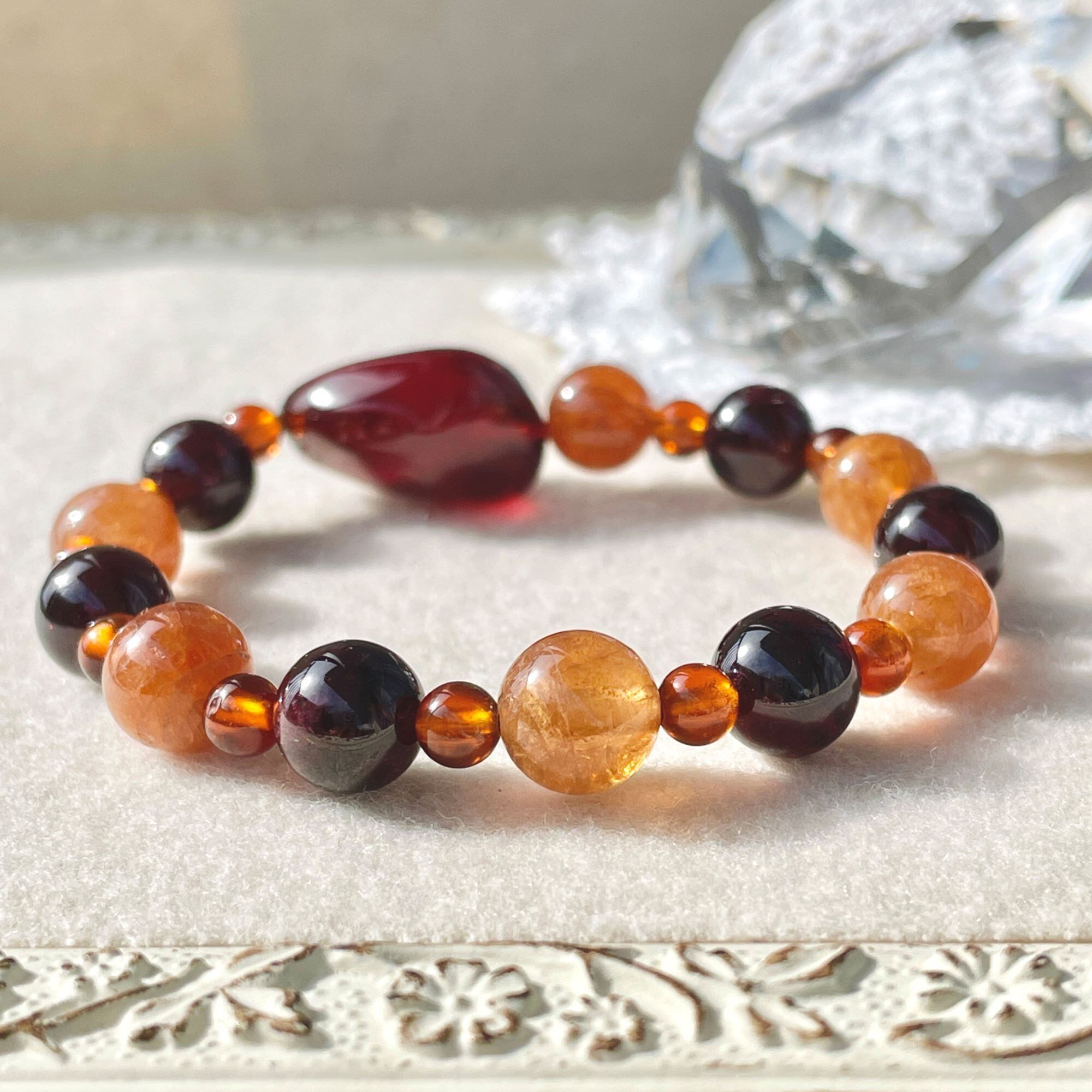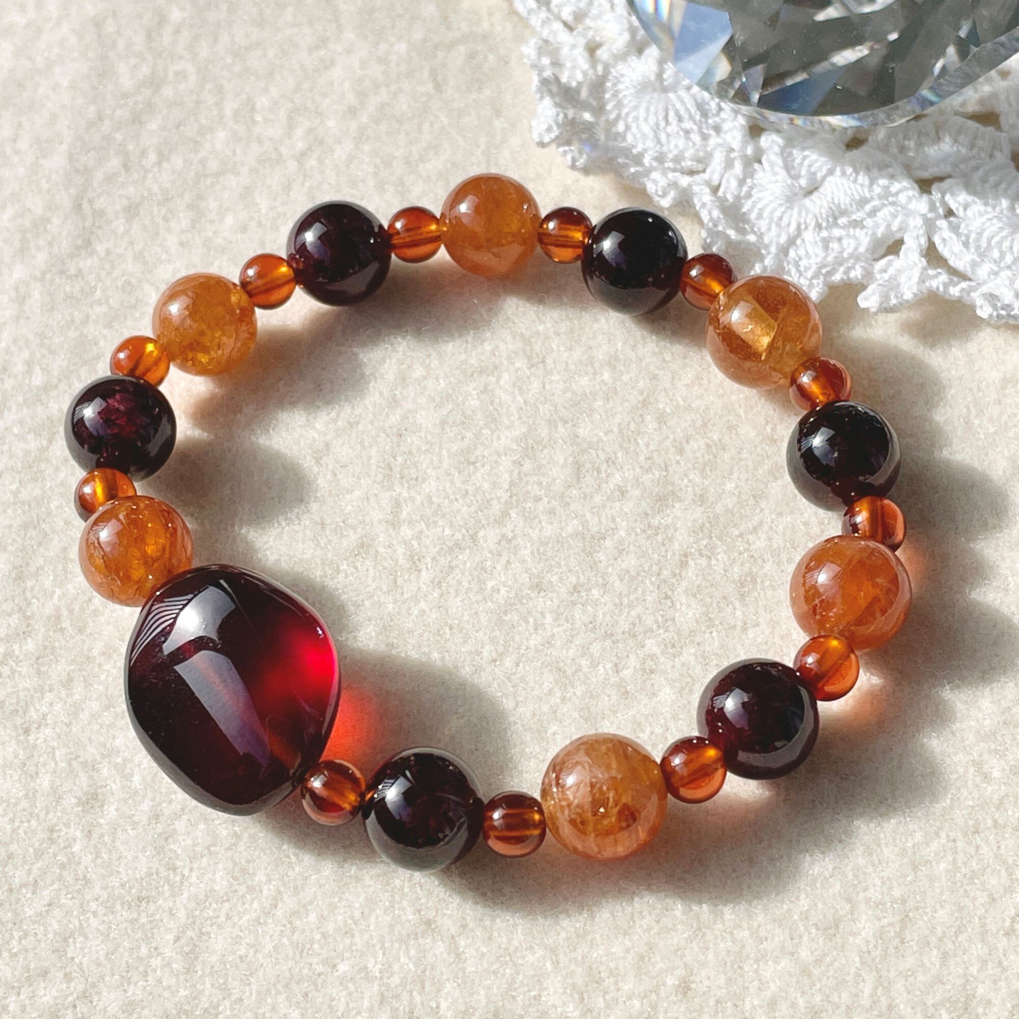 センターの色に合わせて、レッドガーネットの8mm玉を使い、全体を繋いでいます。