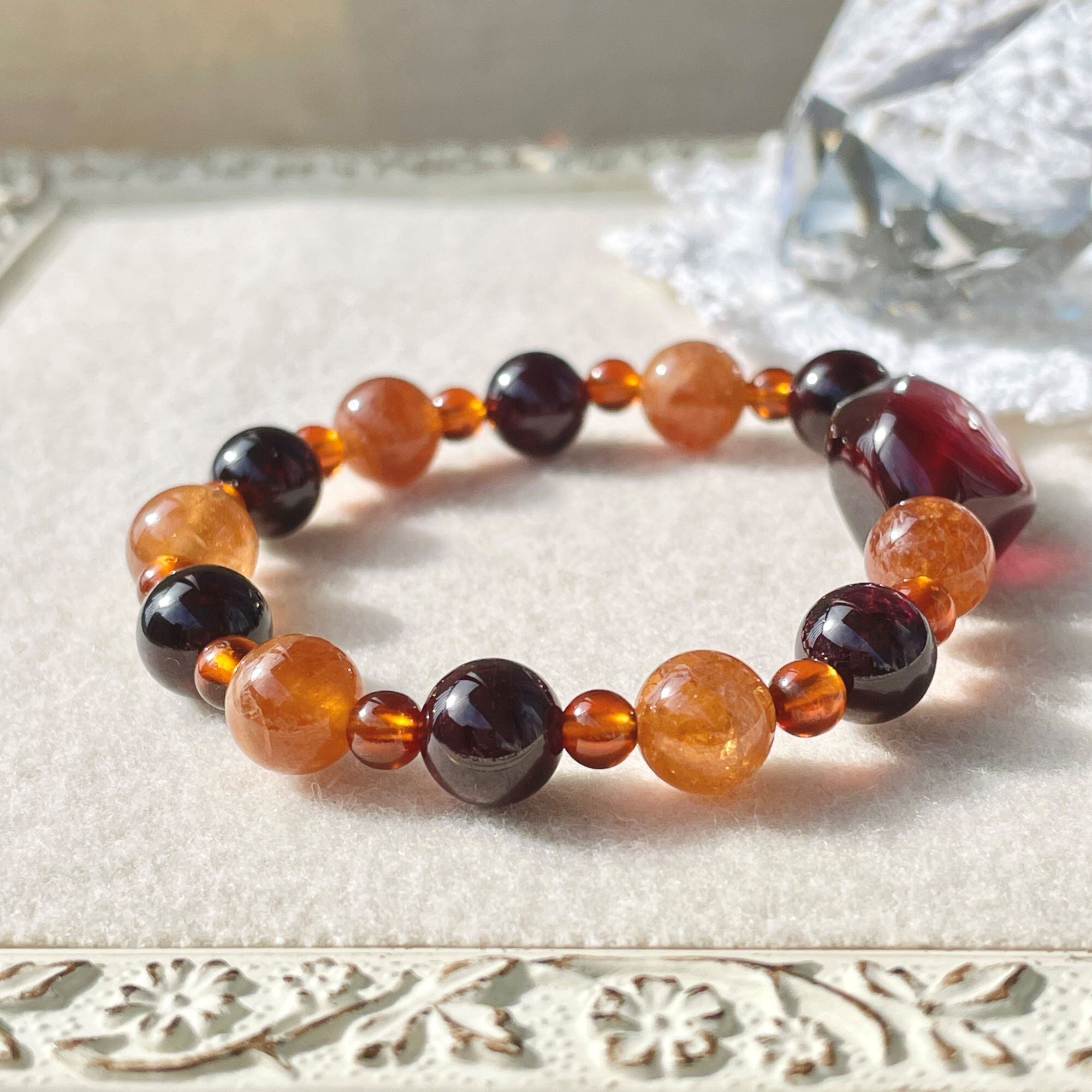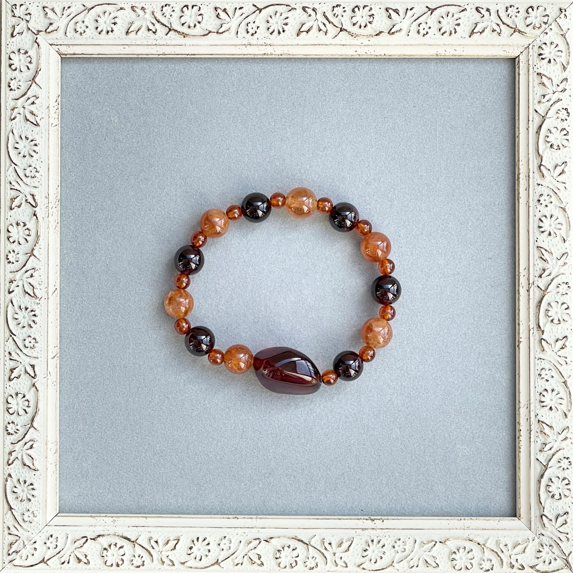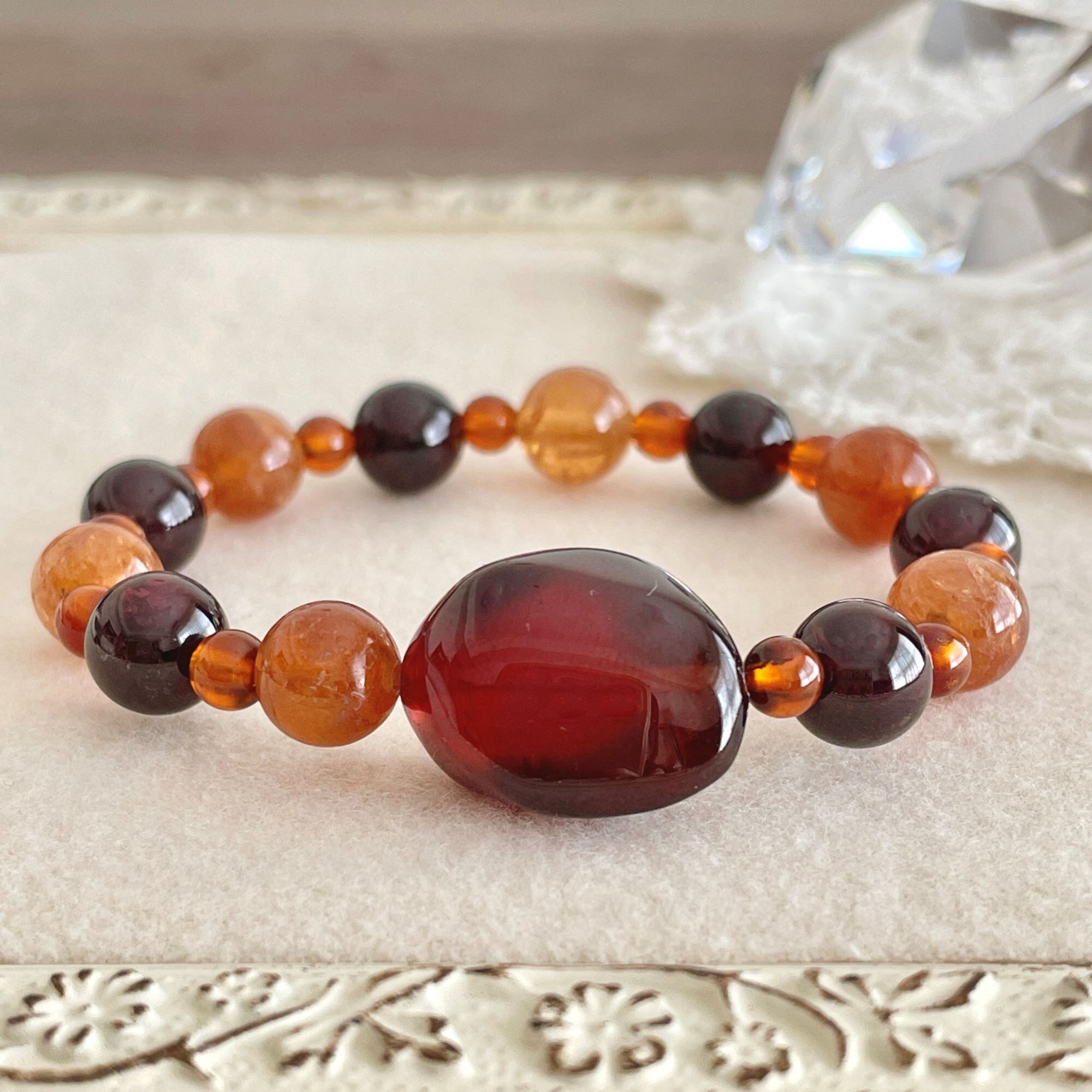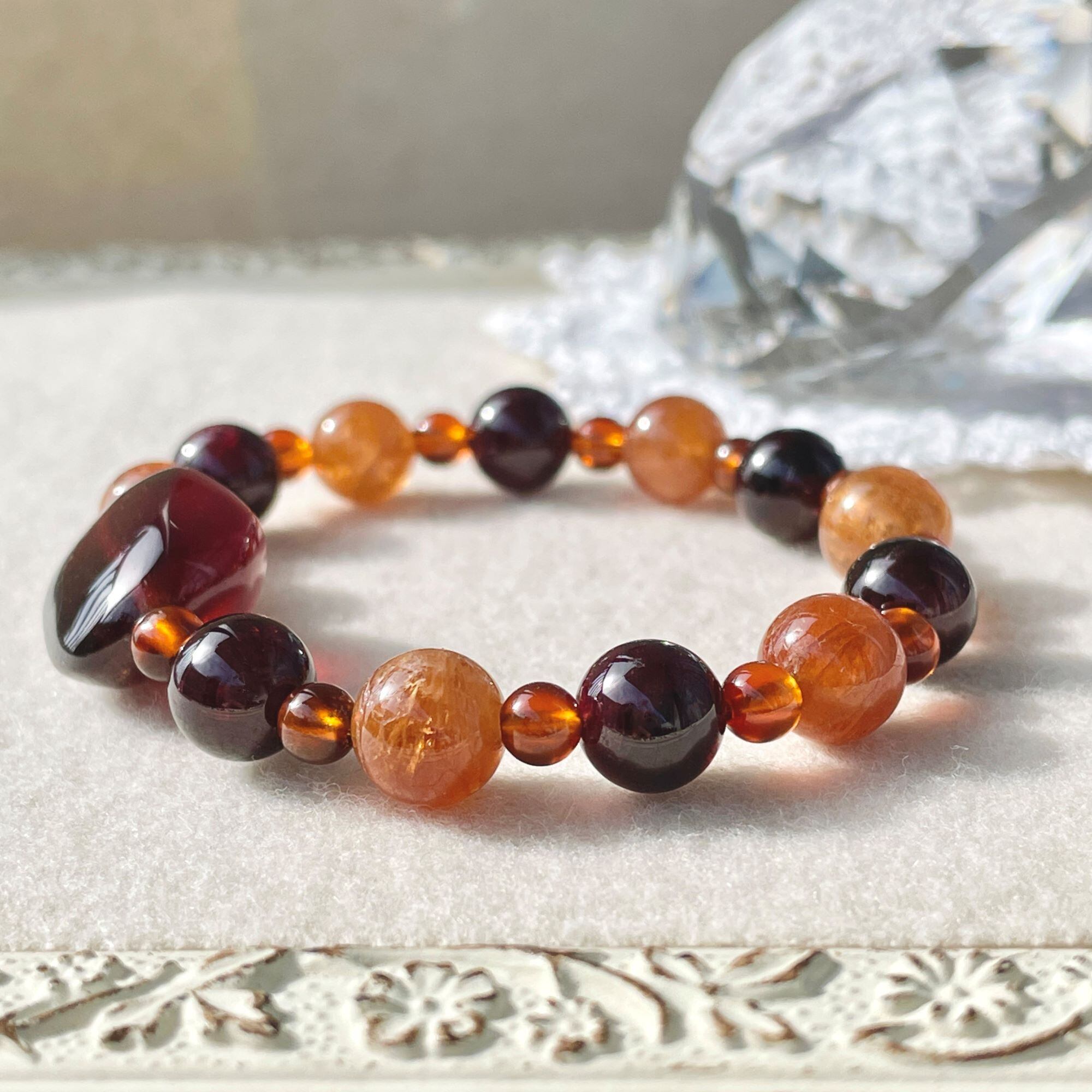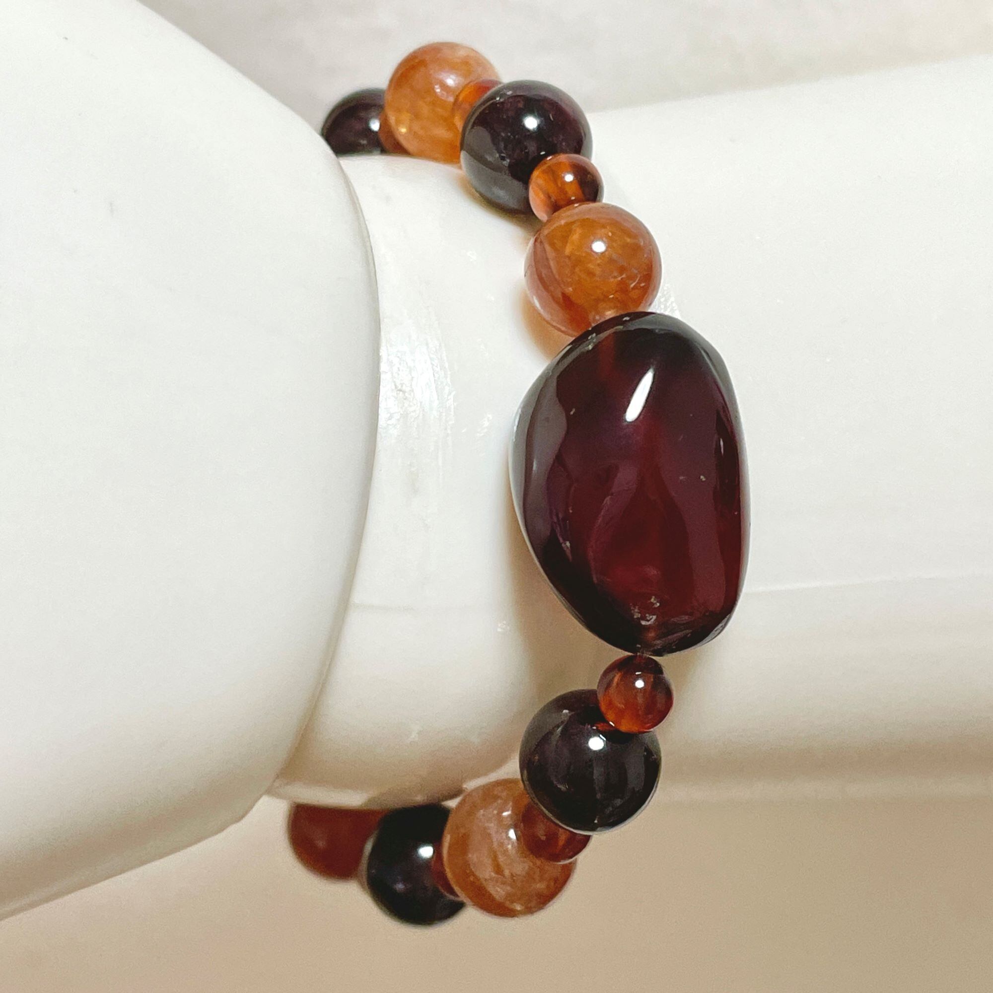 こちらはヘソナイトらしいオレンジ系の茶色です。8mm玉にはクラックがあり、小さな光のきらめきが楽しめます。