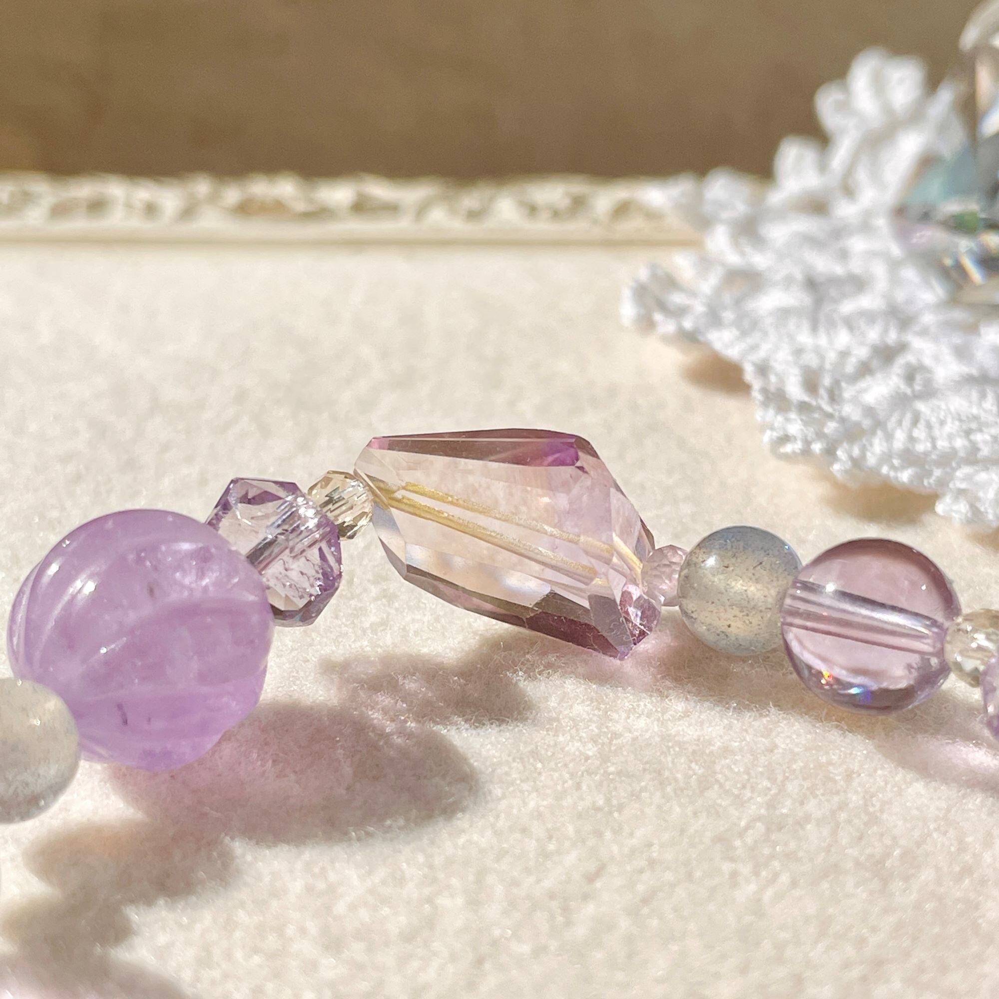 それらを繋いだ小さな石は、ラベンダーアメシスト、ラブラドライト、シトリンを使い、全体をまとめています。