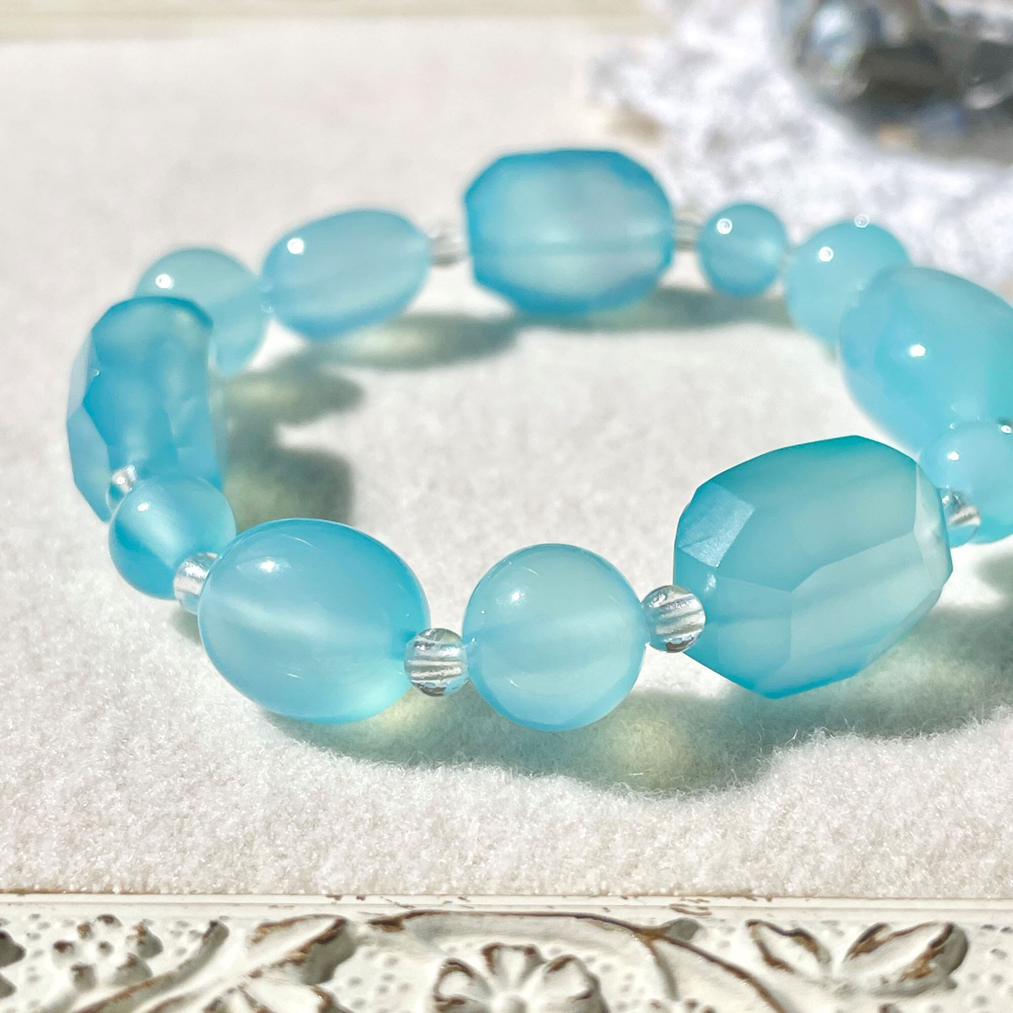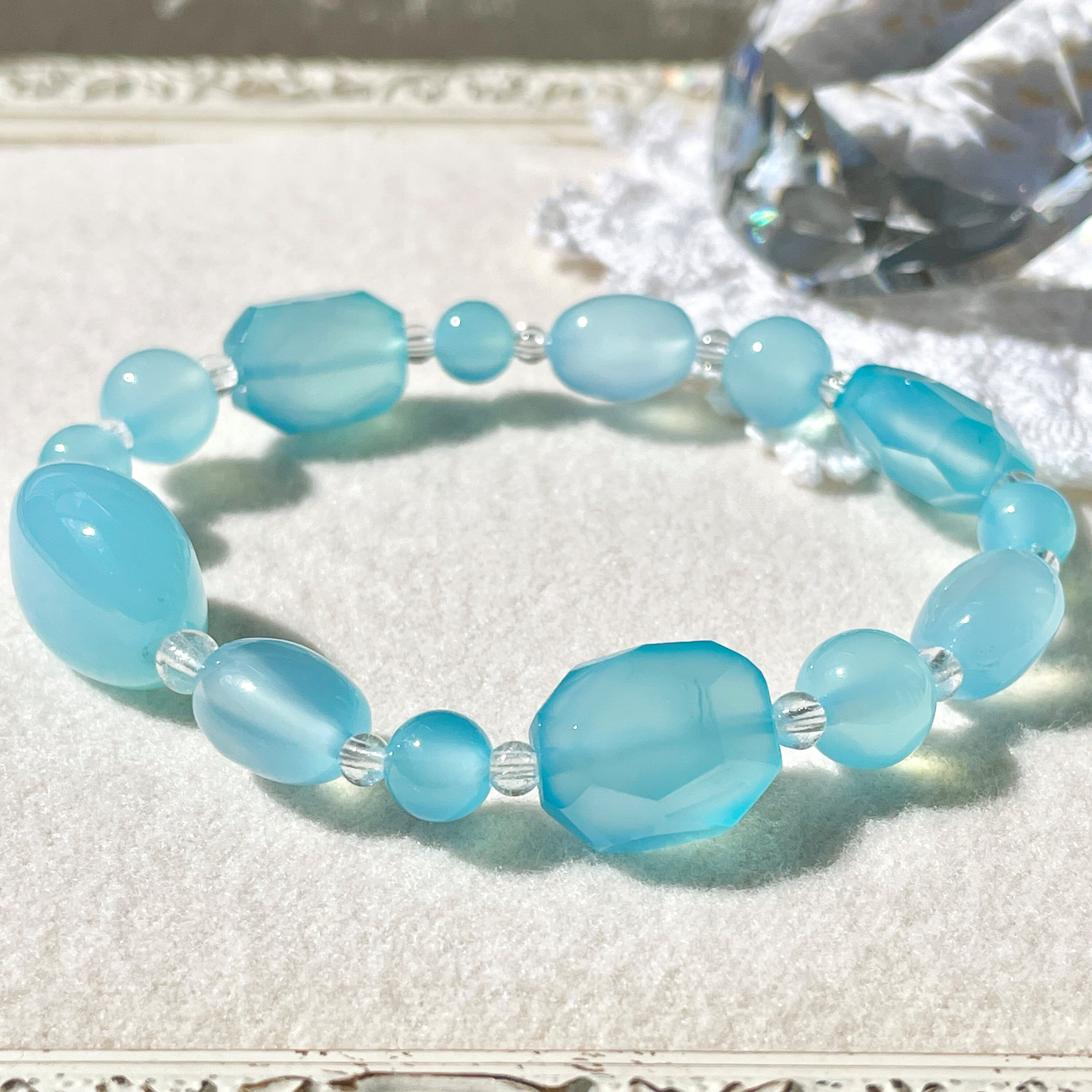 とろみのある半透明なカルセドニーに爽やかなブルーの染色が施されたもので、カルセドニーの中でも人気のある石です。