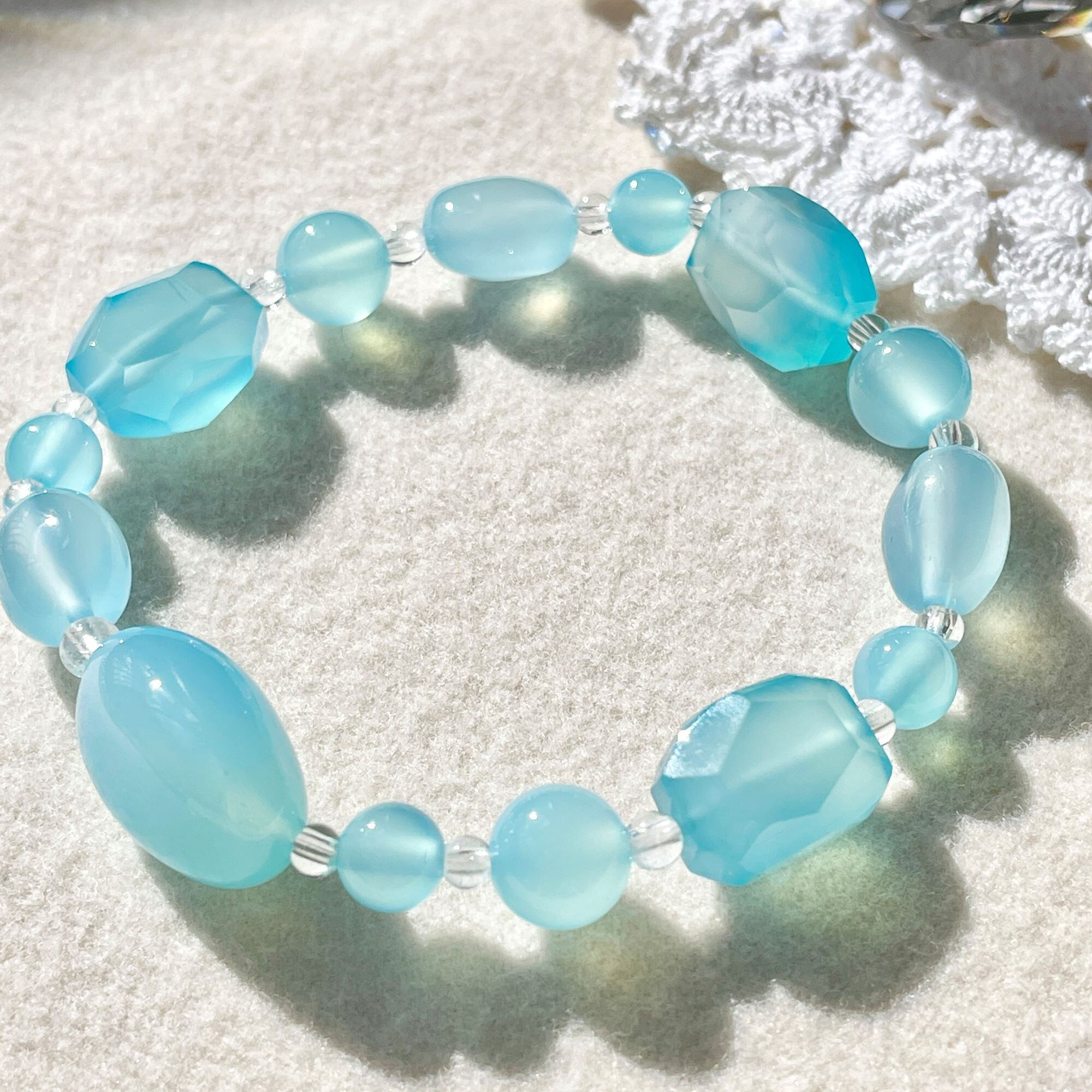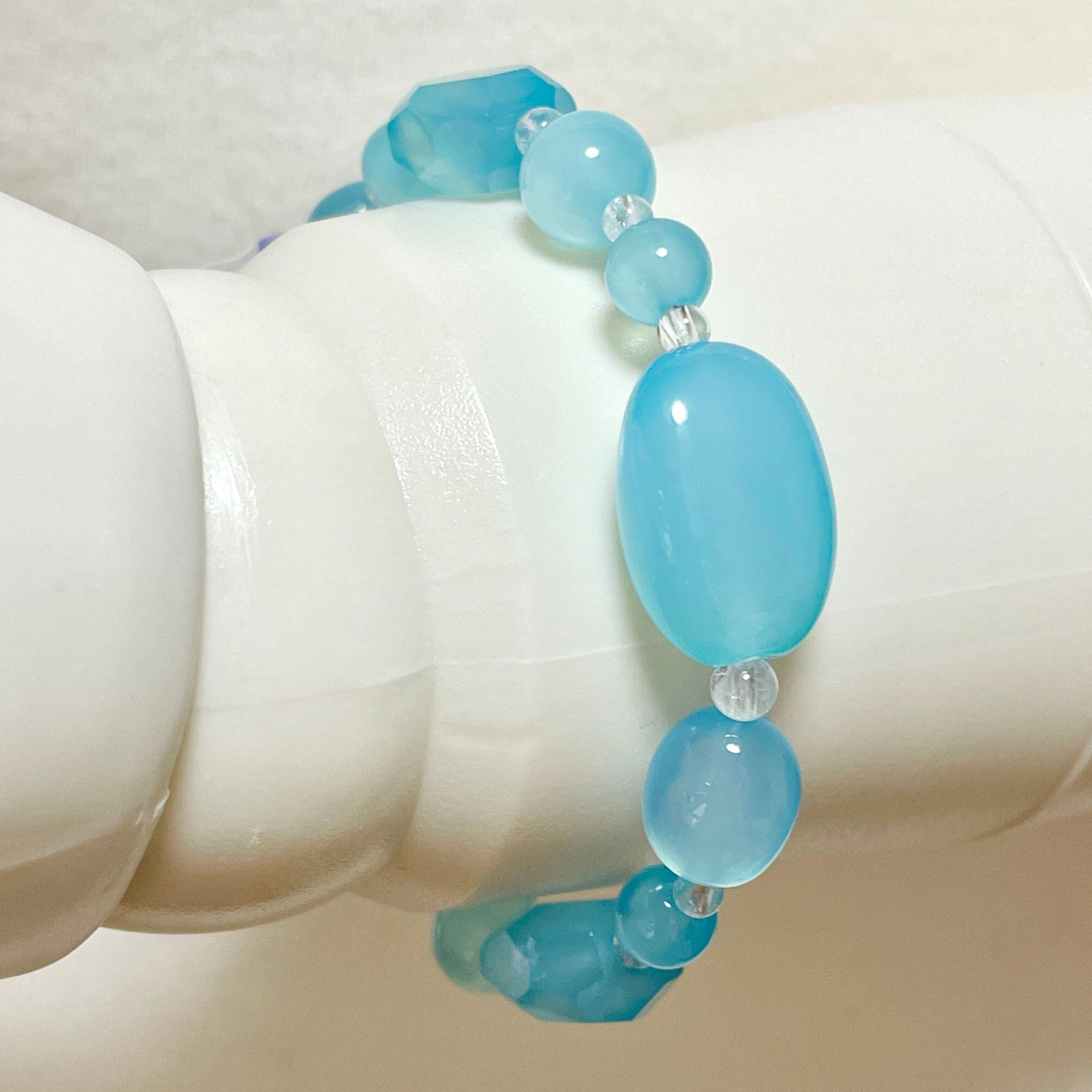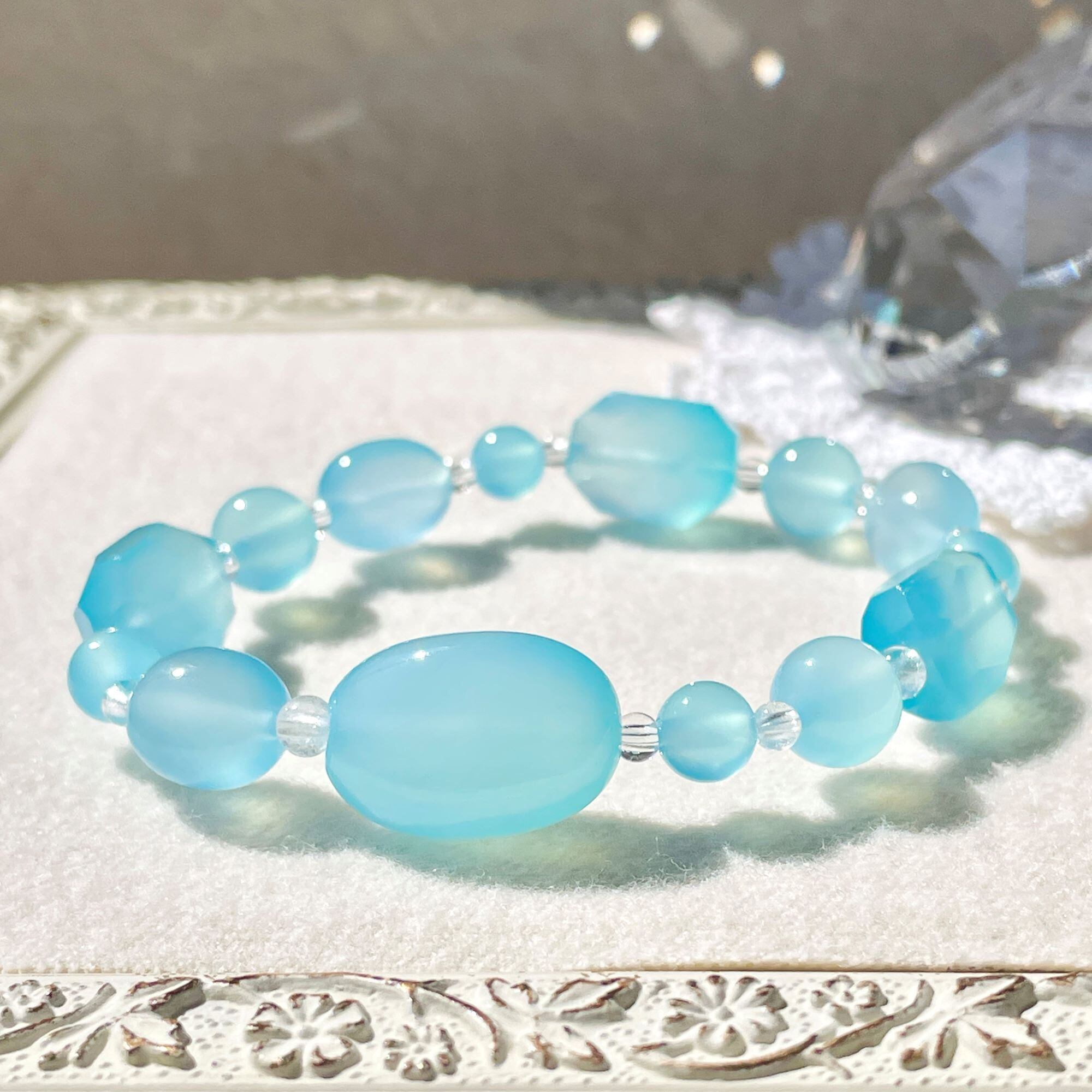 とろみのある半透明なカルセドニーに爽やかなブルーの染色が施されたもので、カルセドニーの中でも人気のある石です。