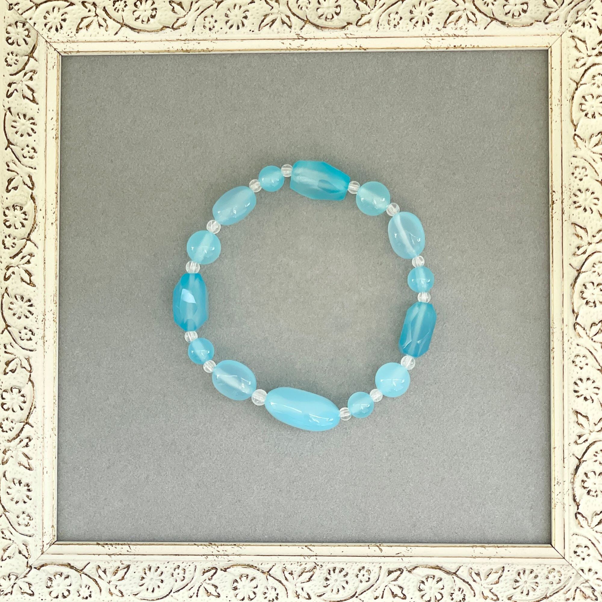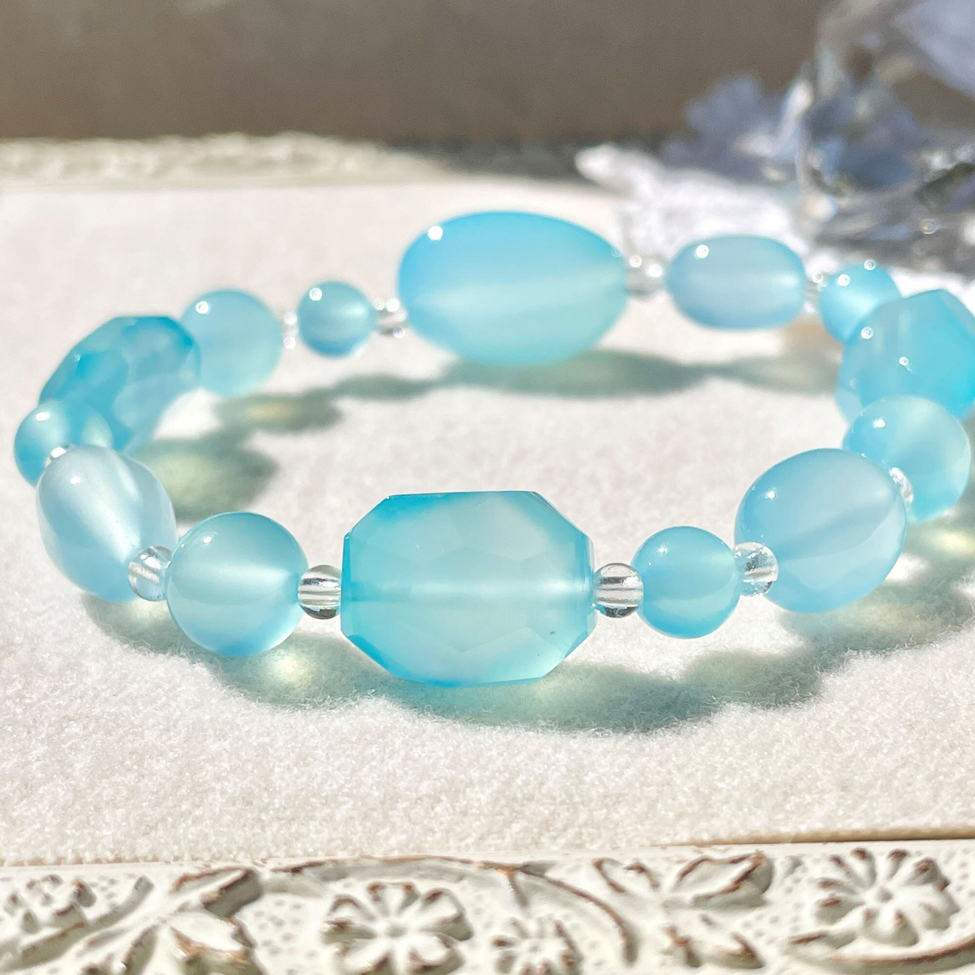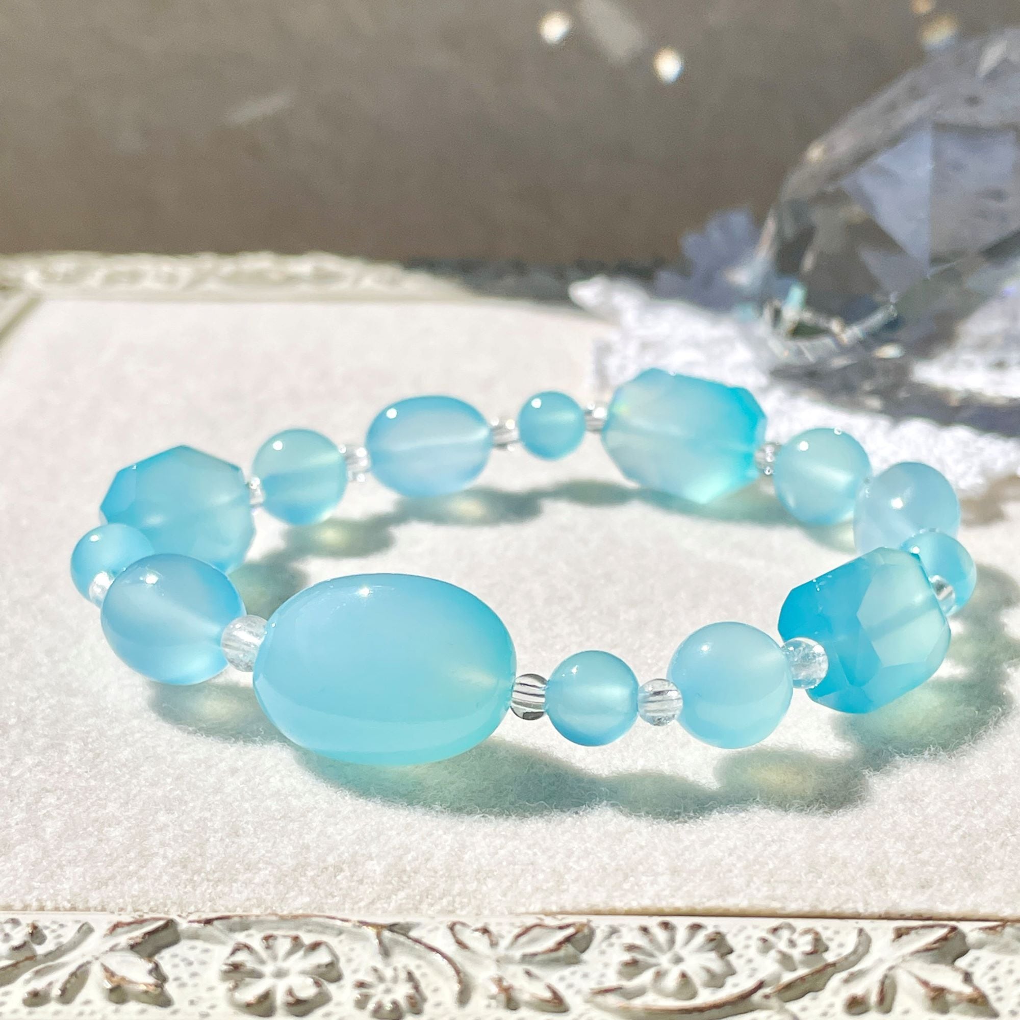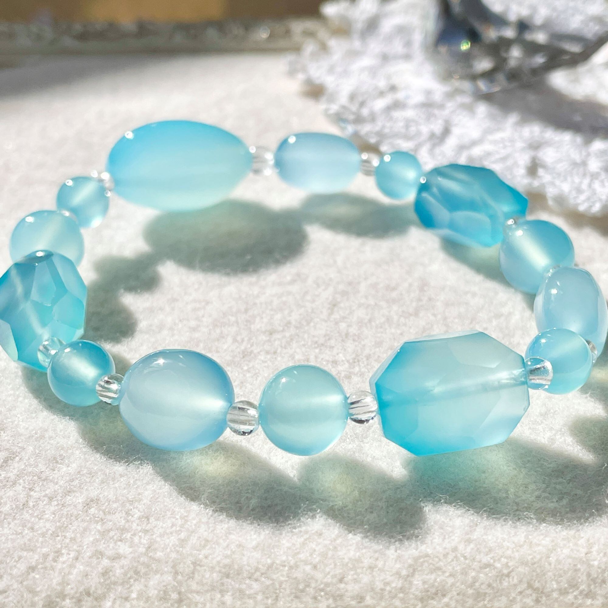 とろみのある半透明なカルセドニーに爽やかなブルーの染色が施されたもので、カルセドニーの中でも人気のある石です。