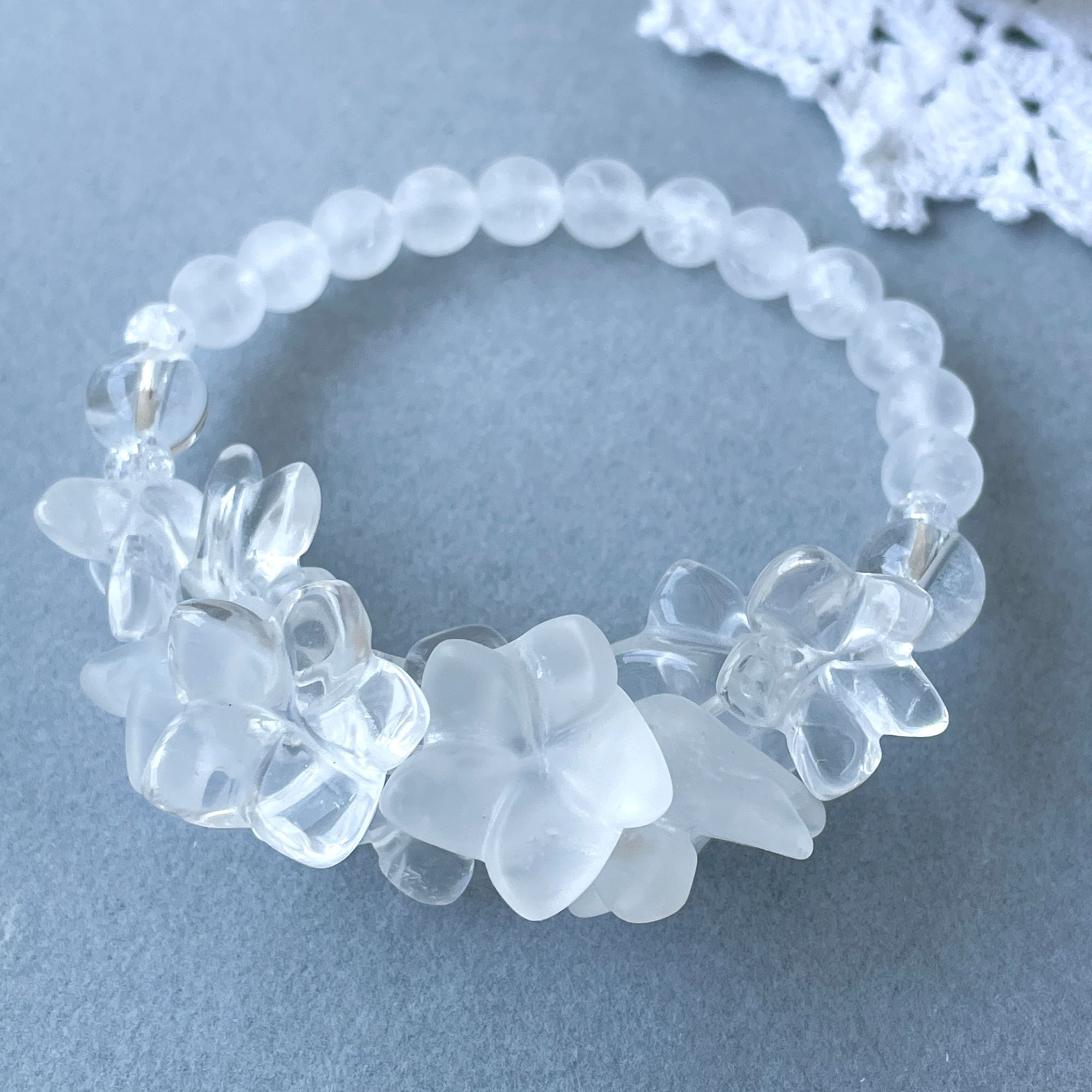 お花のカービングビーズ約15mmの5弁花は、つや消し加工を施されたフロストクリスタルも使い、涼しげで優しい表情になりました。