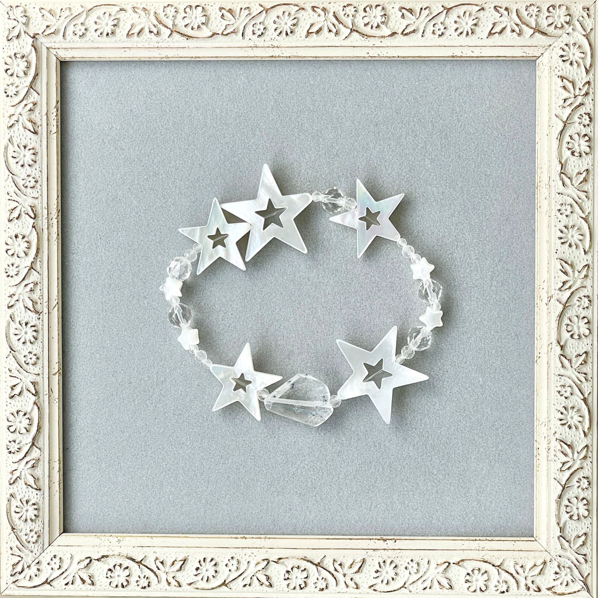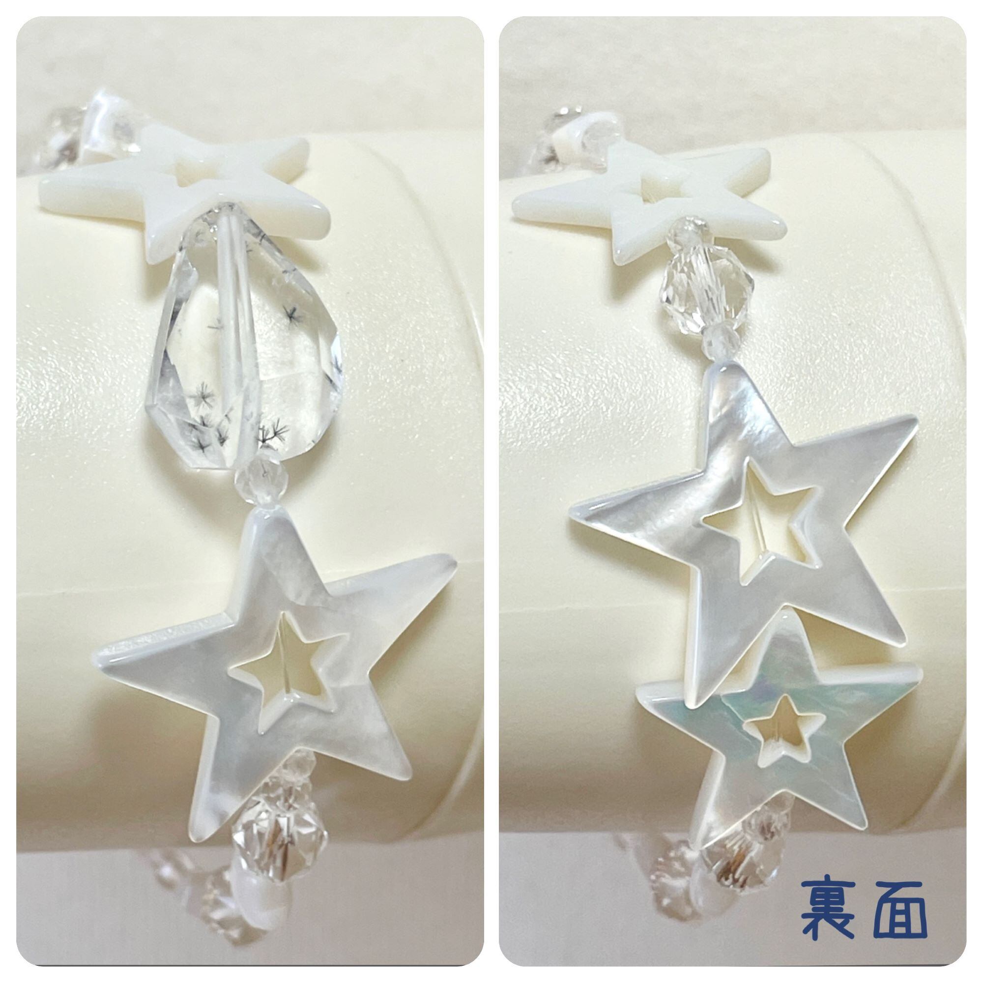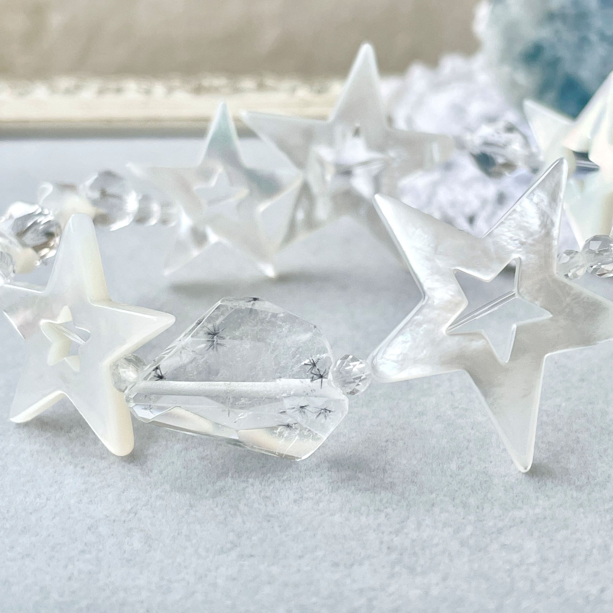 大小の星型のホワイトシェルと水晶で構成し、その中に星入り水晶(ホーランダイトinクォーツ)も1石入れて、星でいっぱいにしてみました(^-^)
