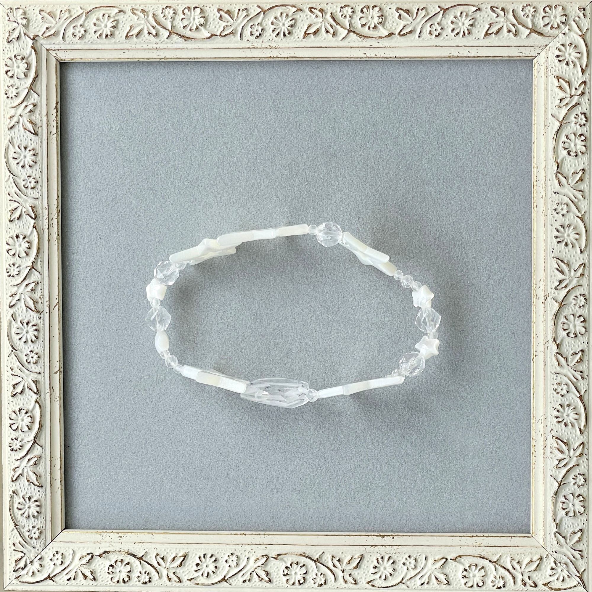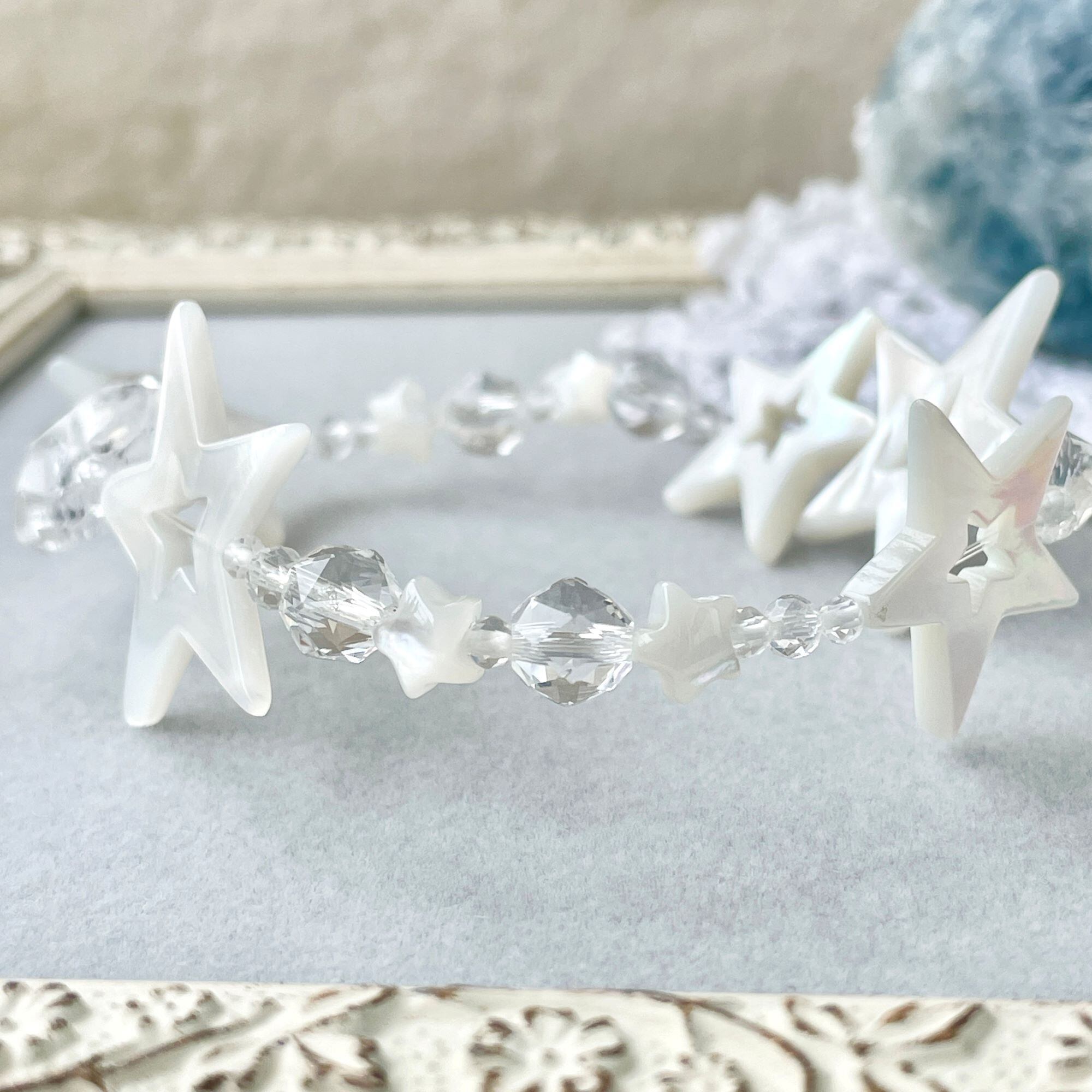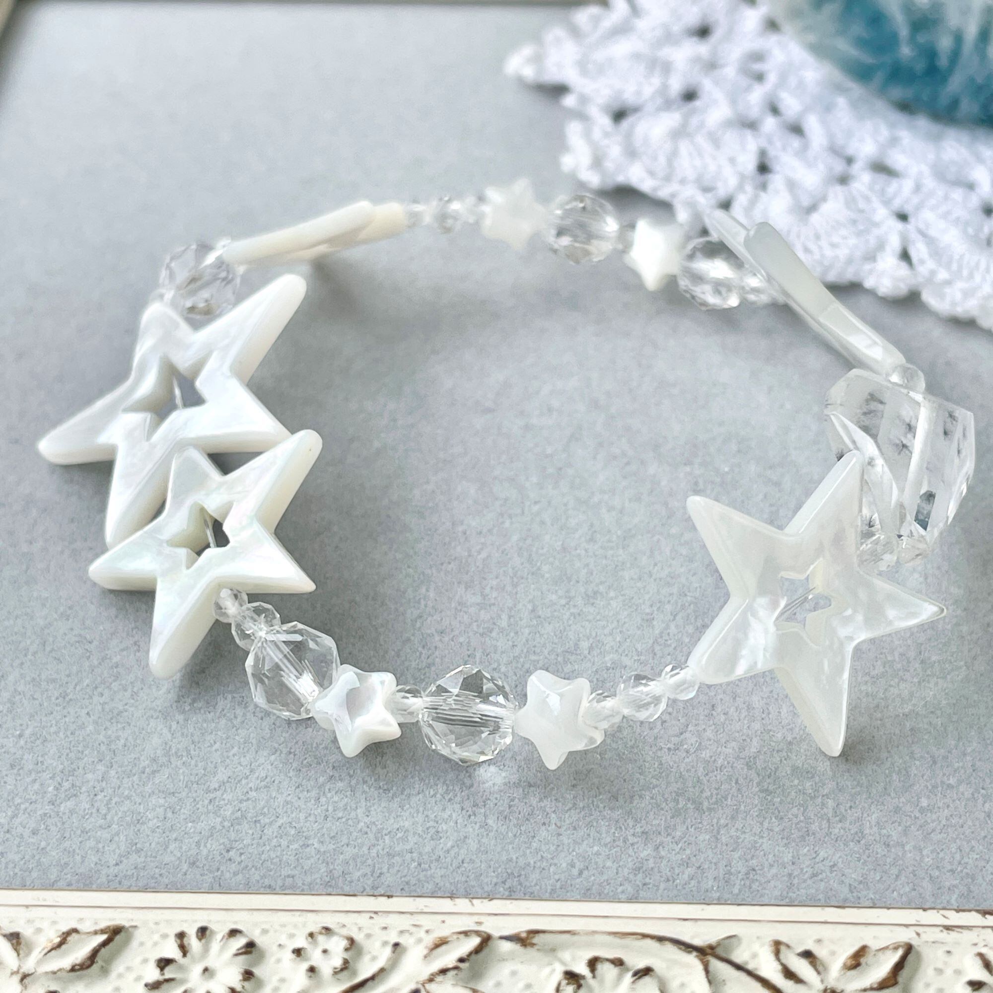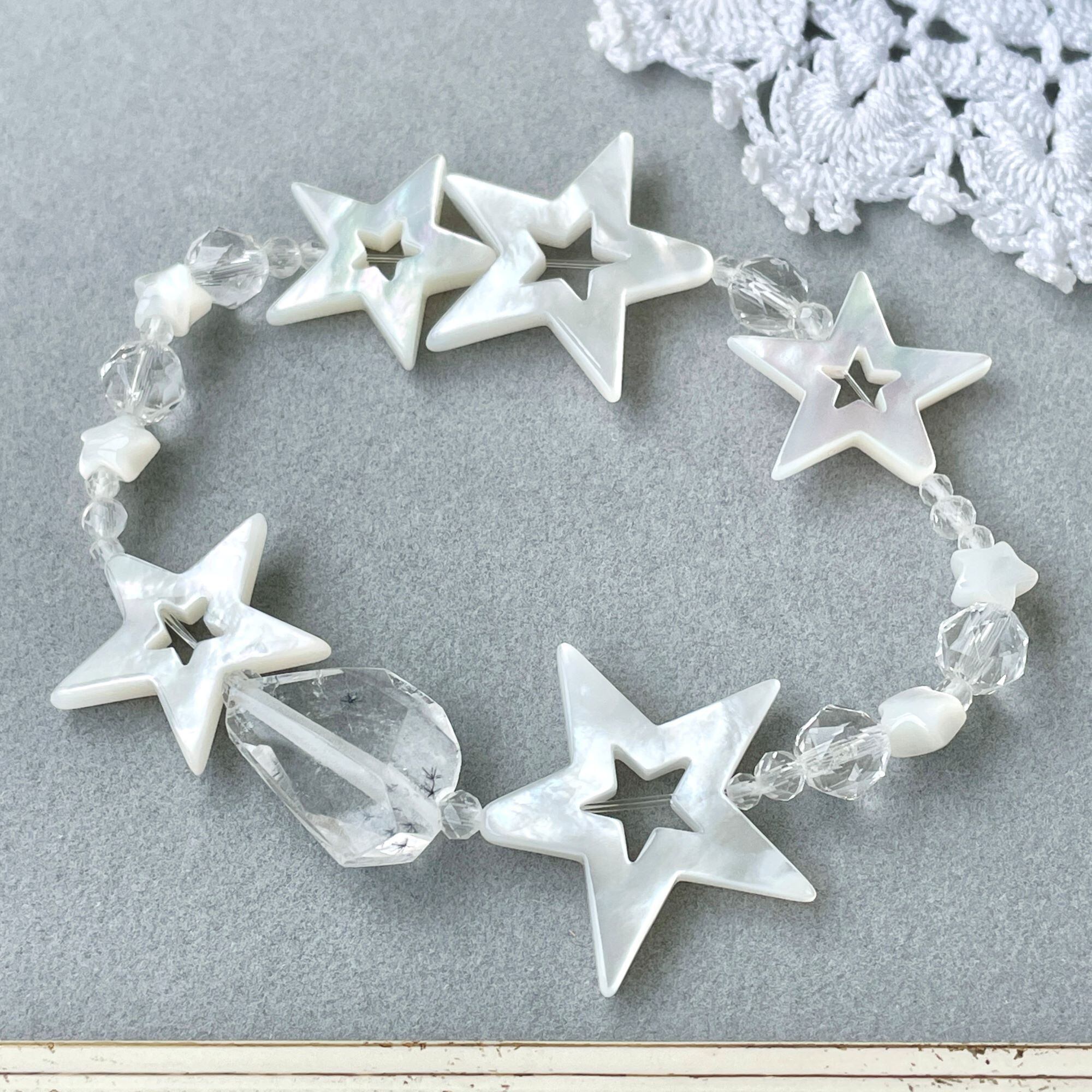 大小の星型のホワイトシェルと水晶で構成し、その中に星入り水晶(ホーランダイトinクォーツ)も1石入れて、星でいっぱいにしてみました(^-^)