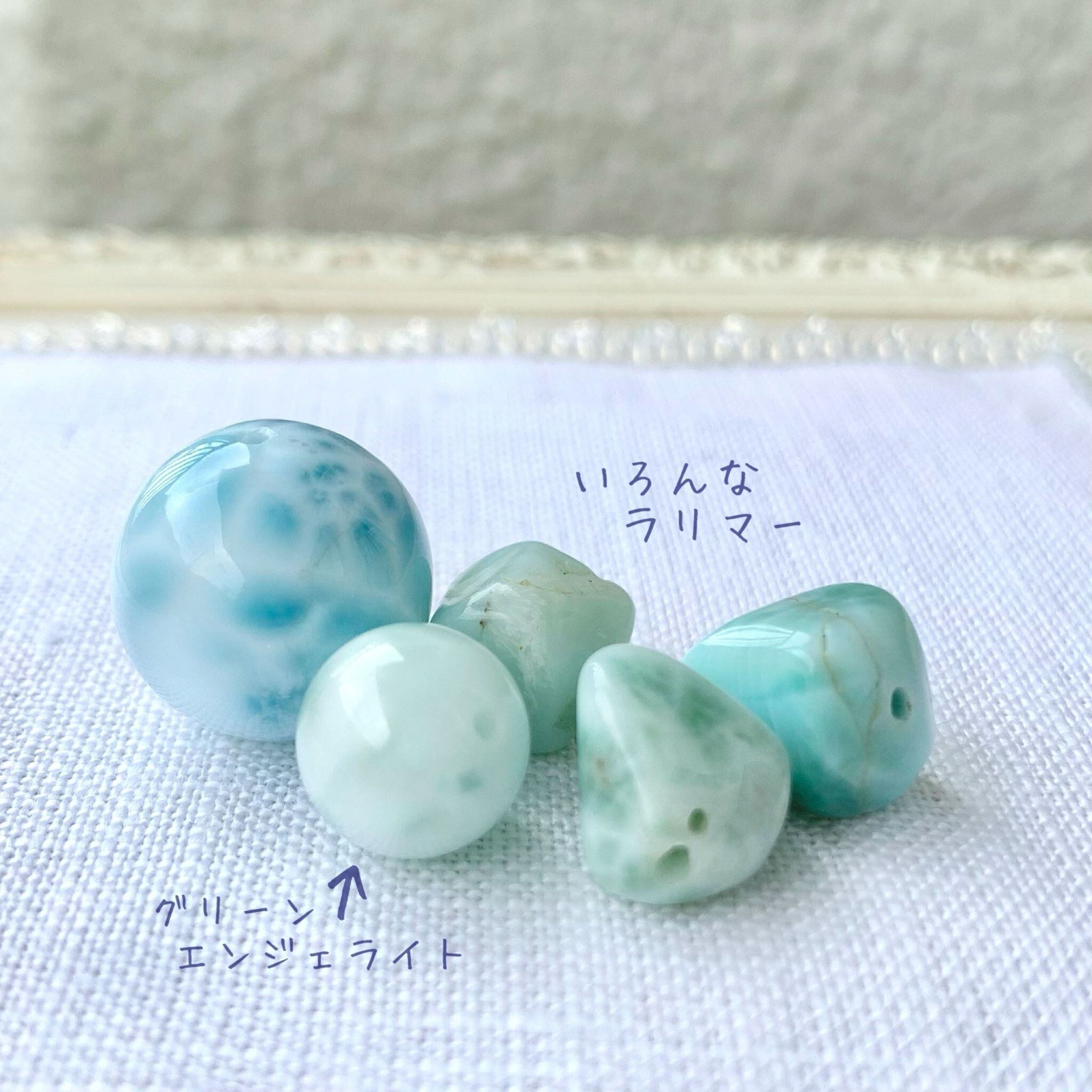 エンジェライトと名が付いていますが、これらはロシア製の人工石です。ニュアンスのある淡いグリーンと白の混じり合う様はどこかラリマーを思わせます。