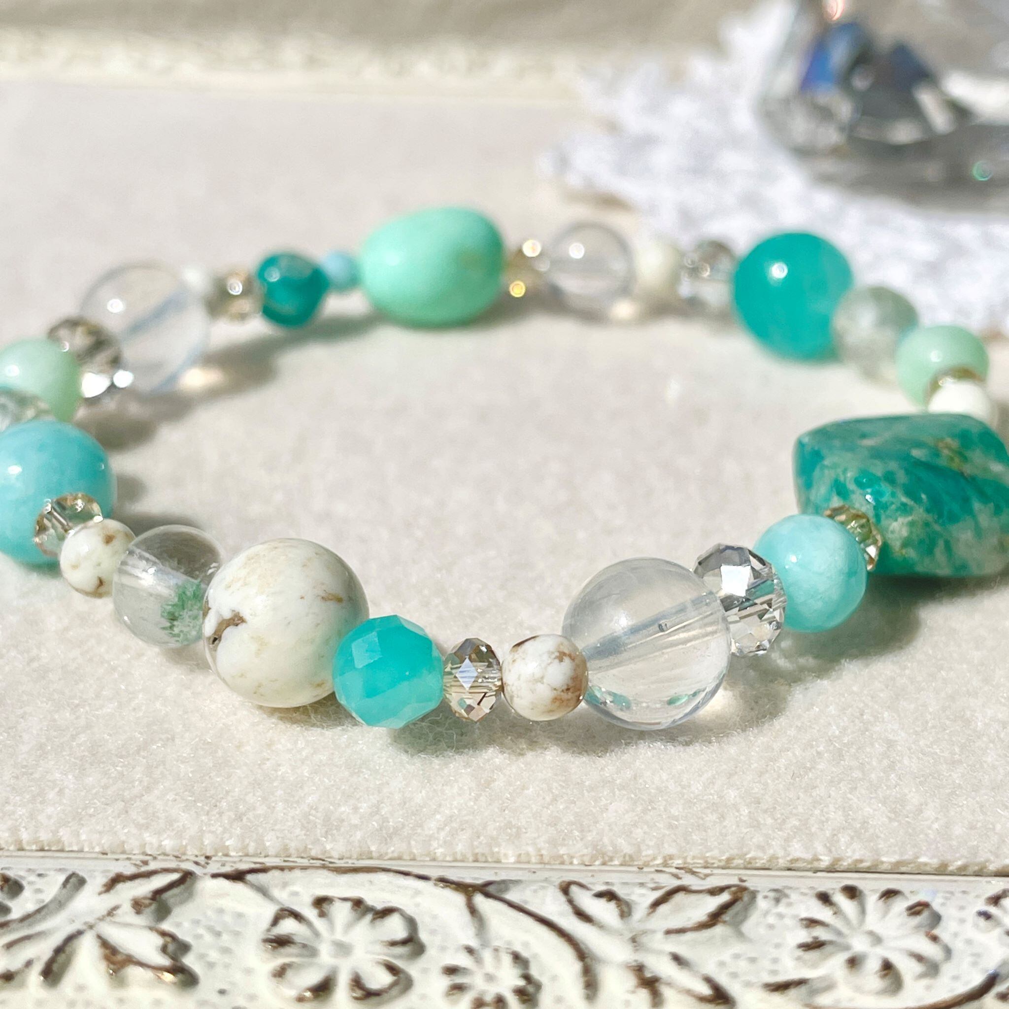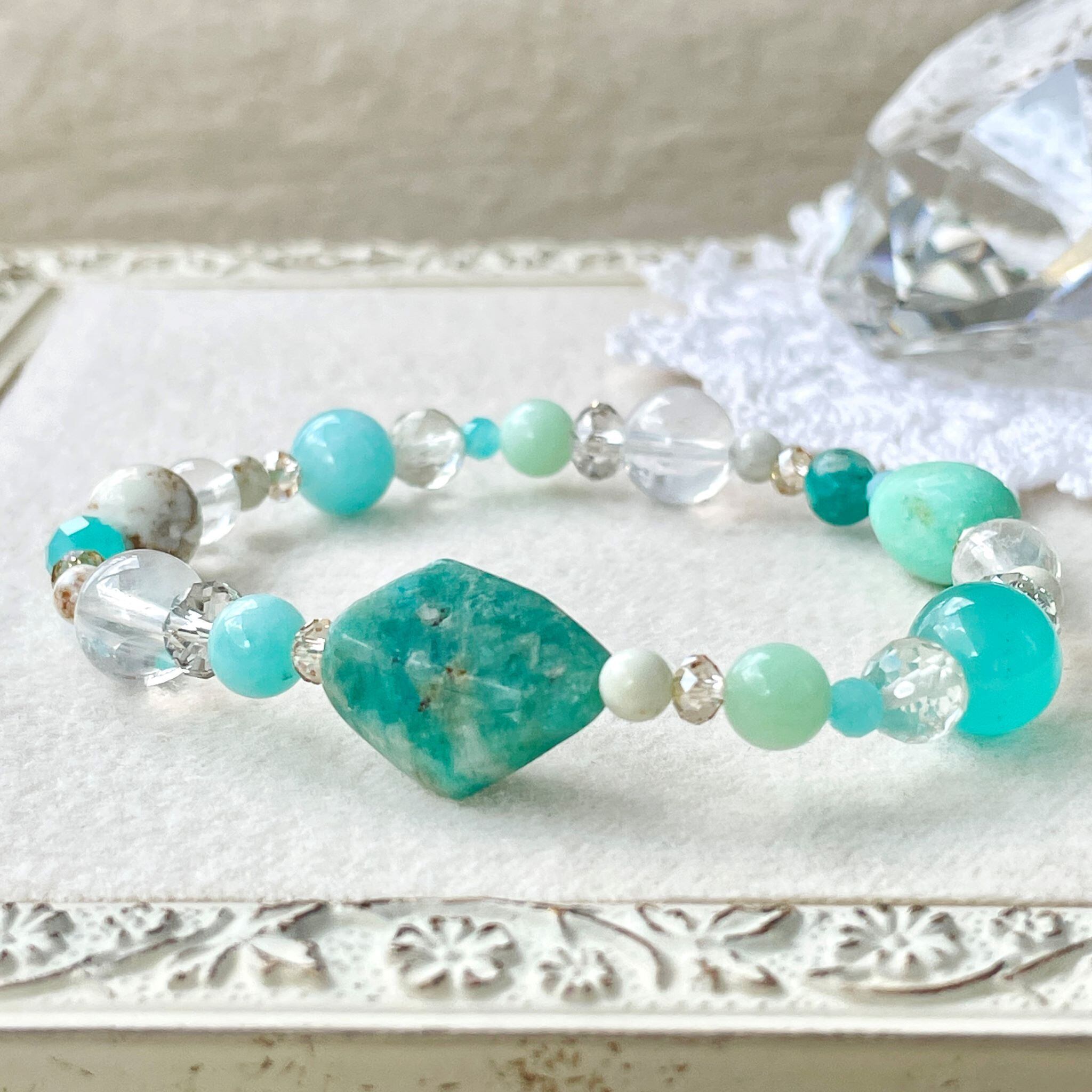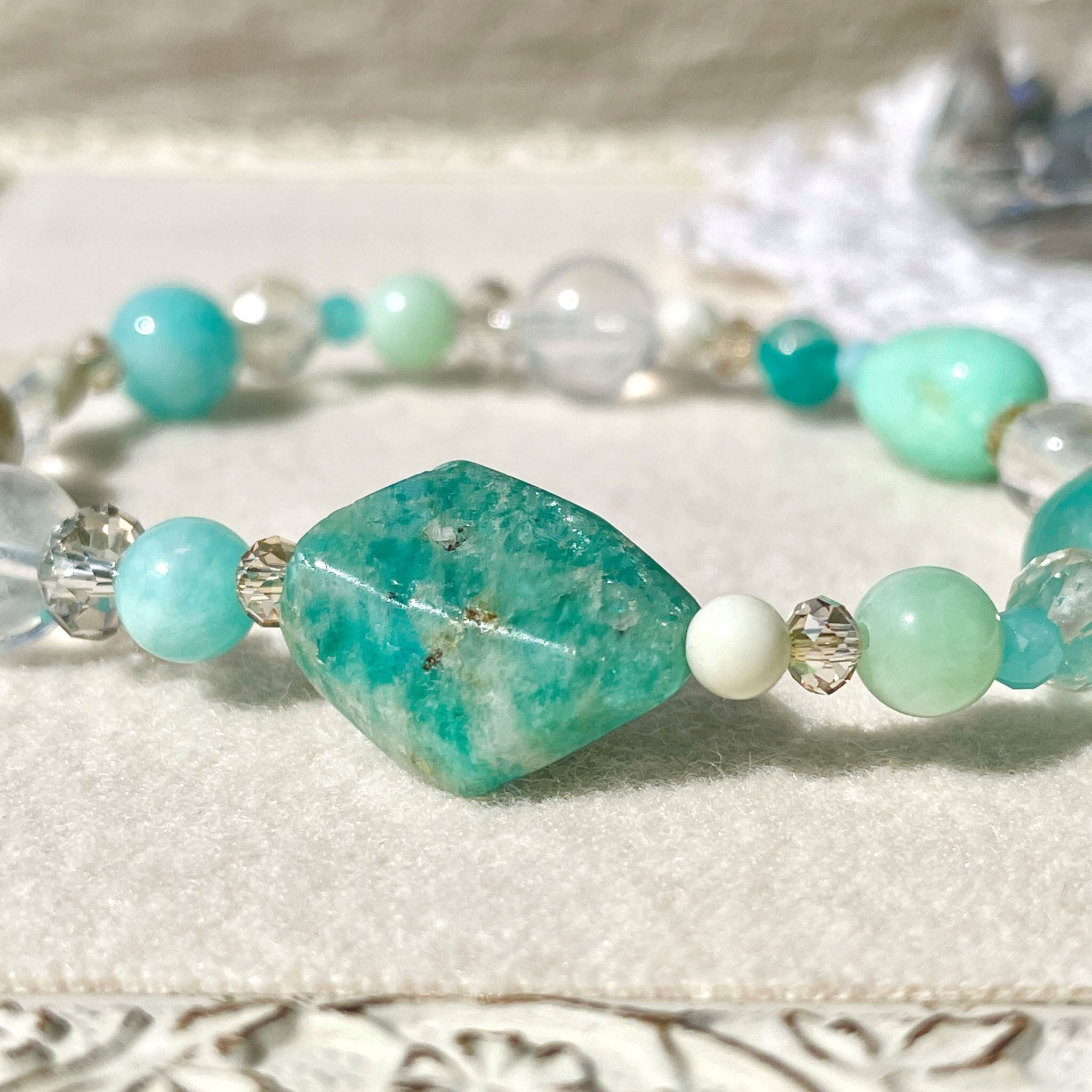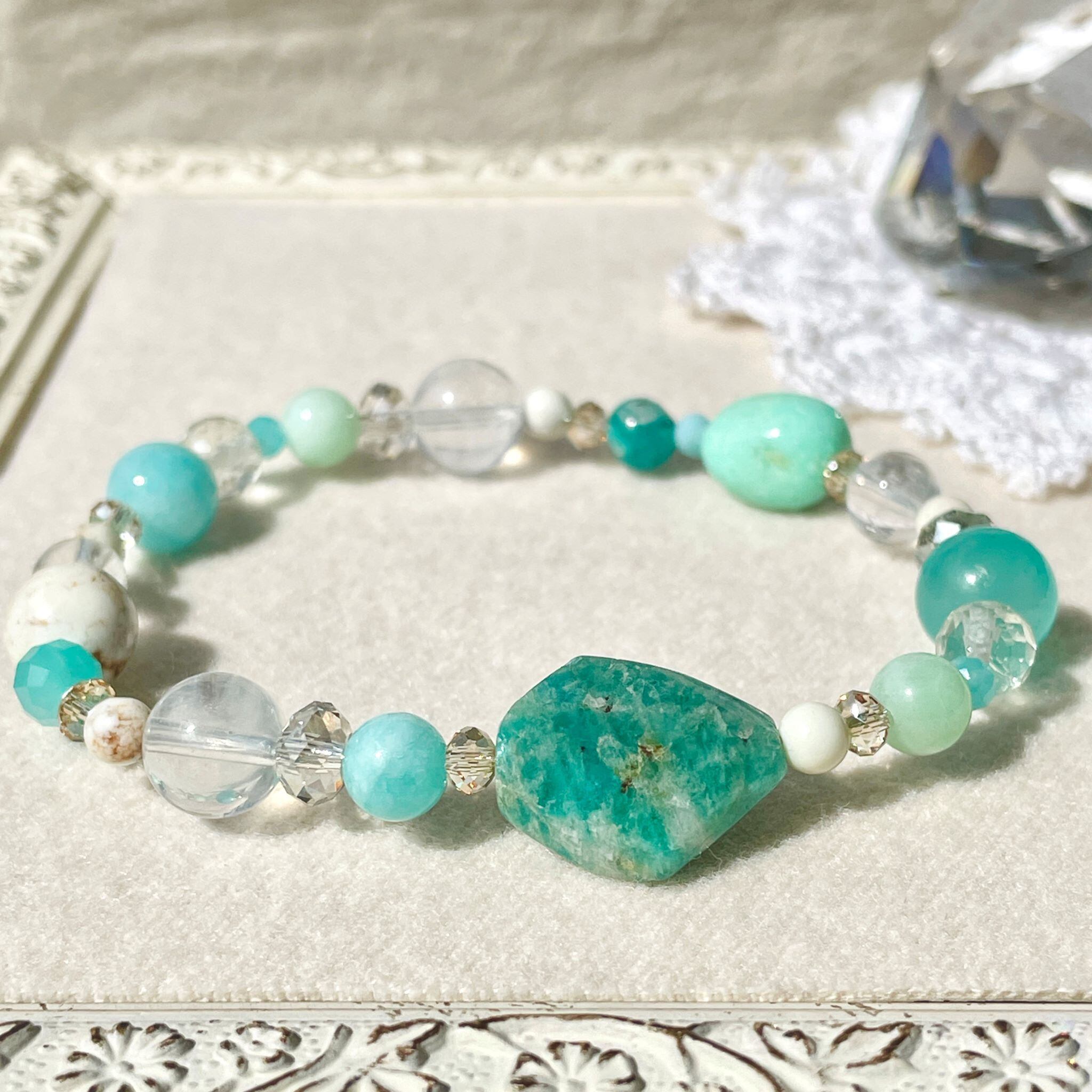 3種のアマゾナイトを中心とした多種の石たちで構成したブレスレットです。