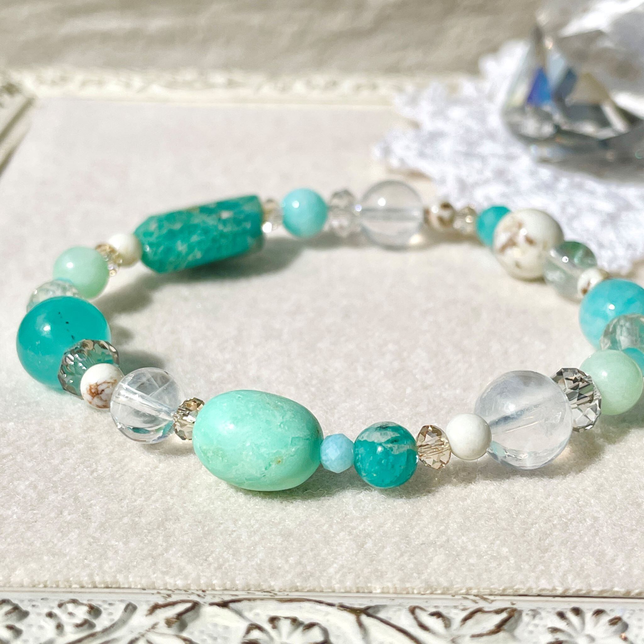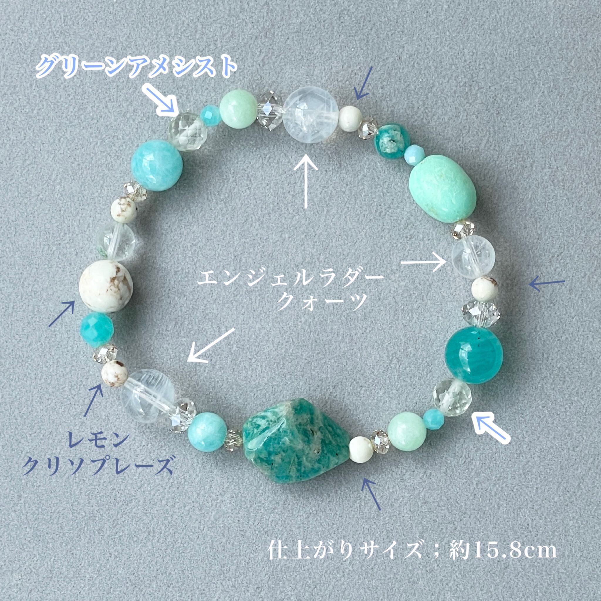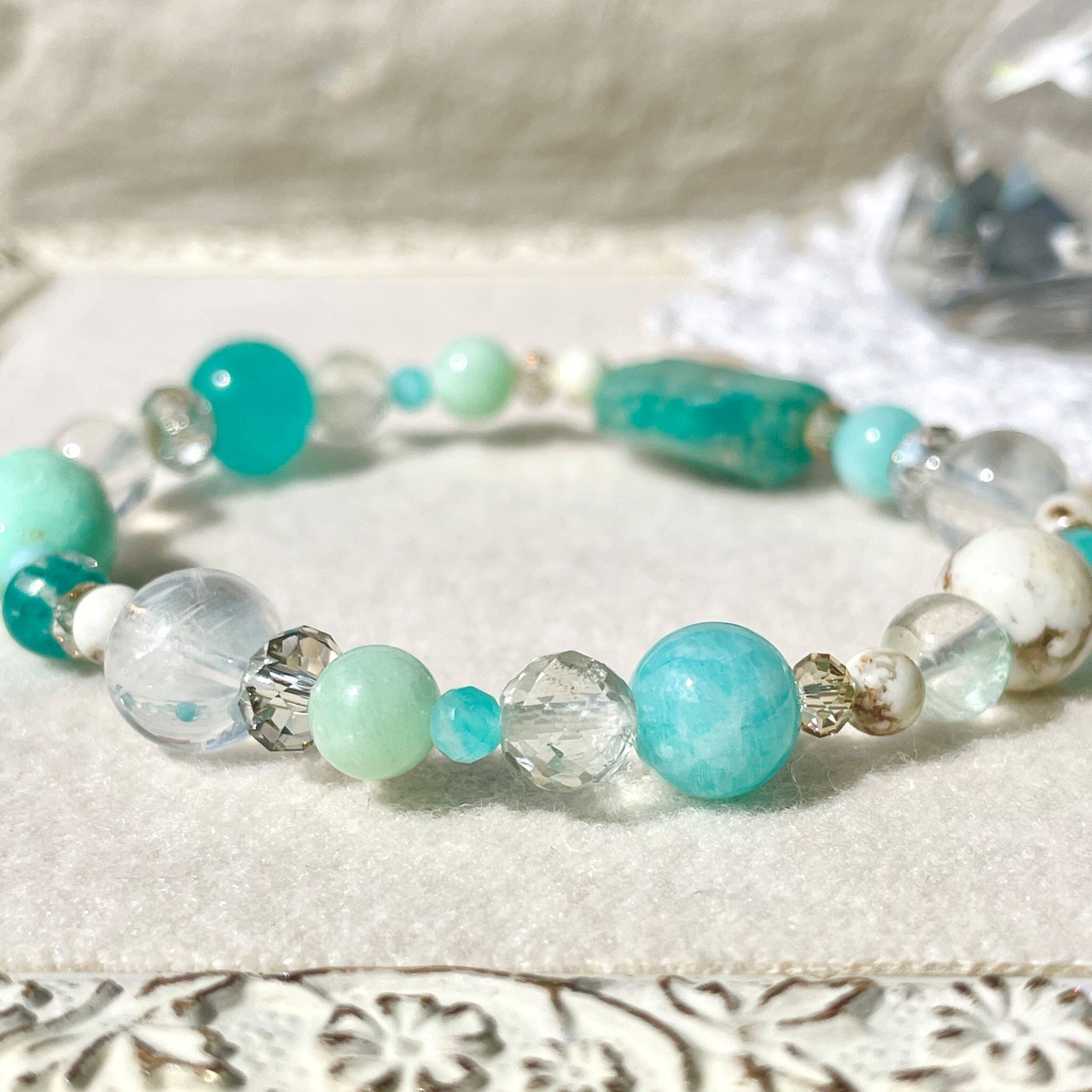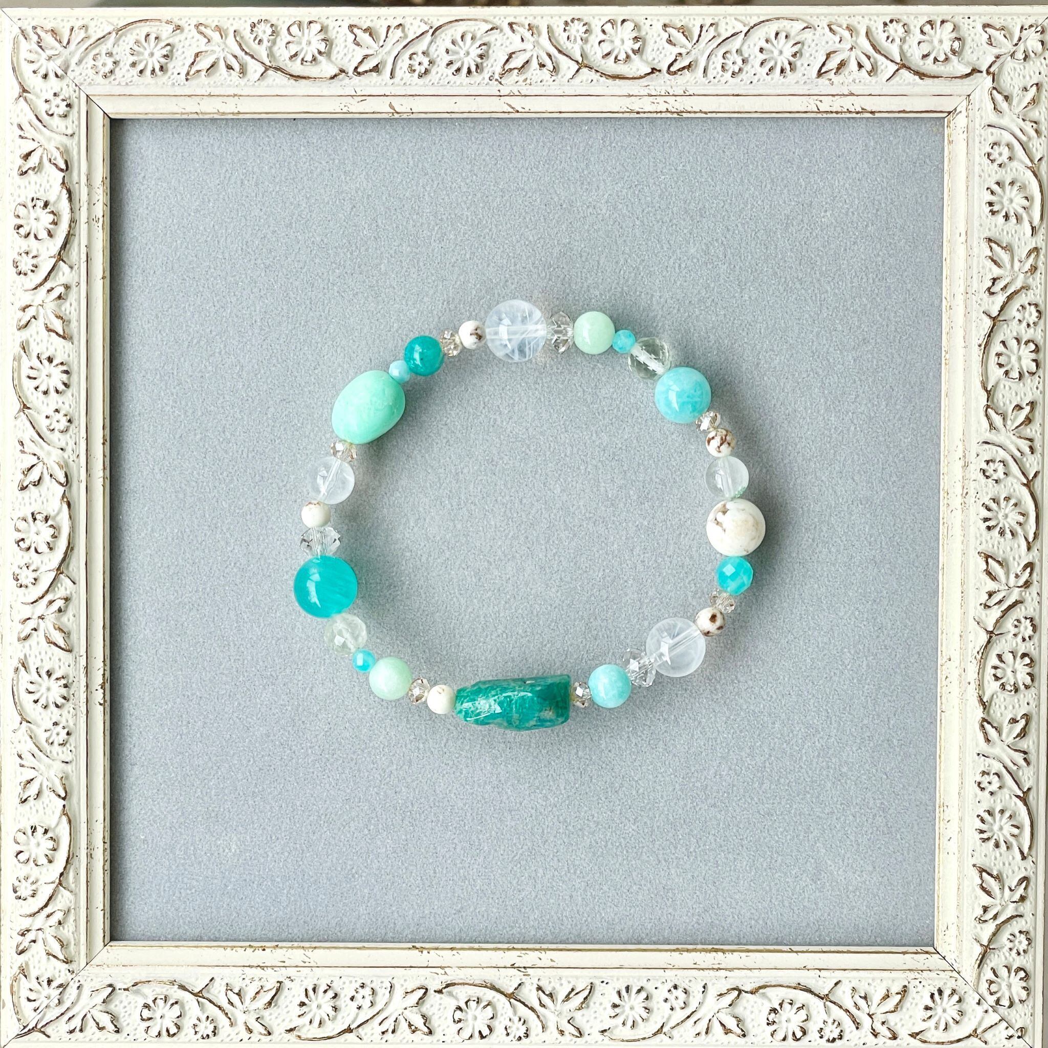 3種のアマゾナイトを中心とした多種の石たちで構成したブレスレットです。