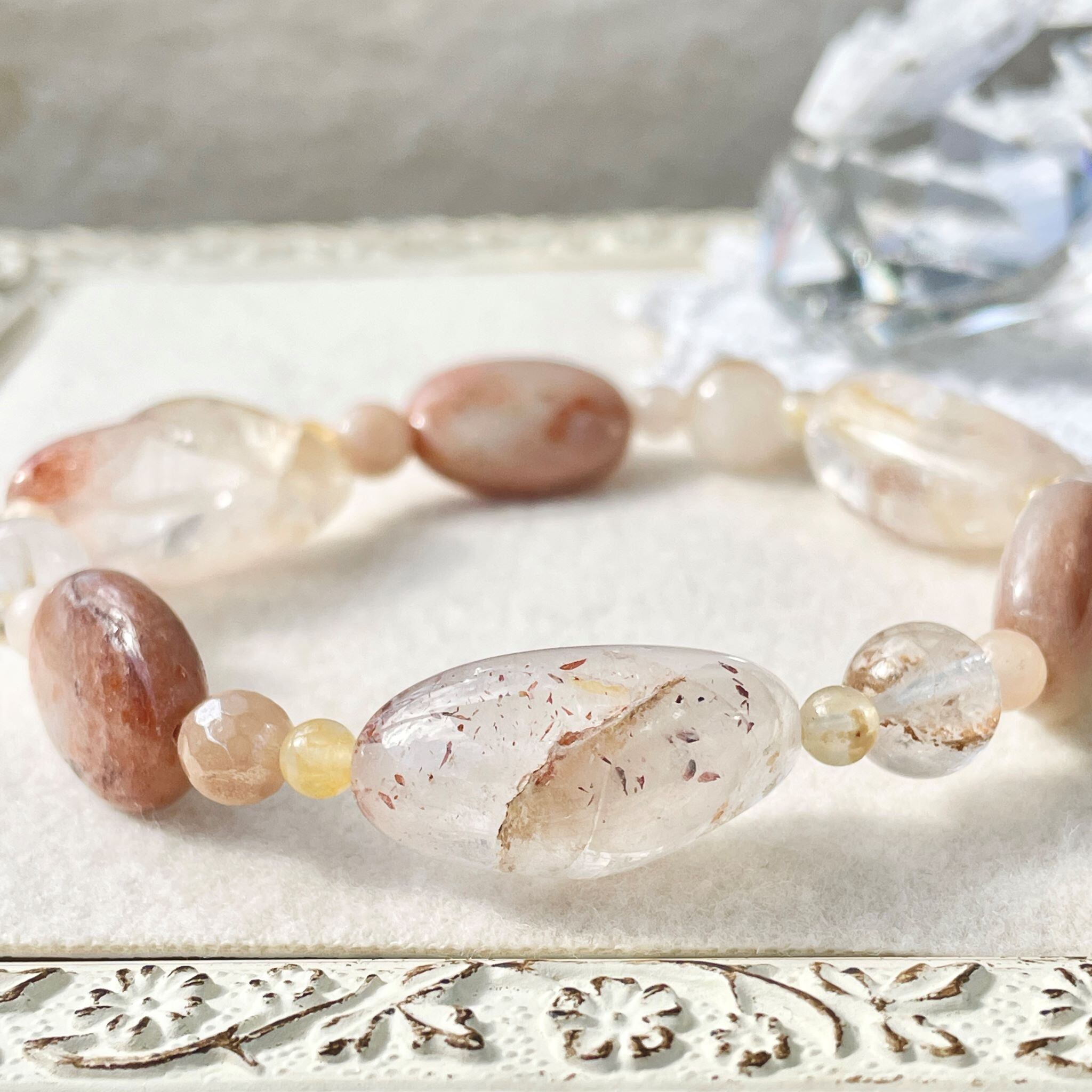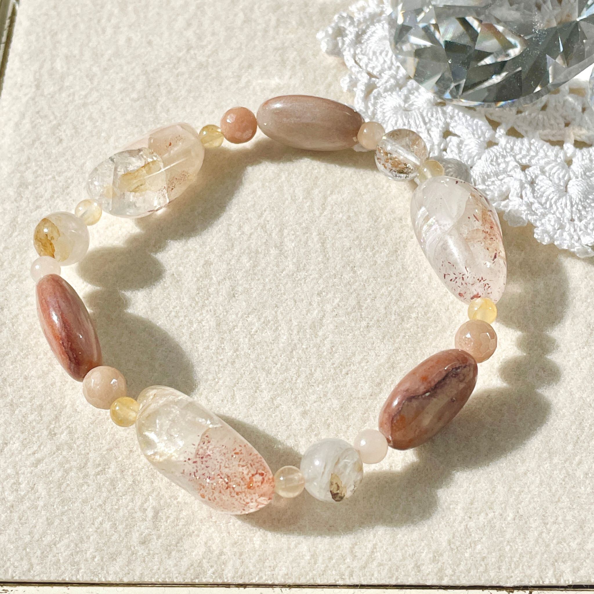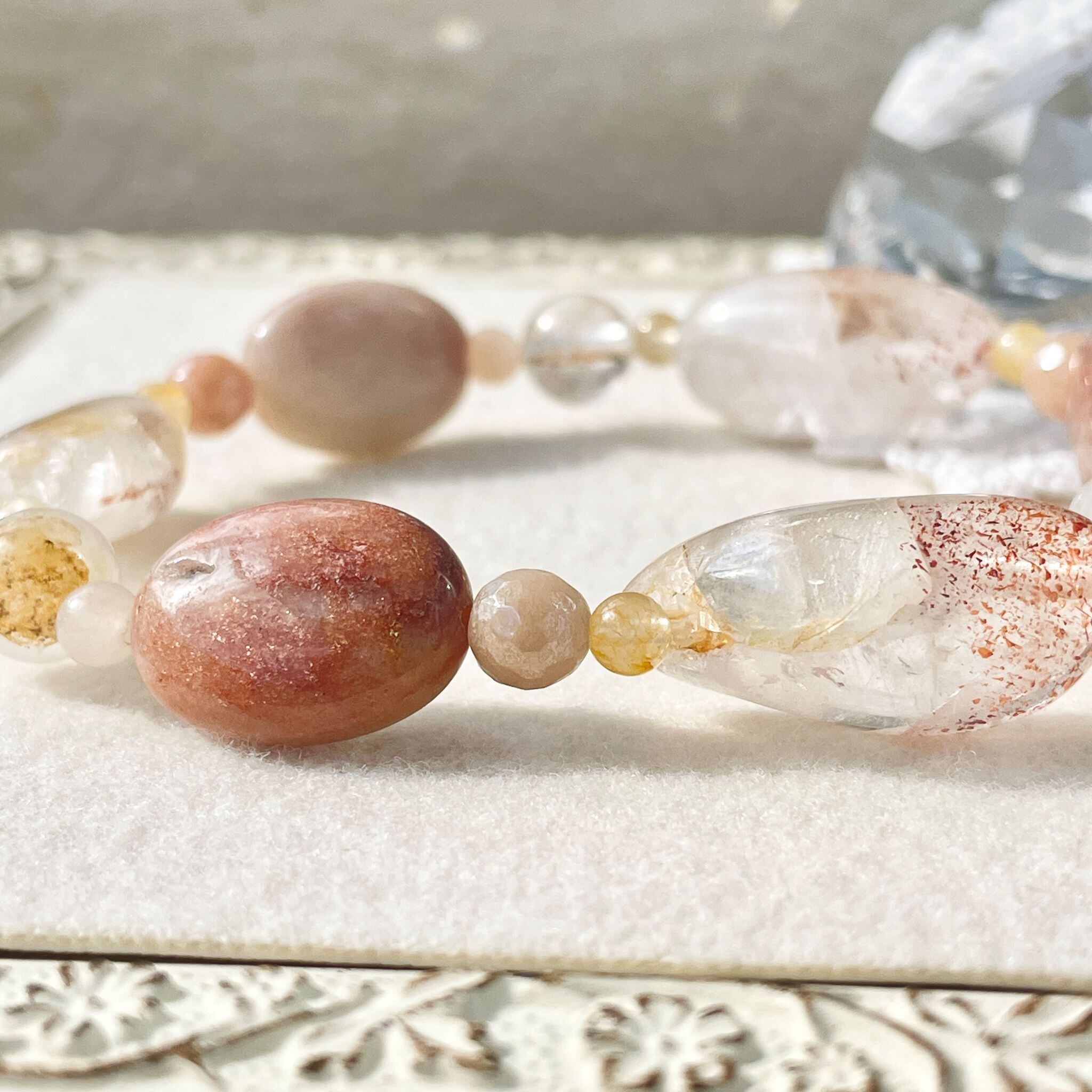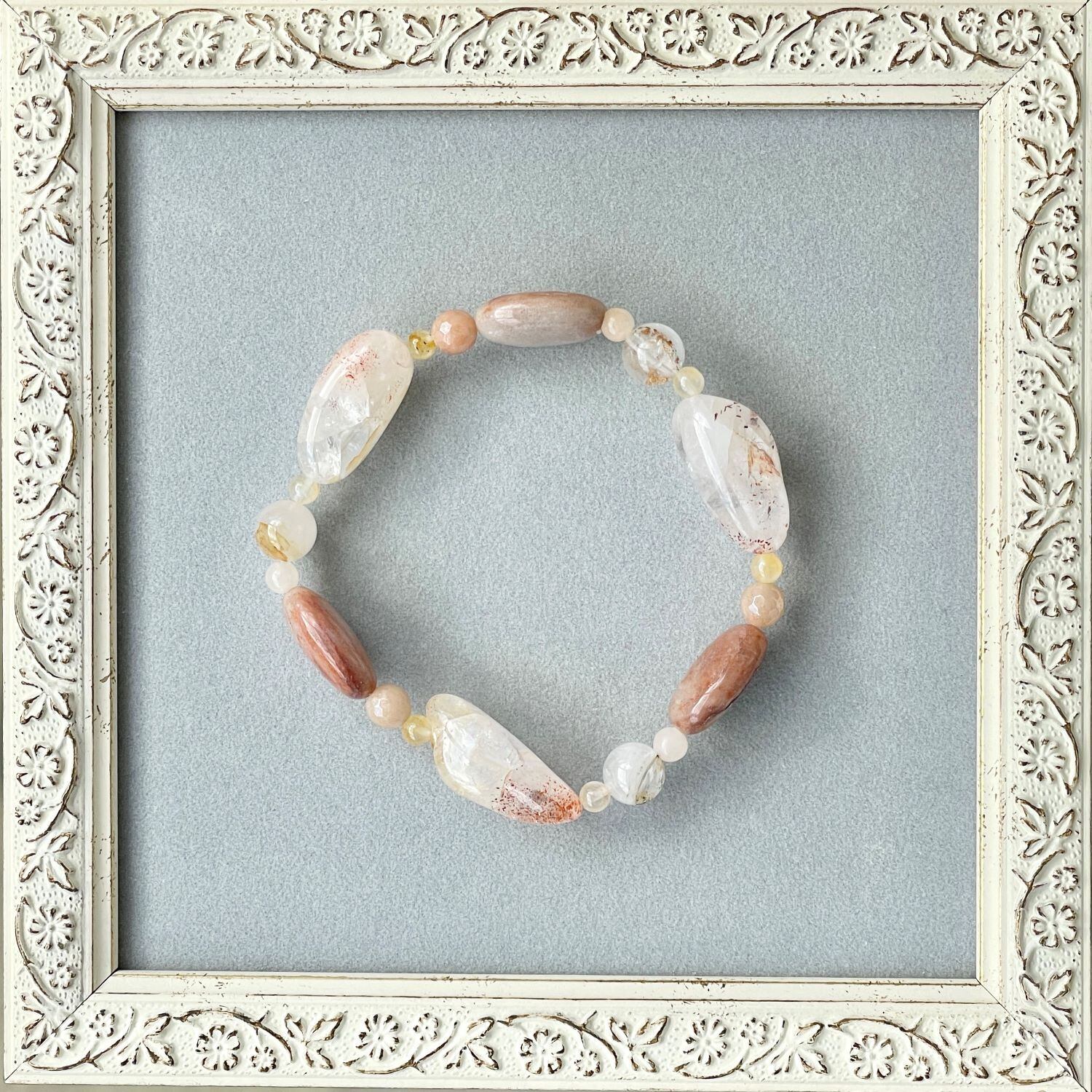 全体的に肌なじみの良いベージュ系色にまとまった柔らかな印象のこのブレスレットは、明るくポジティブでフィジカルに働きかける意味合いを持つ石の組み合わせになりました。