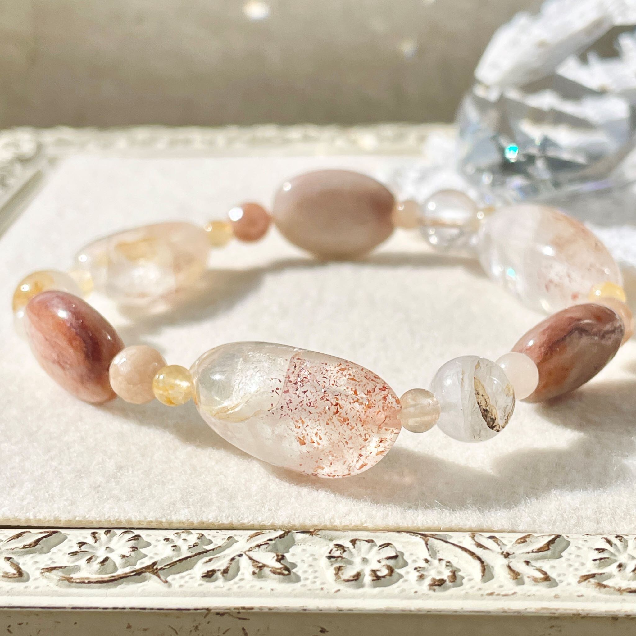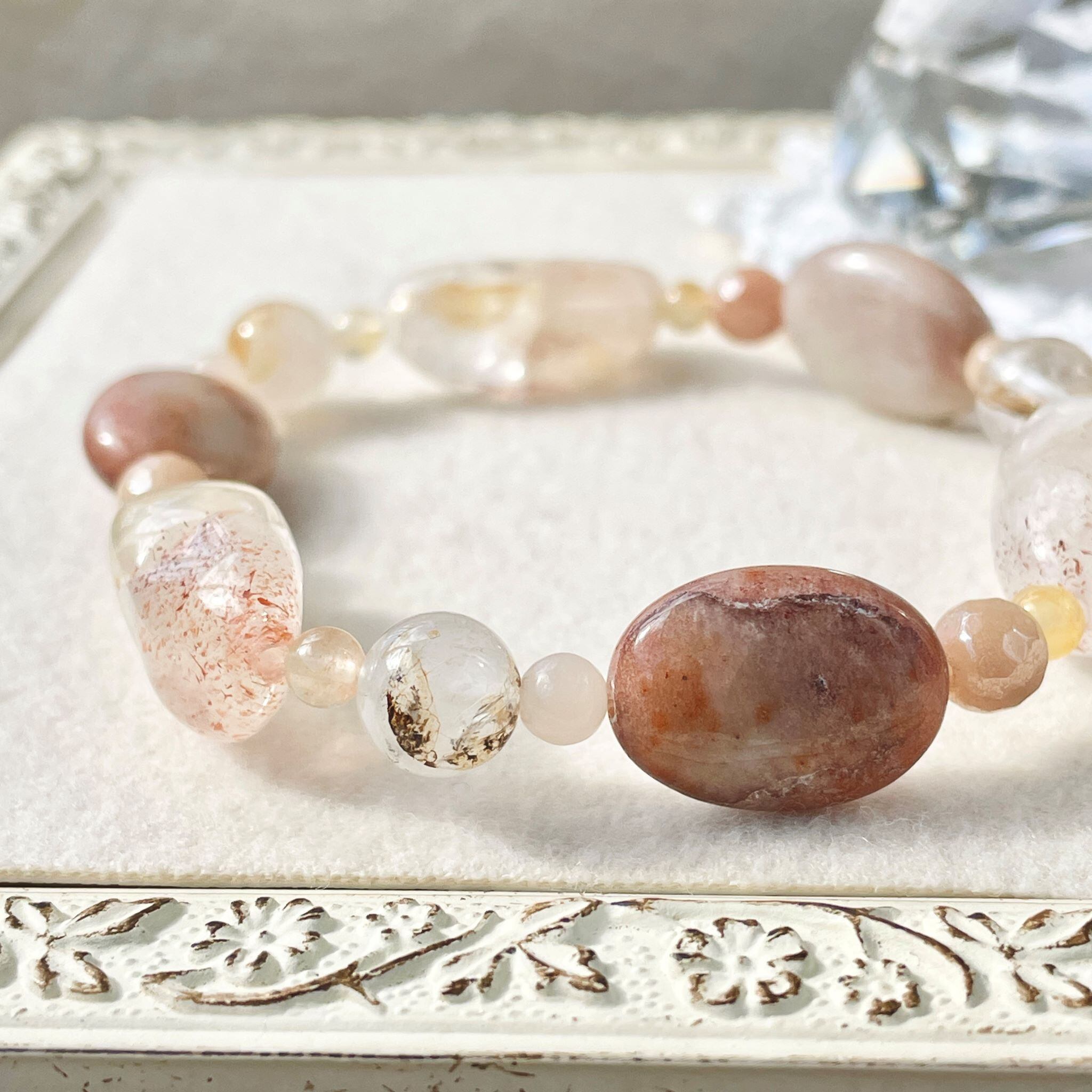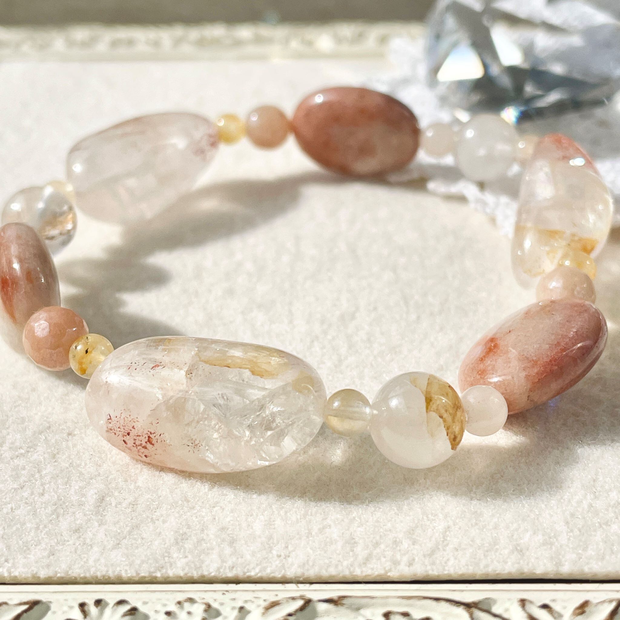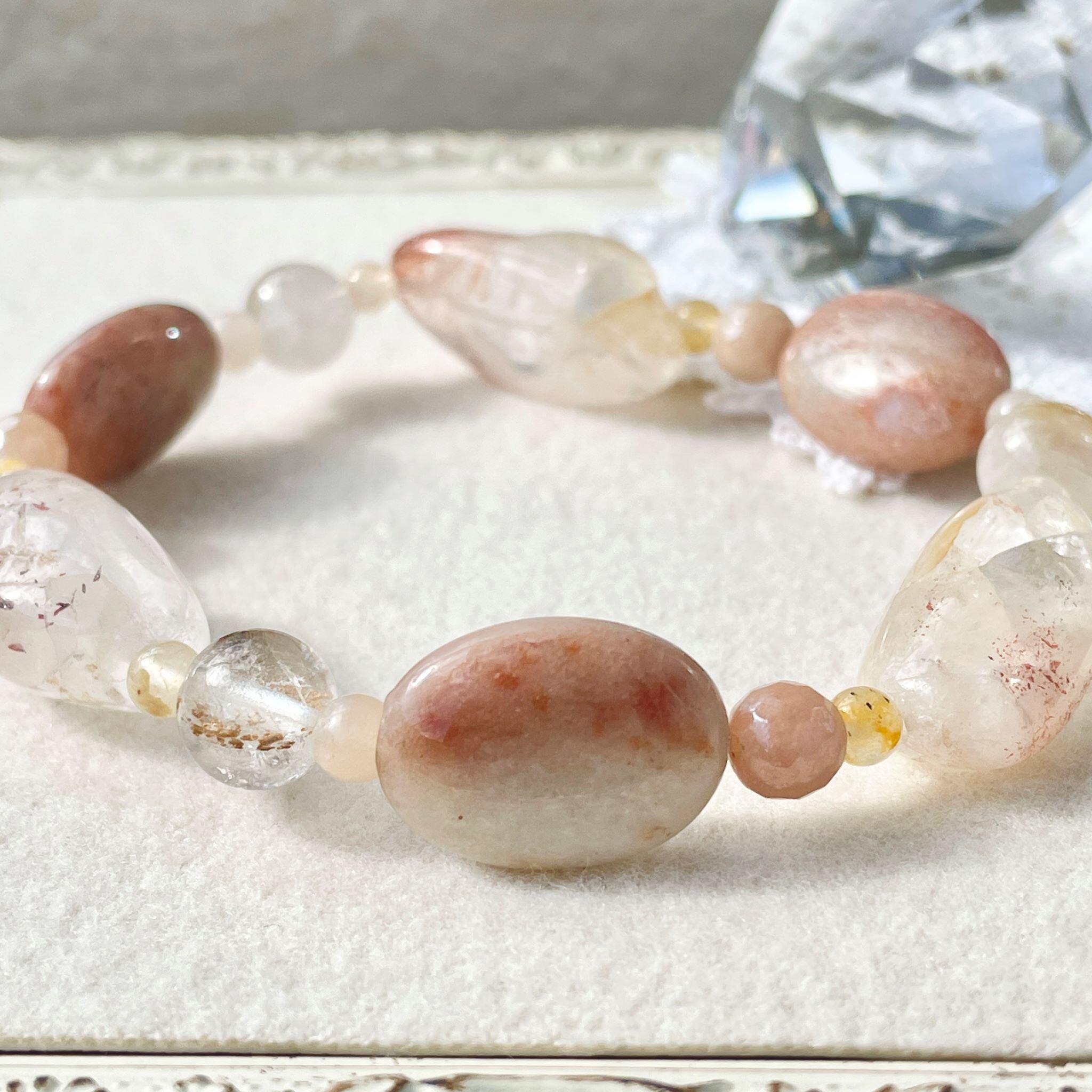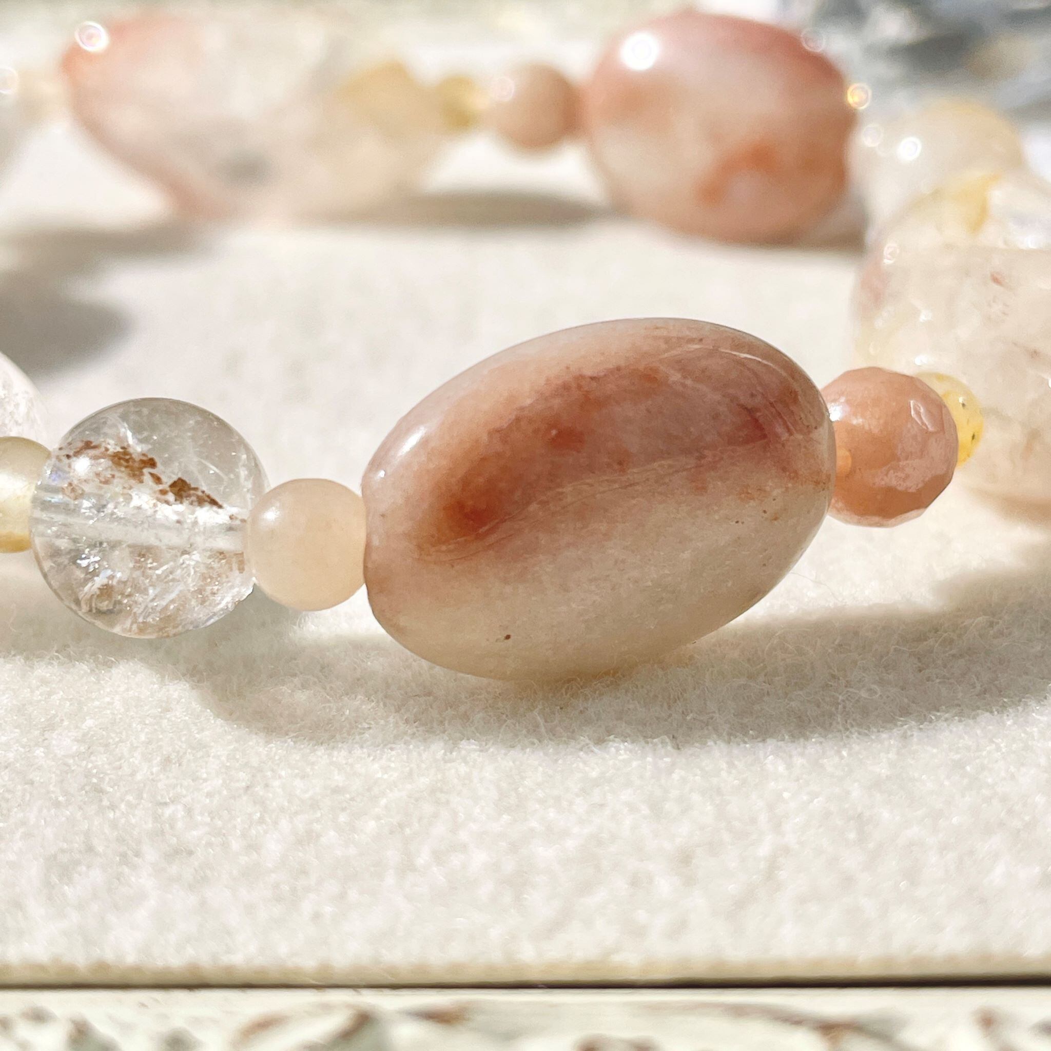 全体的に肌なじみの良いベージュ系色にまとまった柔らかな印象のこのブレスレットは、明るくポジティブでフィジカルに働きかける意味合いを持つ石の組み合わせになりました。