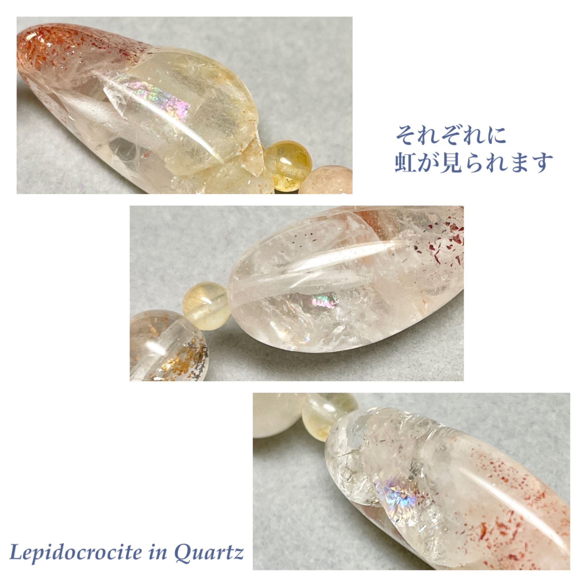 レピドクロサイトinクォーツのイエローの内包物に合わせた4mm玉のイエロークォーツと、ピンクアベンチュリンの4mm玉とで全体を繋ぎました。