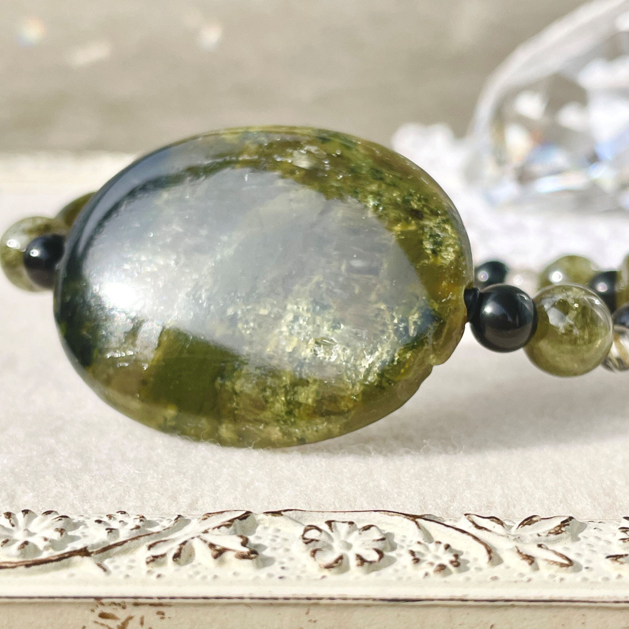 深いグリーンの8mm玉はグリーンガーネットです。